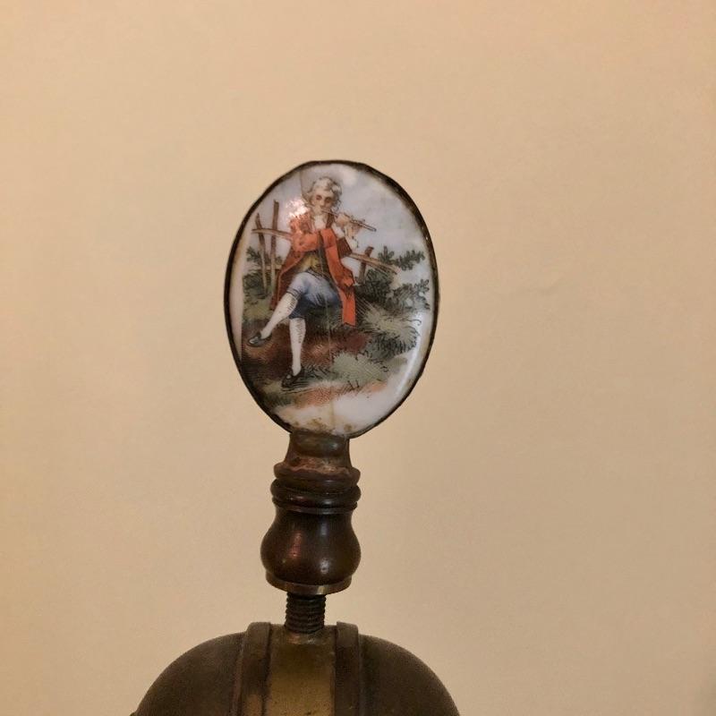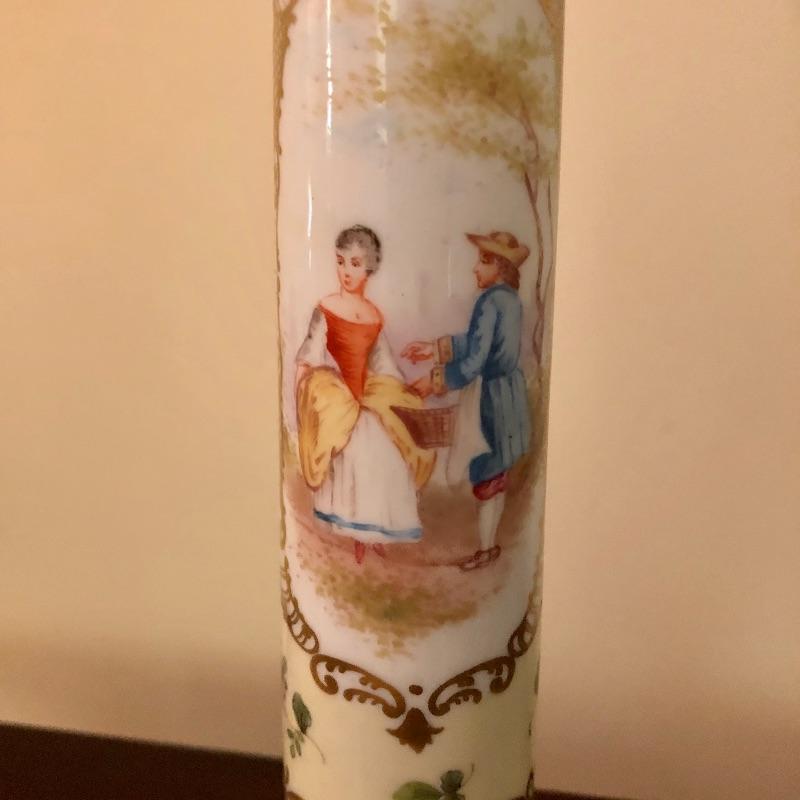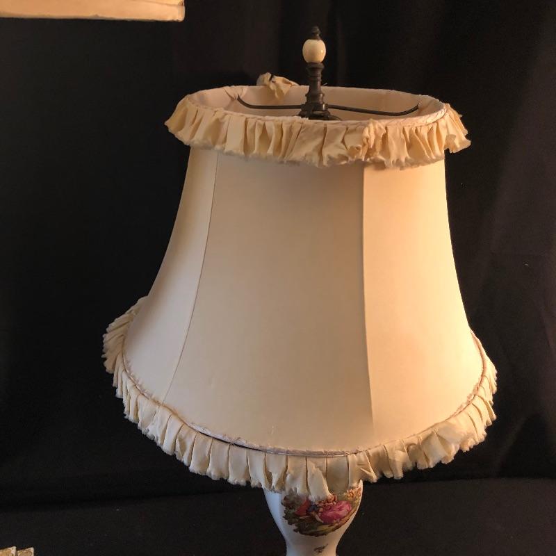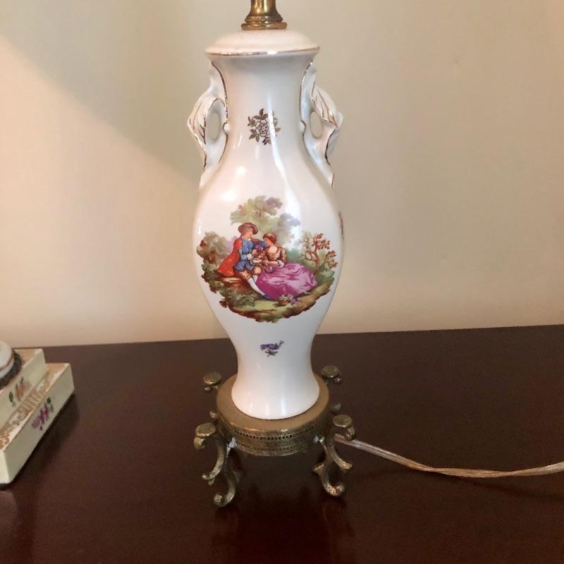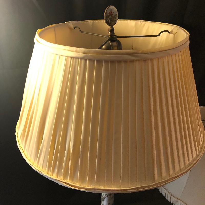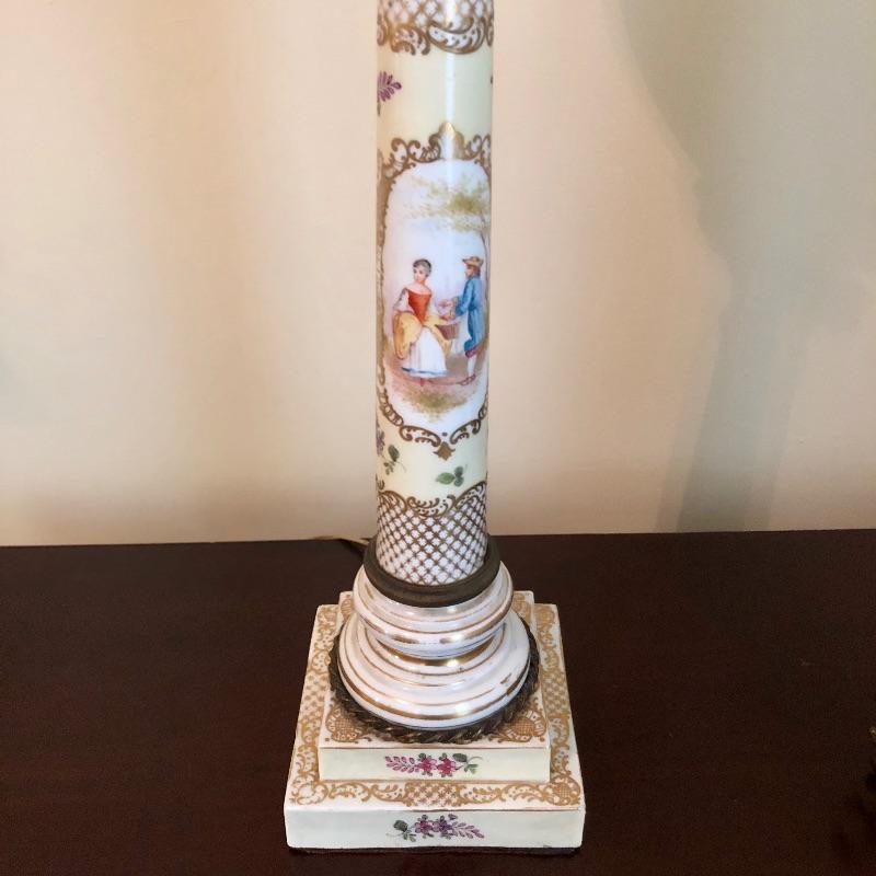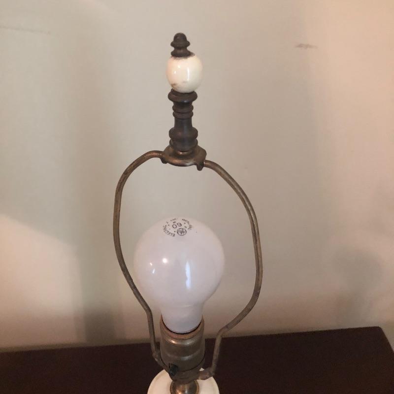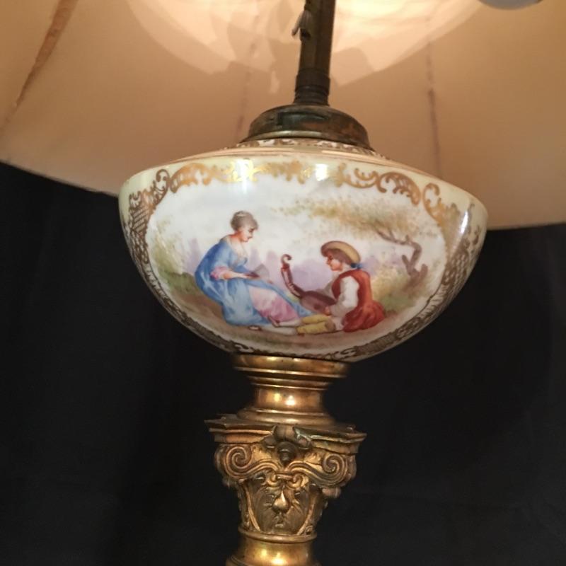 This duo of porcelain and brass lamps are precious. Both shades have seen better days and are probably due for retirement! The taller base measures 36” from base to finial; its porcelain column shaped body is set upon a double plinth coupled with brass elements that makes this an elegant renaissance piece. It houses two independently operated bulbs. The smaller lamp is also made up of porcelain and brass elements with a single bulb. We’ve included a brass stand may not have been originally intended for this lamp but complements it well.