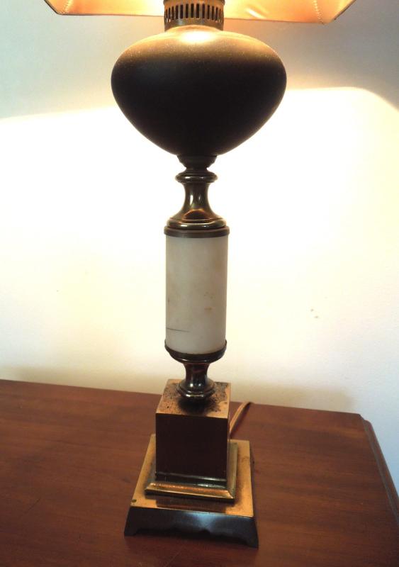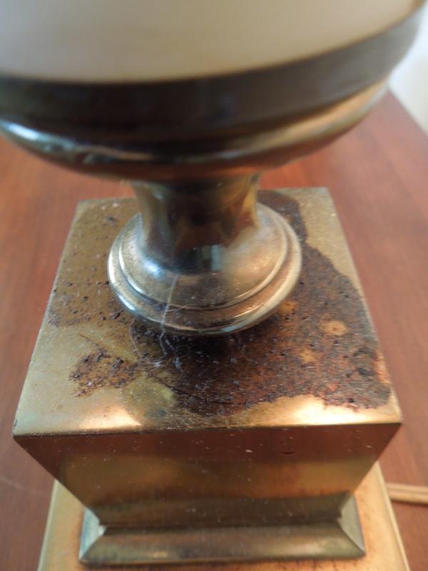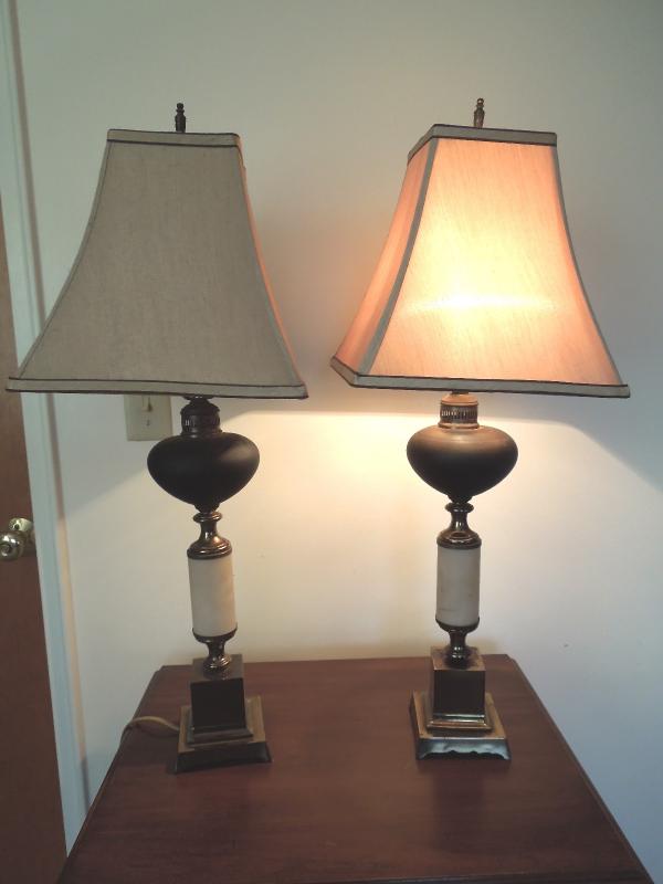 Made by Cambridge Lamp Co. of brass, metal, glass and plastic. Shades are cloth. Sticky substance on one base in picture has been cleaned. Base measures 4" x4". Shade is 29" tall and 11" diameter. Shades are dusty. Cords are older, but not damaged. Stamped Cambridge on underside of brass bass.
