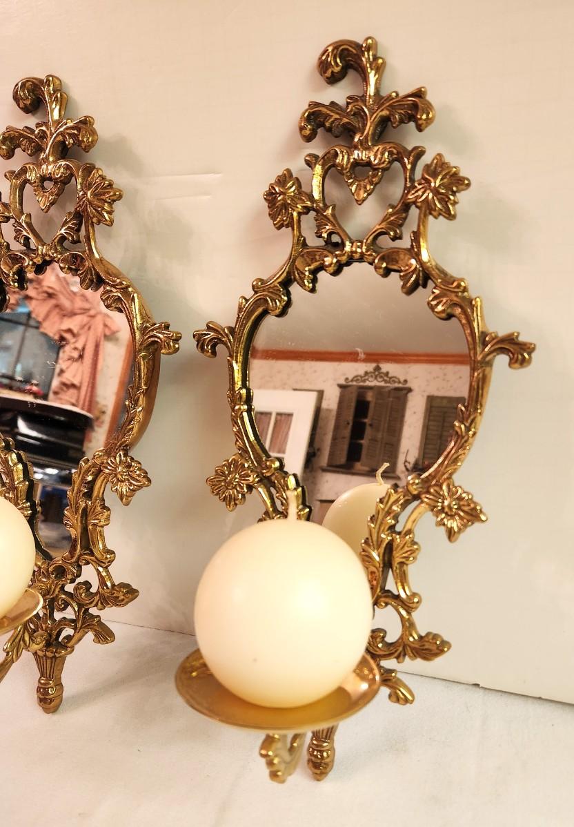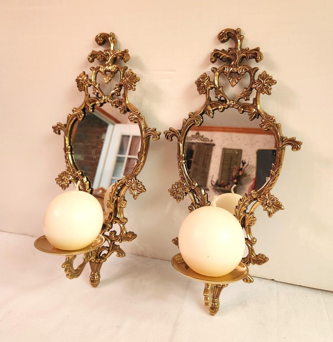 Nice pair of vintage mirrored candle sconces - each 15" tall - lacquered brass. Good condition.