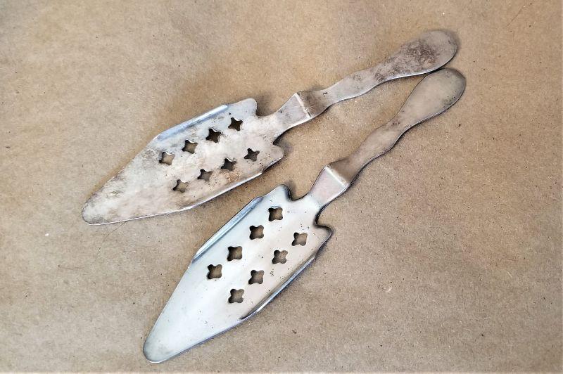 Not so easy to find the old ones! Paid of French Absinthe Spoons - designed to fit over the glass and hold the cubed sugar. Cold water drips down into the liquor through the slots and gives it that famous green, hazy effect. These were probably used in a French restaurant or bar, ca. 1940's. Each measures about 6.5 inches long.
