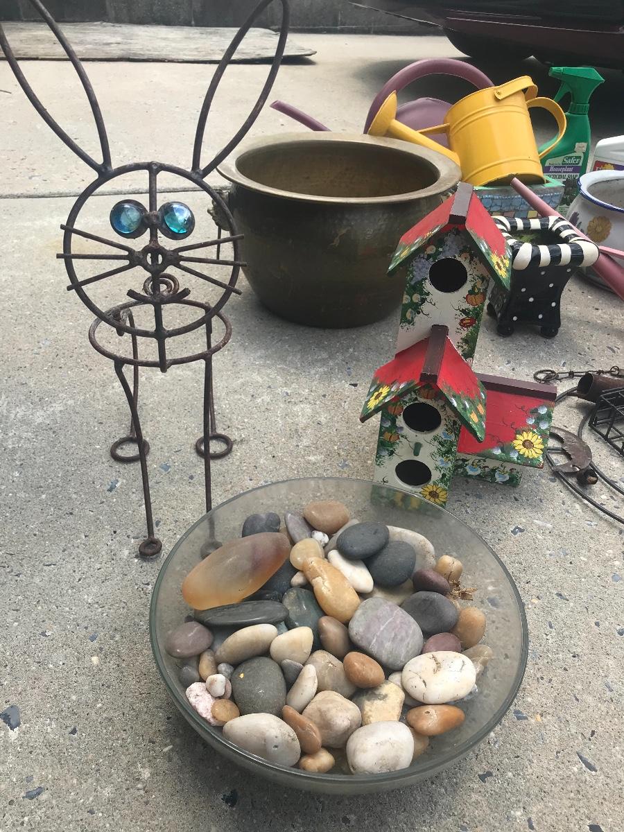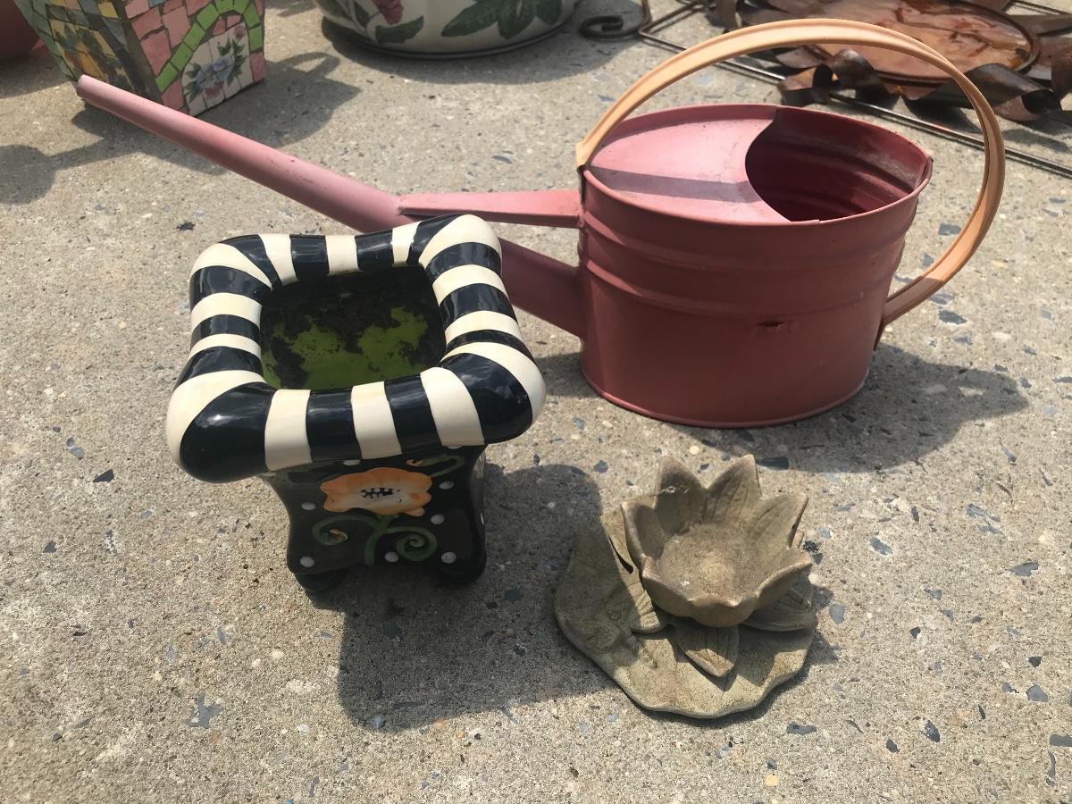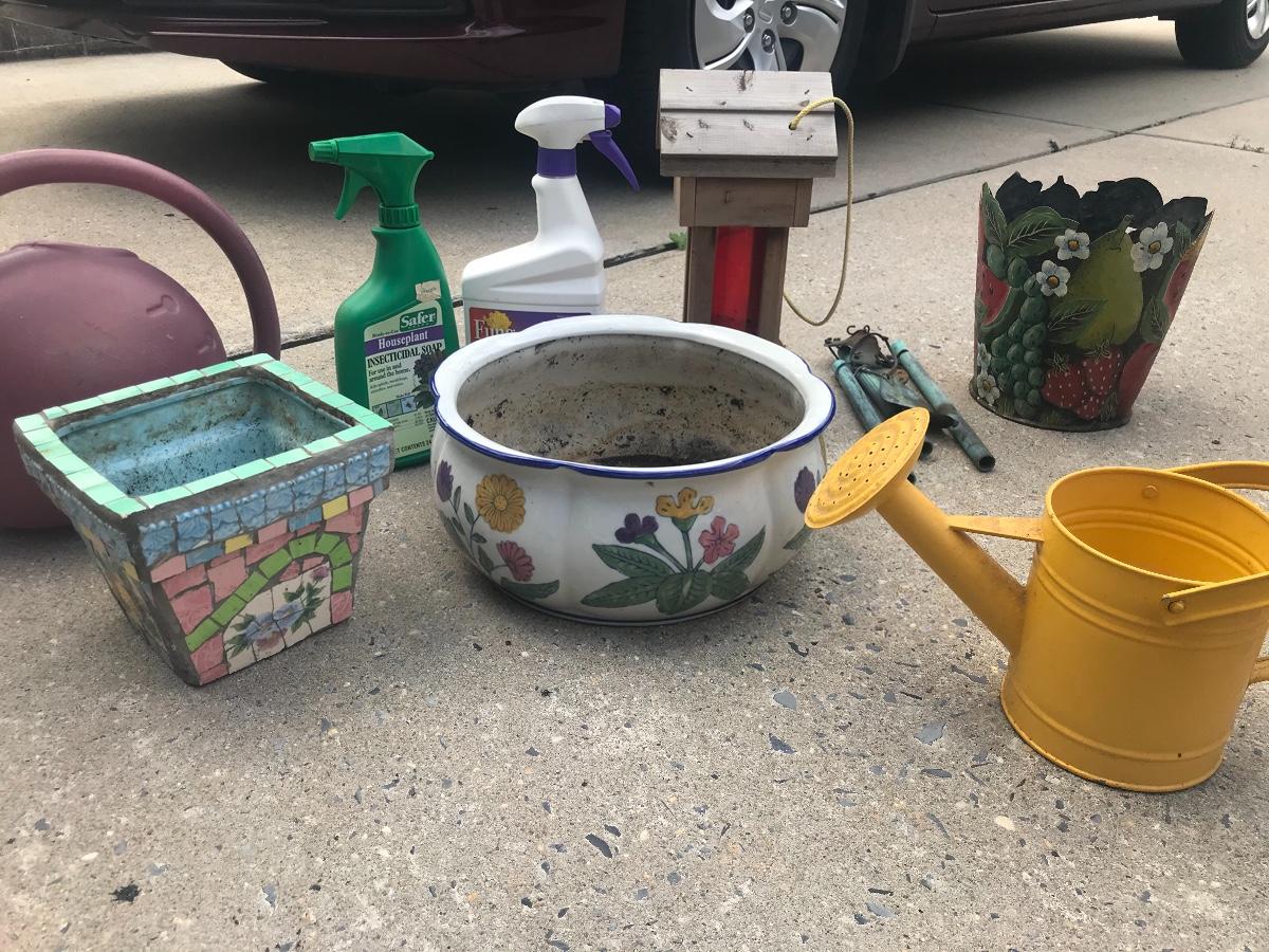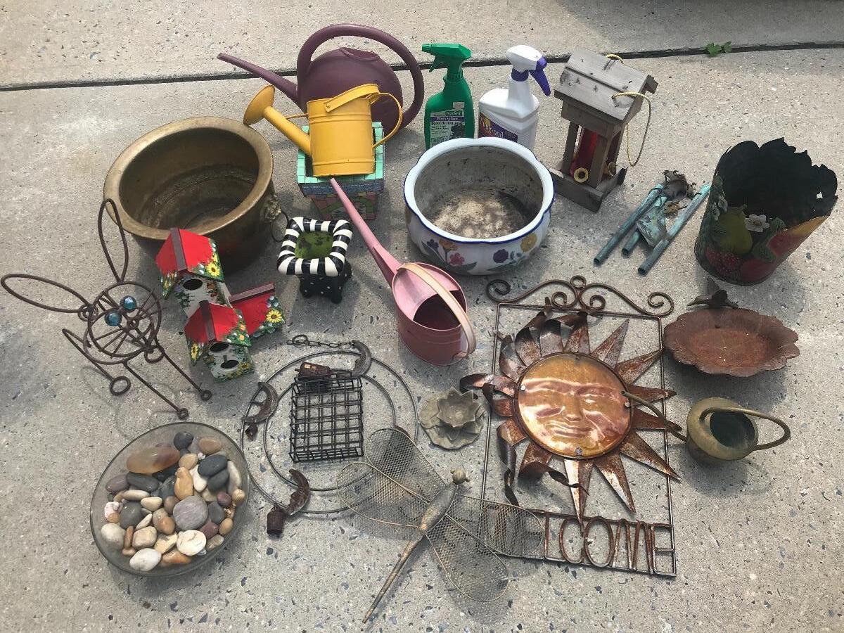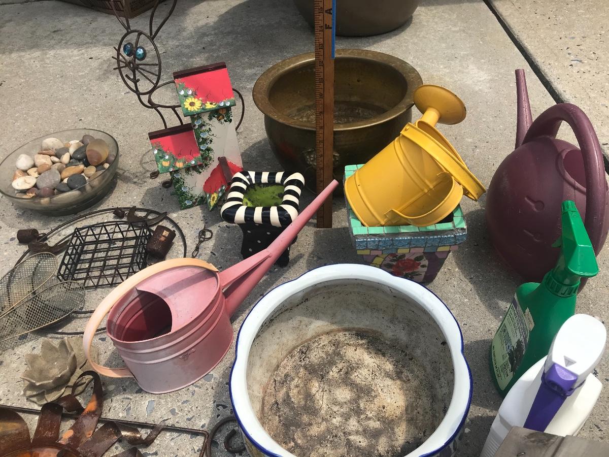 Brass and ceramic planters, bird feeders, brass, metal and plastic watering cans, chimes, mosaic flower pot, rusty garden decor, and more. Please see all pictures for content of the lot, condition of the lot, and measurements if taken. Pictures are the best representation of the items listed and items are untested unless indicated in description. Thank you for looking and have fun bidding!