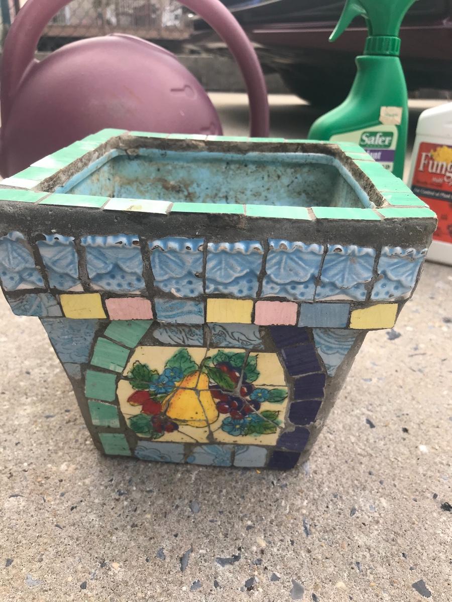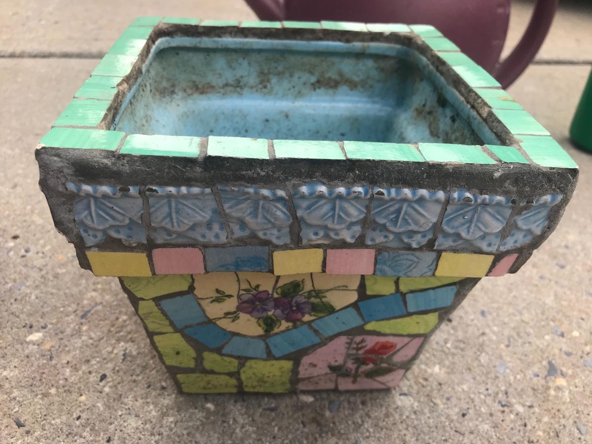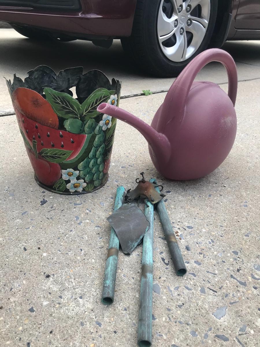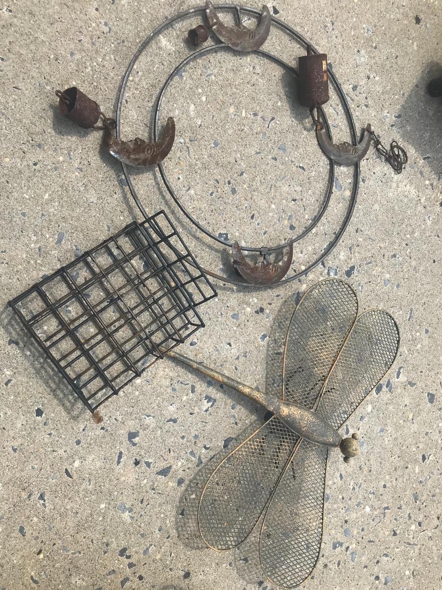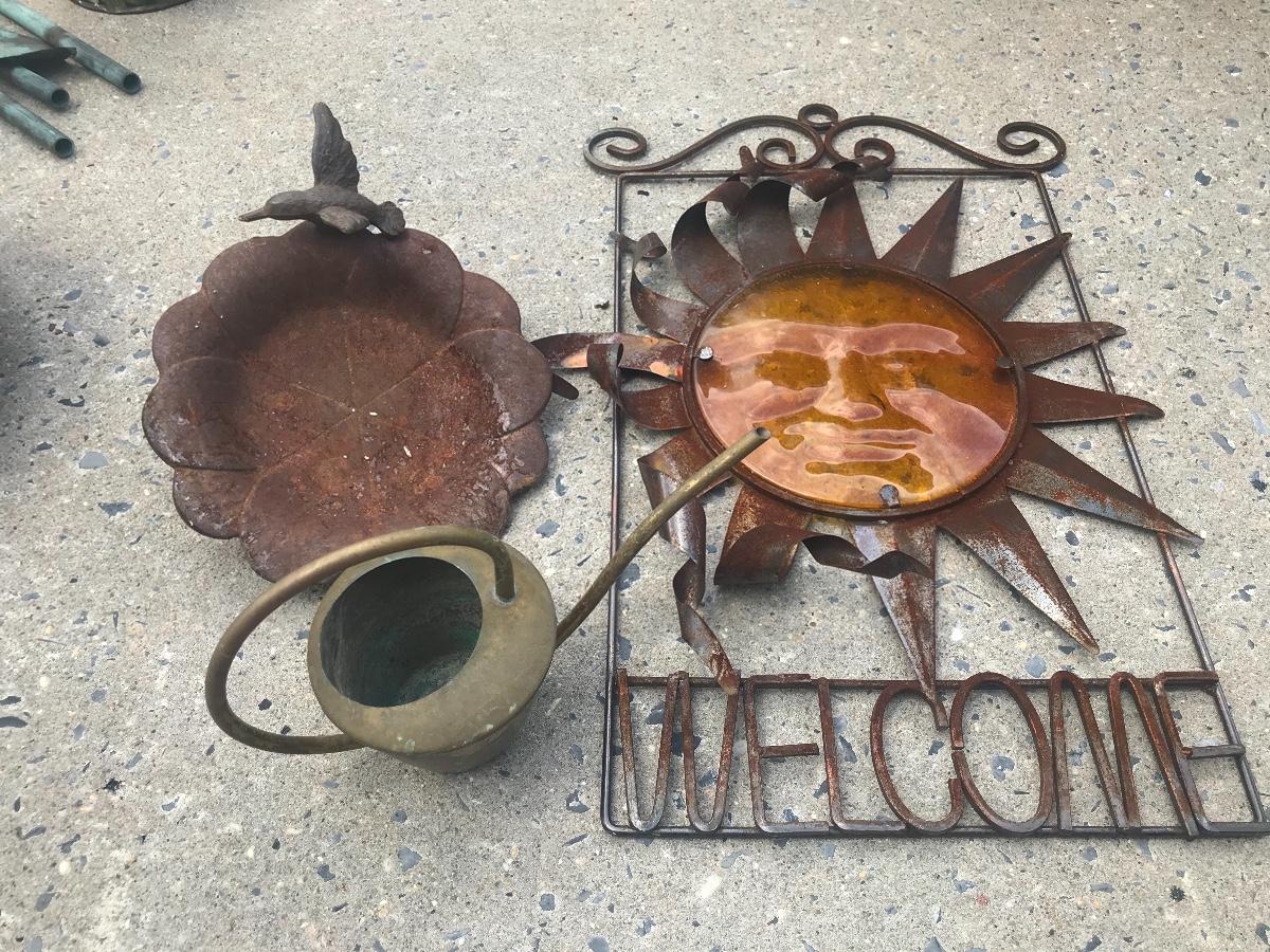 Brass and ceramic planters, bird feeders, brass, metal and plastic watering cans, chimes, mosaic flower pot, rusty garden decor, and more. Please see all pictures for content of the lot, condition of the lot, and measurements if taken. Pictures are the best representation of the items listed and items are untested unless indicated in description. Thank you for looking and have fun bidding!