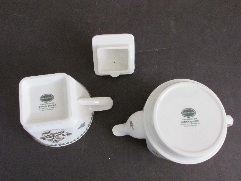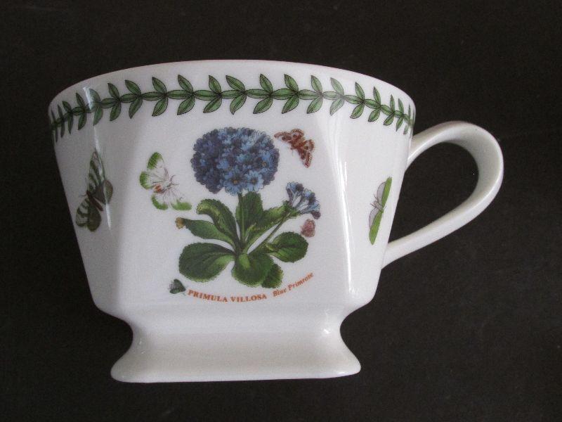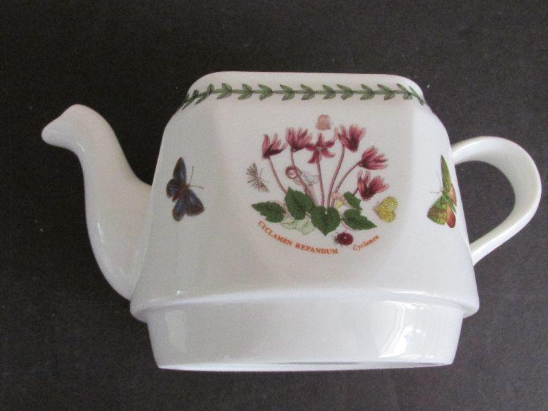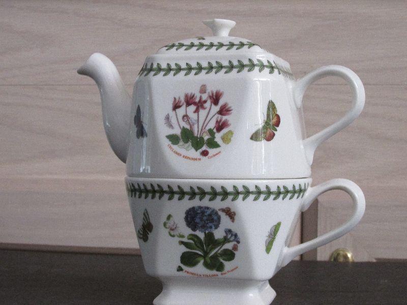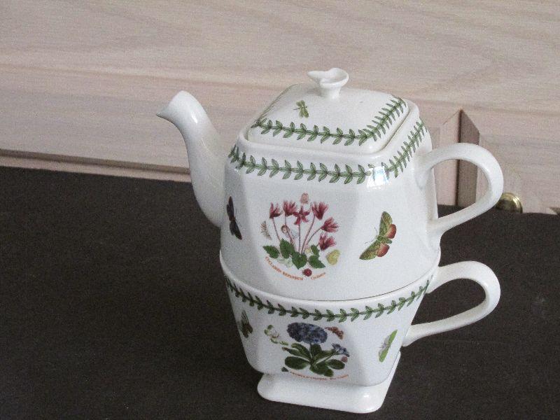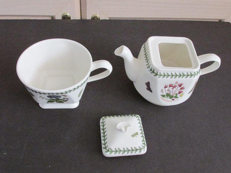 Portmeirion Botanic Garden two part teapot and cup. Bottom cup the Primula Villosa (Blue Primrose) design. Teapot is Cyclamen Repandum design. No chips or cracks. Has only ever been used for display.