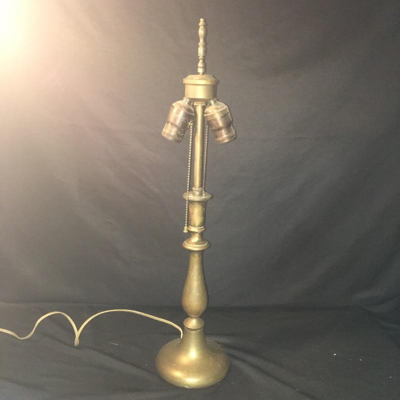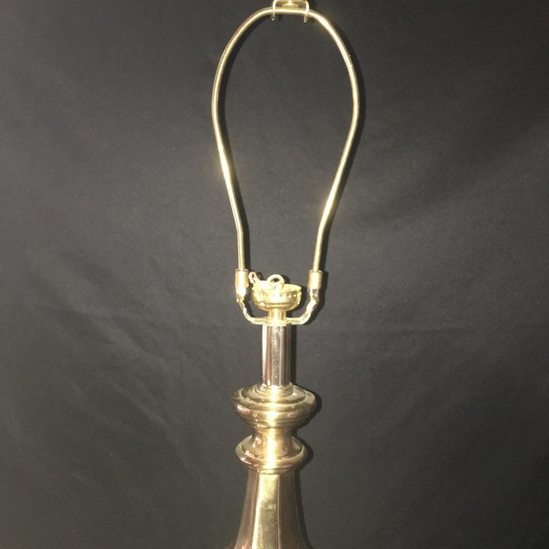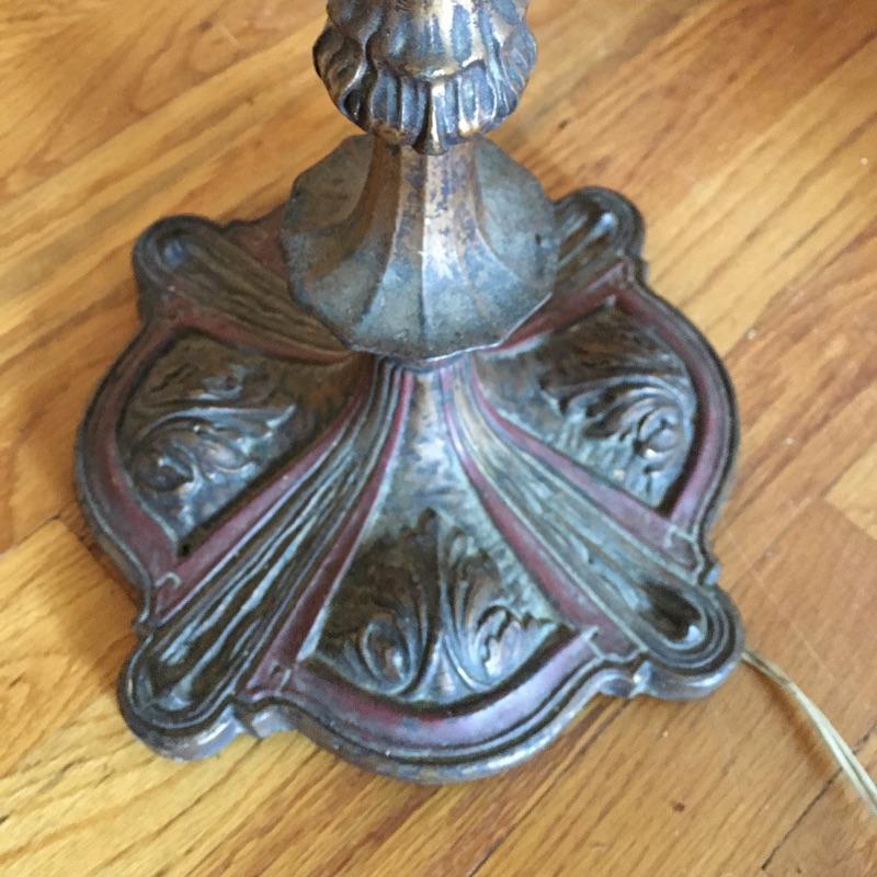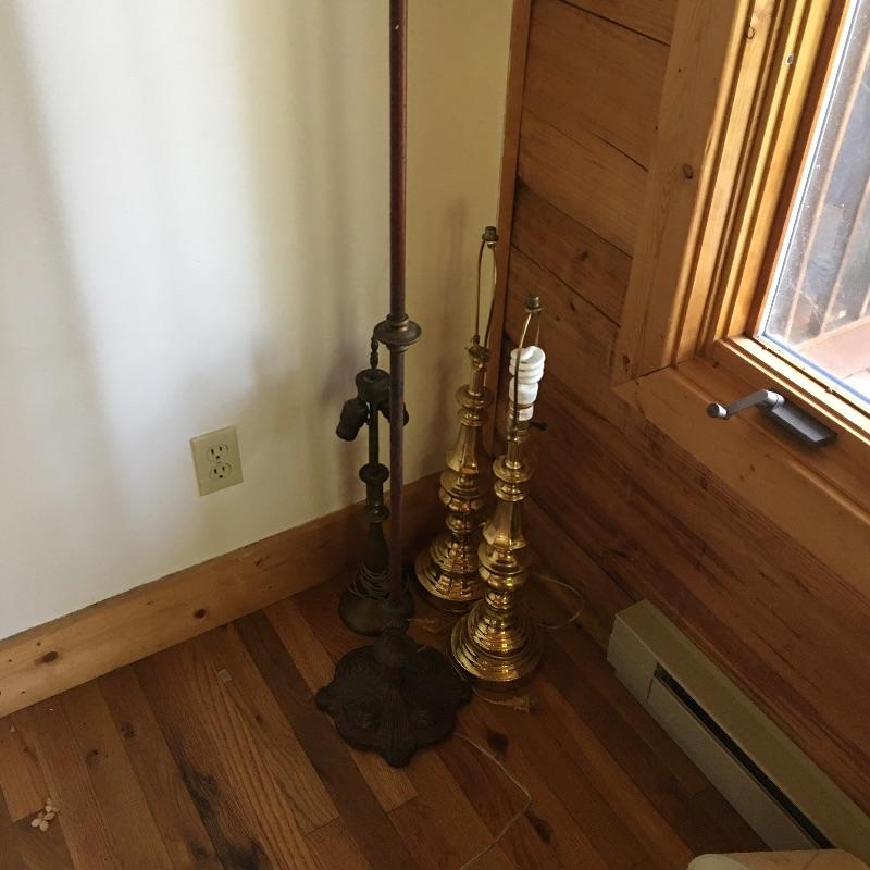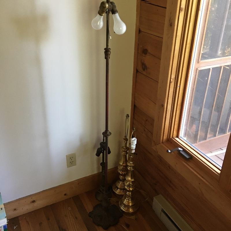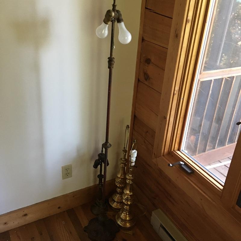 This beautiful Brass lamp signed Rostand has two lightbulb sockets with pull chains and worked when tested. Also includes a pair of matching brass lamps that measure 6”D x 28” tall and a metal floor lamp that has two lightbulb sockets and measures 10” x 10” base and 60” tall. One of the Lamps is missing lightbulb socket, the other worked when tested.