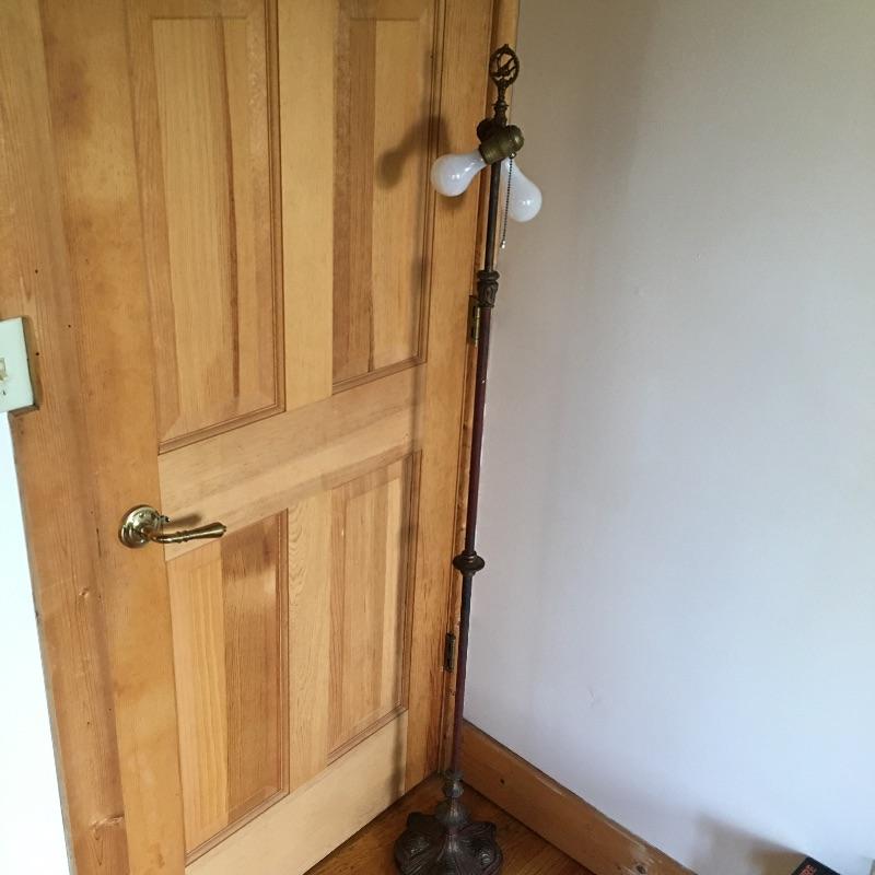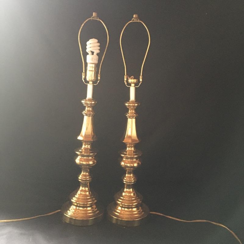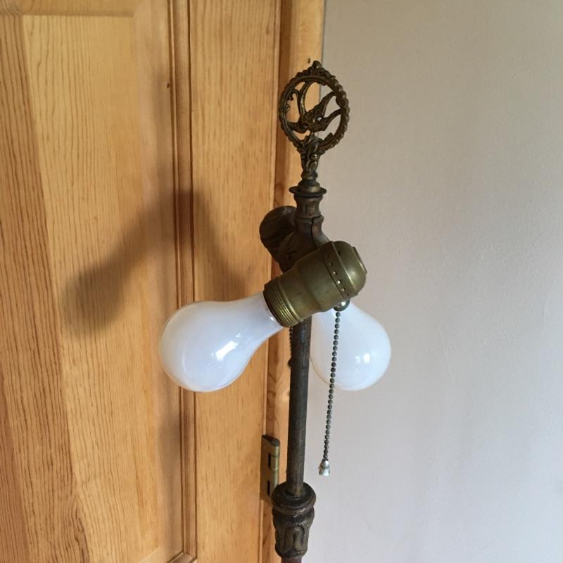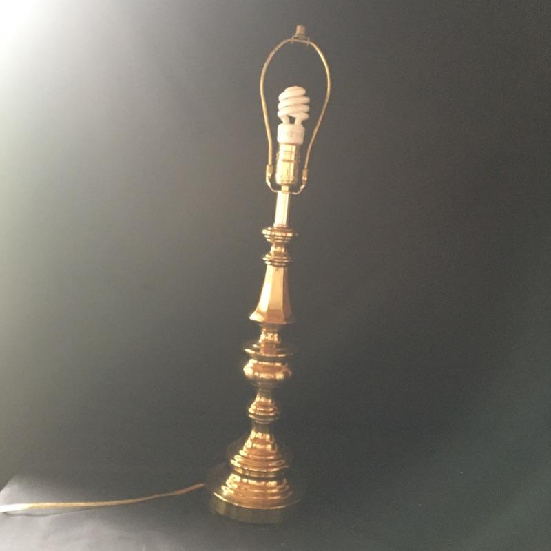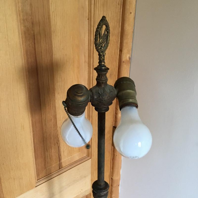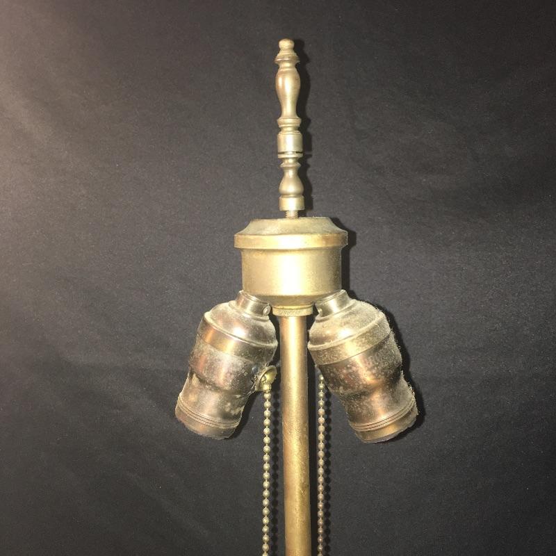 This beautiful Brass lamp signed Rostand has two lightbulb sockets with pull chains and worked when tested. Also includes a pair of matching brass lamps that measure 6”D x 28” tall and a metal floor lamp that has two lightbulb sockets and measures 10” x 10” base and 60” tall. One of the Lamps is missing lightbulb socket, the other worked when tested.