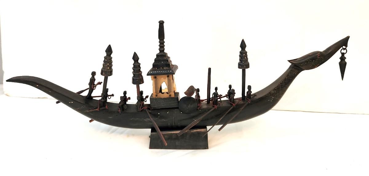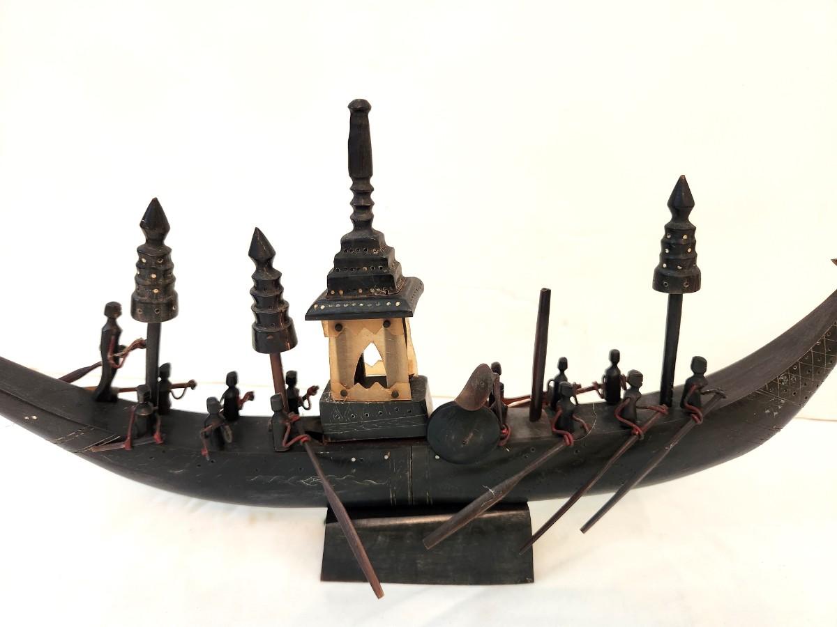 Siamese/Chinese Carved Dragon Ship - 6 pair of rowers, small shrine in center. Vintage condition, 20" long. A typical vintage souvenir piece - likely Mid Century.