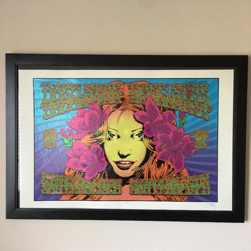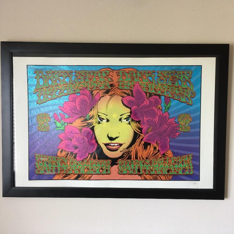 Signed and numbered 4/150 Dark Star Orchestra framed and matted. Firehouse Goldenvoice Series Number 100,Edition of 150, 6 colors on archival cream paper by Artists Chuck Sperry and Dave Hunter. Frame measures 27.25” x 39.25”. A great poster for all you Grateful Dead Fans out there.