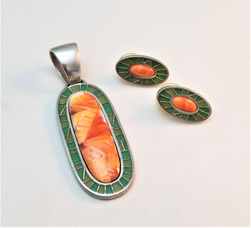 Sterling Silver (marked) stone/enamel pendant with a Southwest look - wide bail so you would wear this with a variety of chains or cords, along with a pair of matching pierced earrings. Pendant is 2.75" long - earrings are .75" long.
