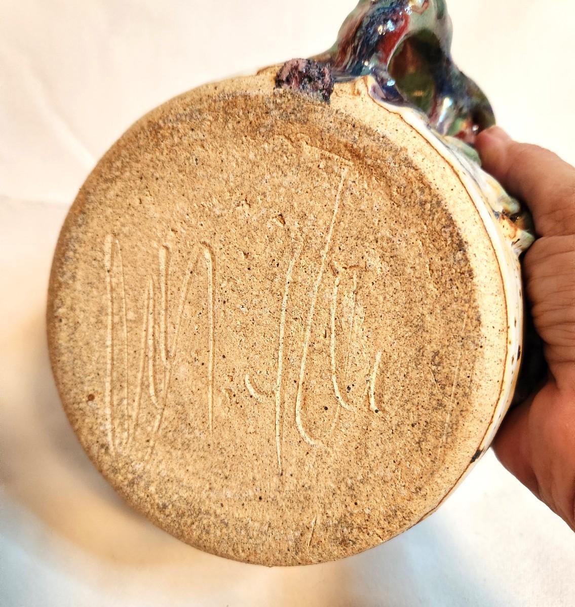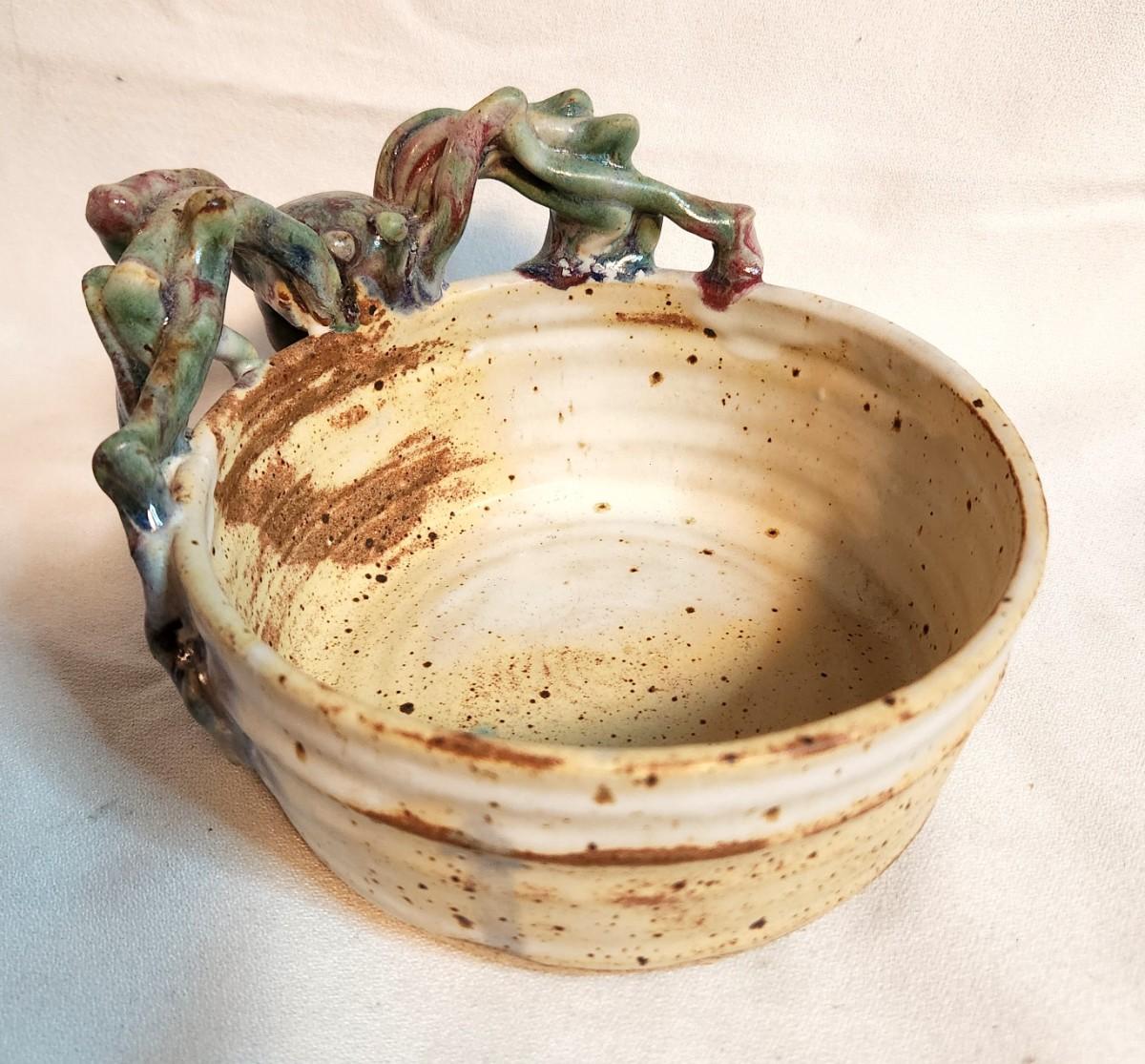 Love this piece - it's "horrible" and charming at the same time - sea creature (a lobster or crab) is climbing up the side of the studio-thrown bowl - great to put on a seafood buffet. Signed with an indistinguishable signature. We found an identical type piece on ebay which sold for 45.00 - they didn't know who made it, either. 6" across - good condition.