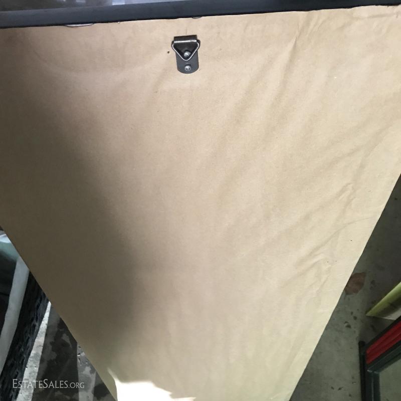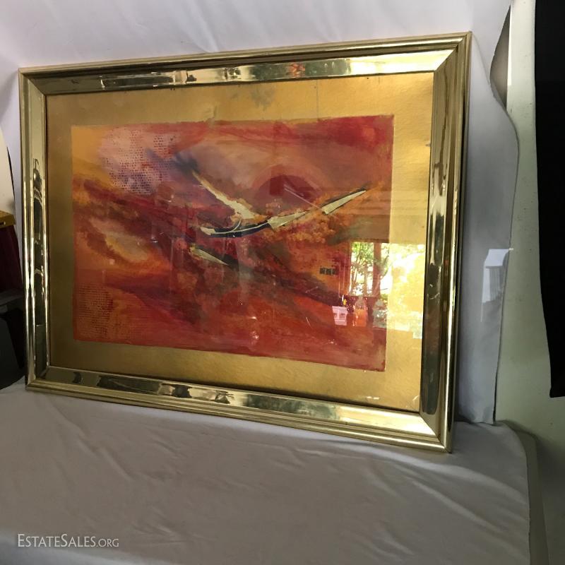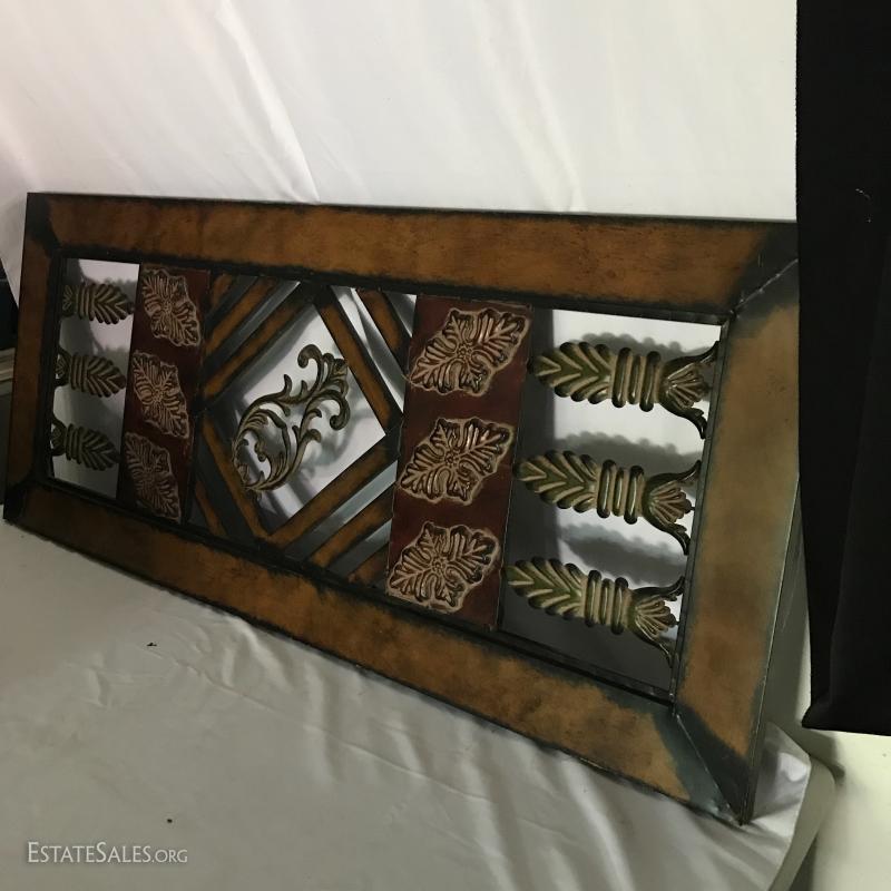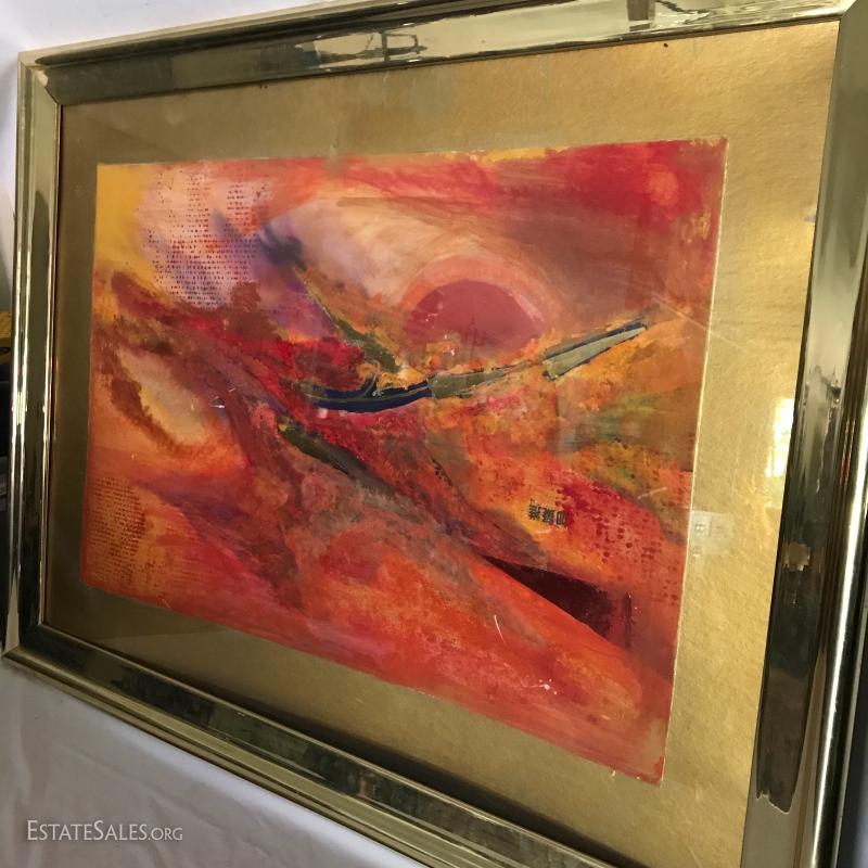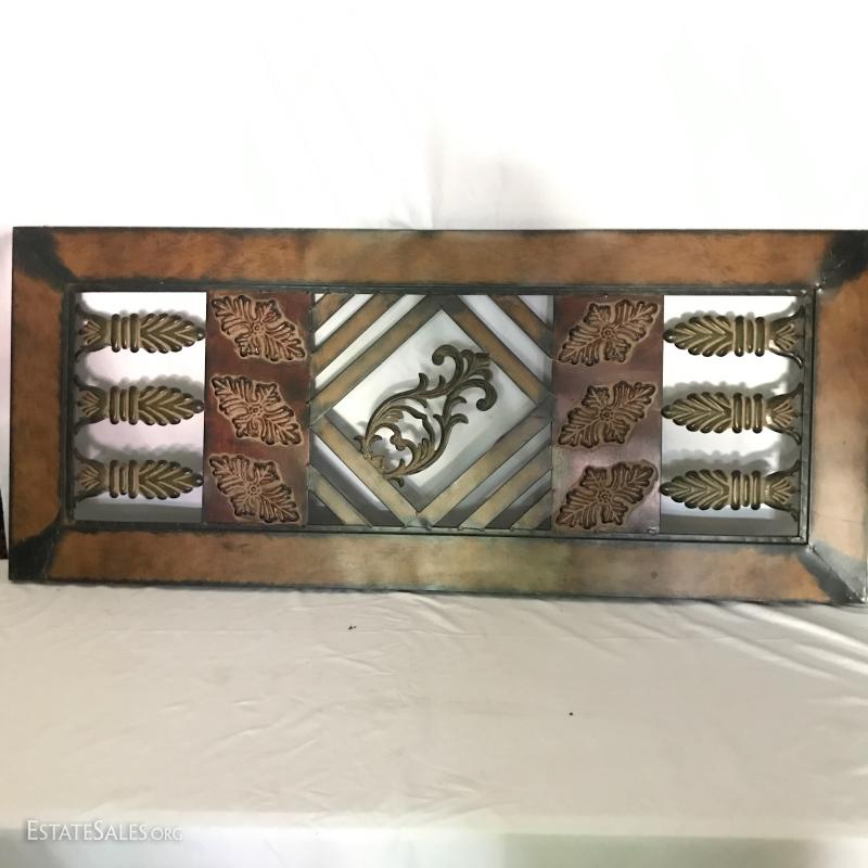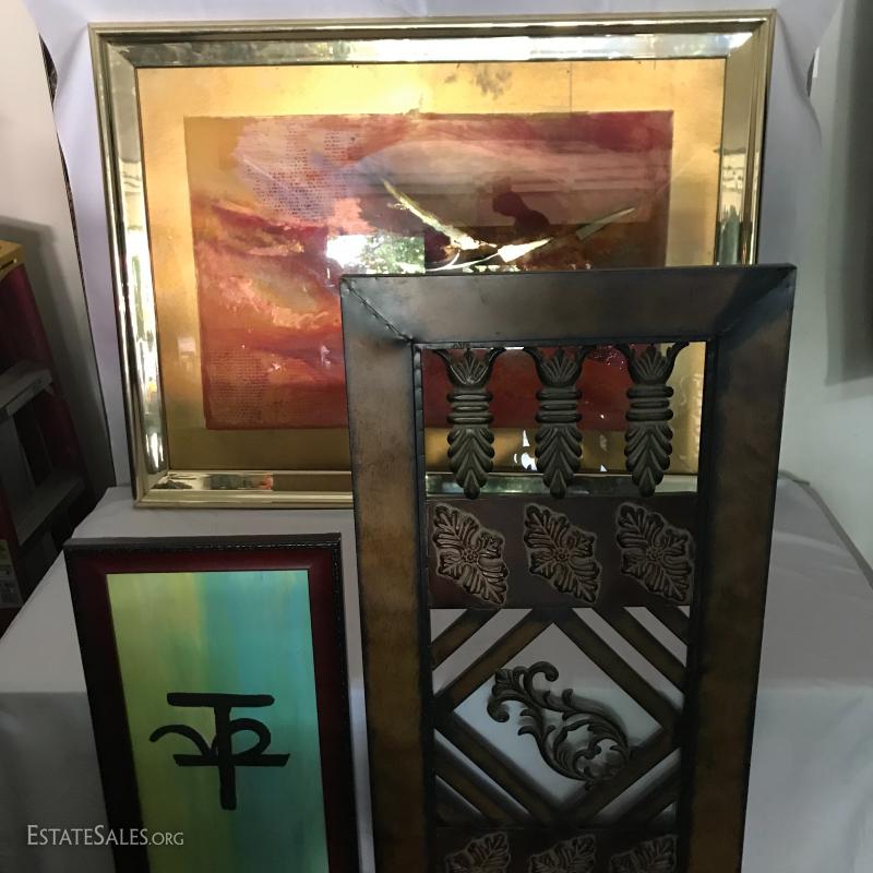 Three pieces of wall art. One large unsigned orange and red sunset in gold frame, 49.5"l x 23"w. One large metal wall piece. Hang vertical or horizontal, 54.5"l x 23"w. One signed framed art, 39"l x 15"w.