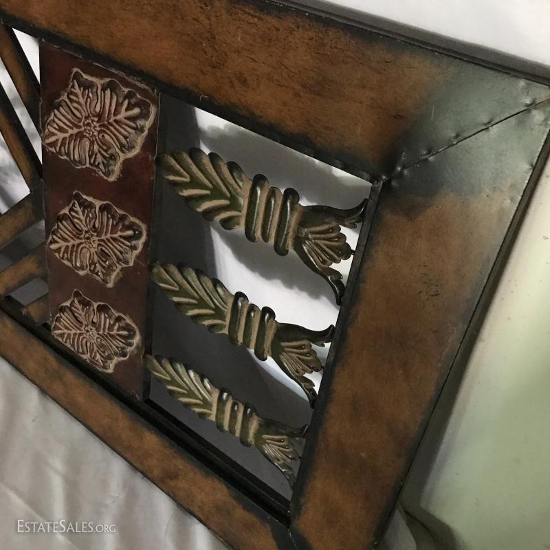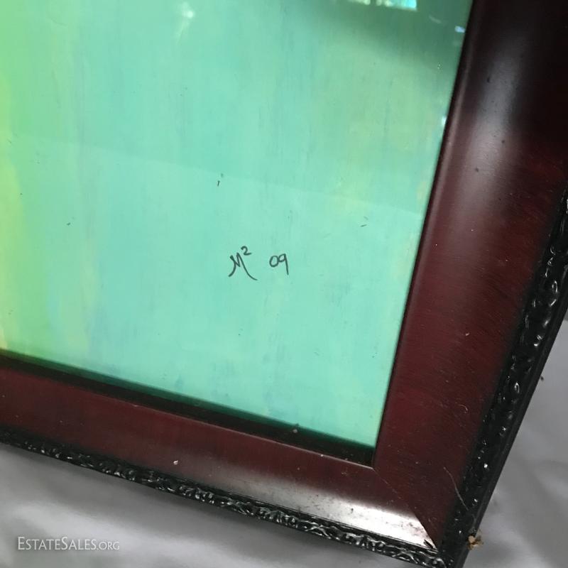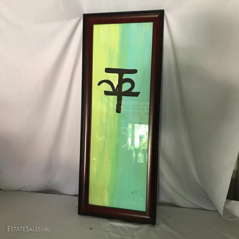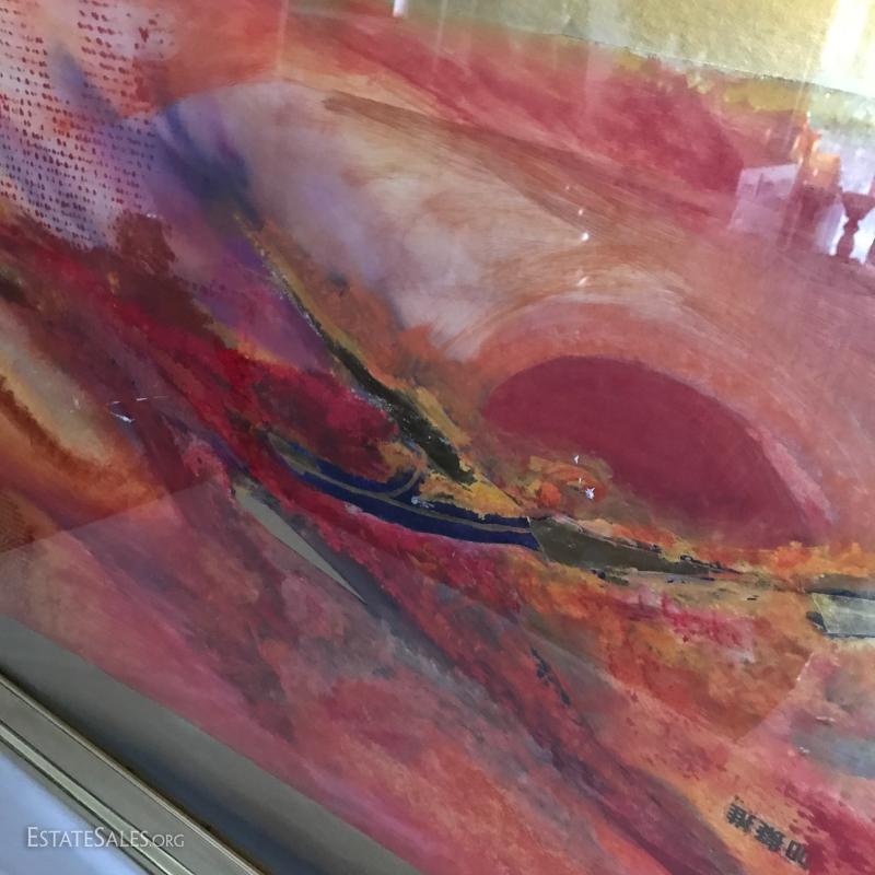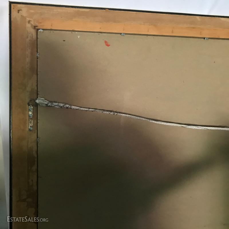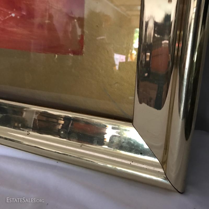 Three pieces of wall art. One large unsigned orange and red sunset in gold frame, 49.5"l x 23"w. One large metal wall piece. Hang vertical or horizontal, 54.5"l x 23"w. One signed framed art, 39"l x 15"w.