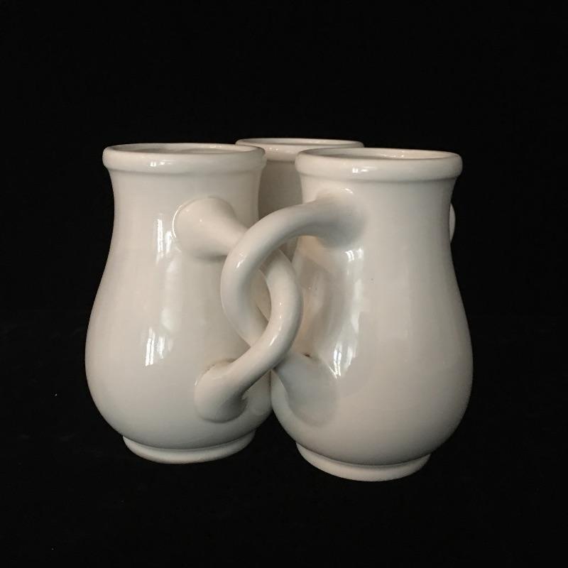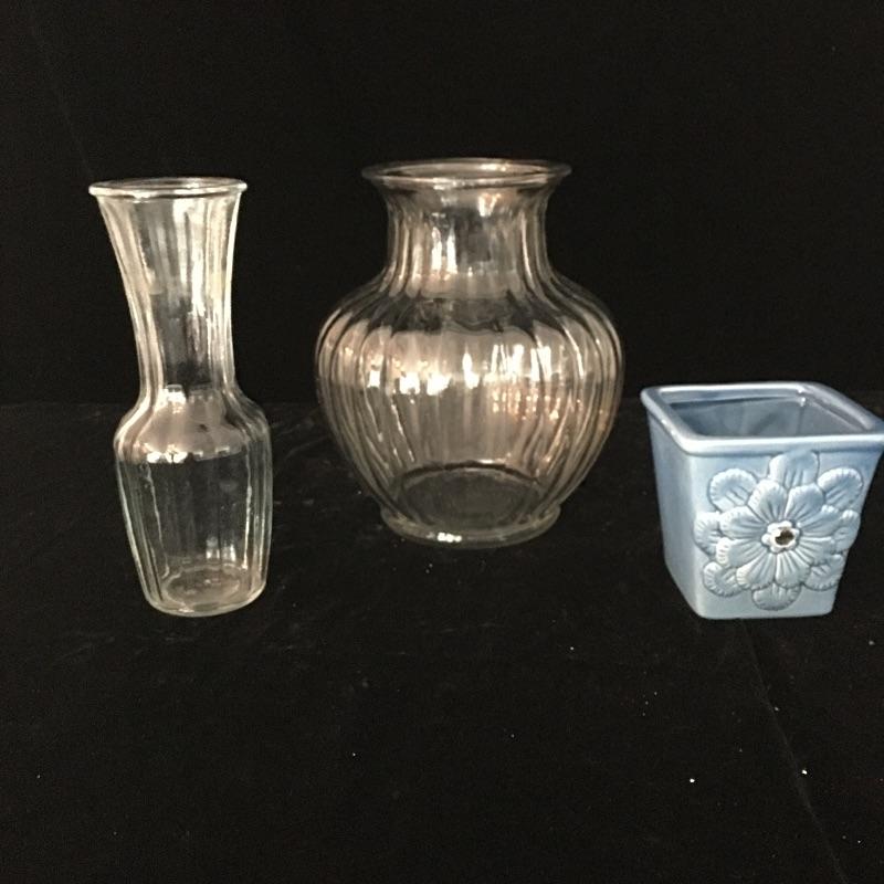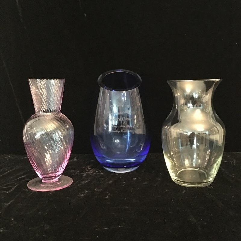 A nice selection of useful and pretty vases that includes eight in total that come in a variety of colors and sizes including an unusual triple entwined vase. Largest vase measures 9.25” tall with a 7”D.