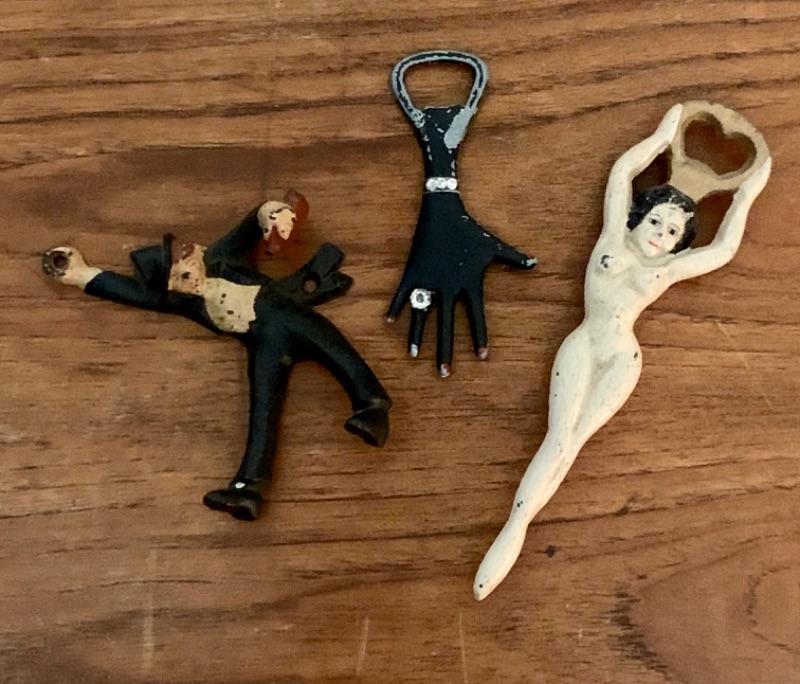 8” Art Deco Naked Lady, 6” Drunkard /Hobo (wall mount) and 5” fashion hand with rhinestone ring and bracelet.