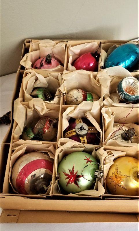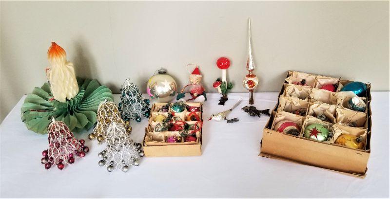You get all you see here - nice lot of vintage Christmas items. Two boxes of vintage ornaments, a clip on bird, a honeycomb paper piece and other sundry Christmas tidbits. Vintage condition.