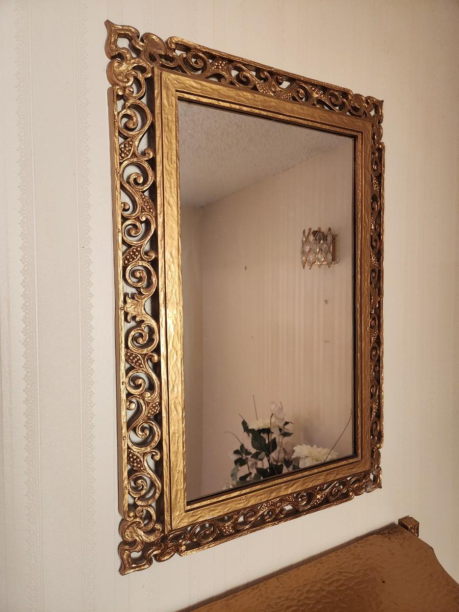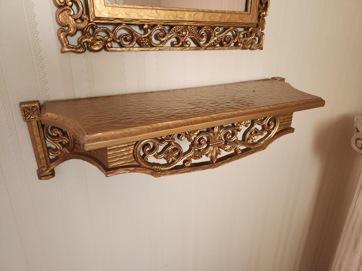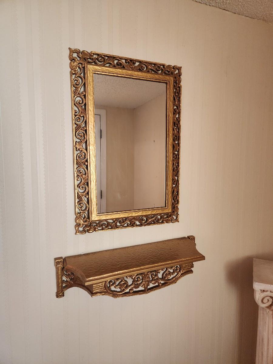 1970's Galway, Inc. plastic/resin Mirrored Wall unit - Hollywood Regency Style. Signed Syrocco - 1972. Shelf is 22" across, 6" tall, mirror is 17" x 24". All in good condition.