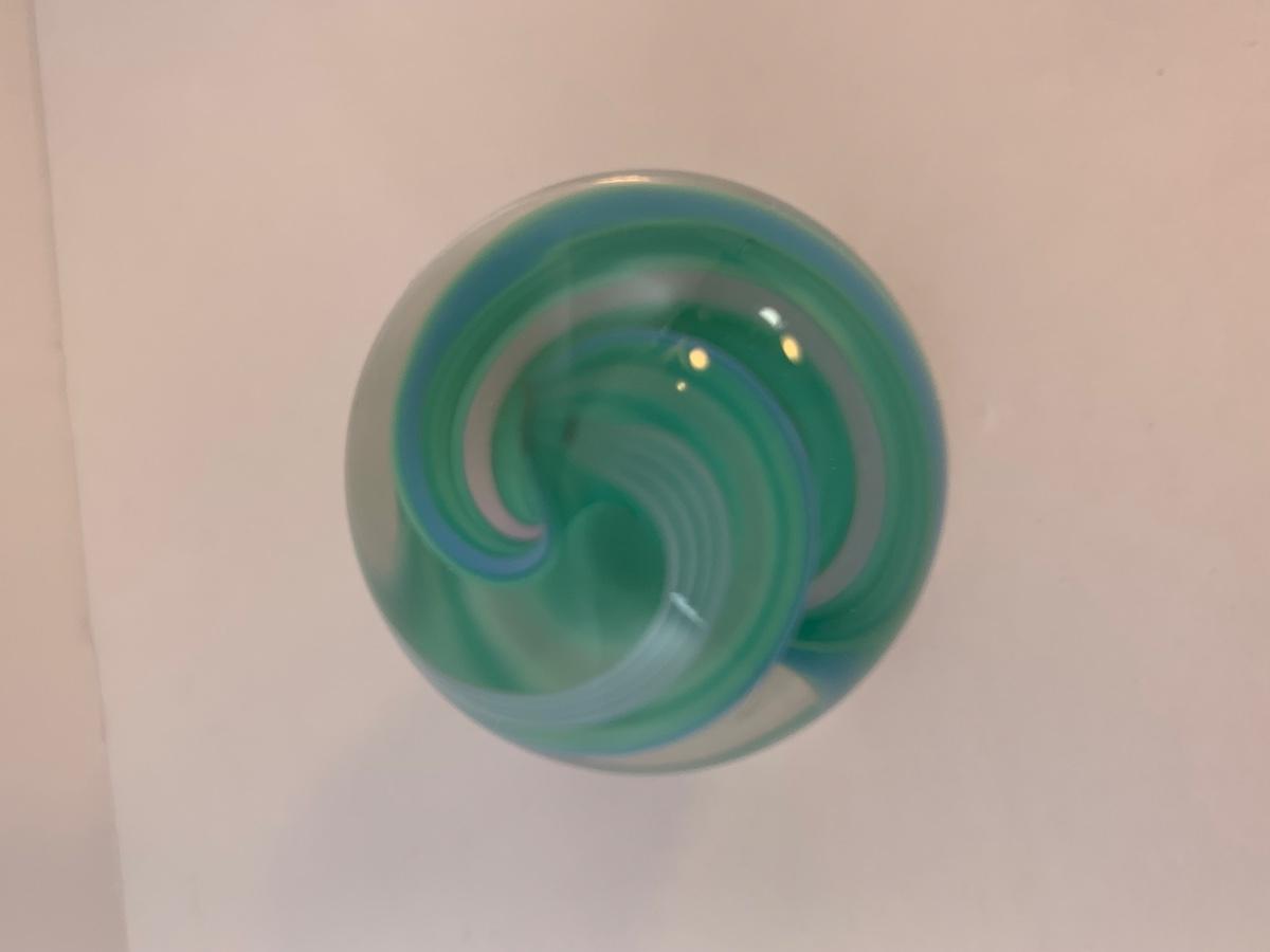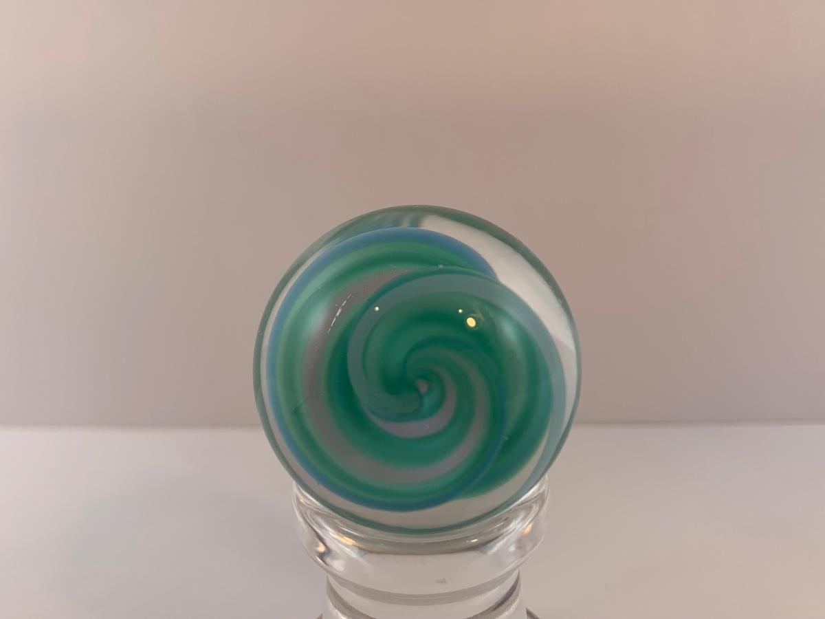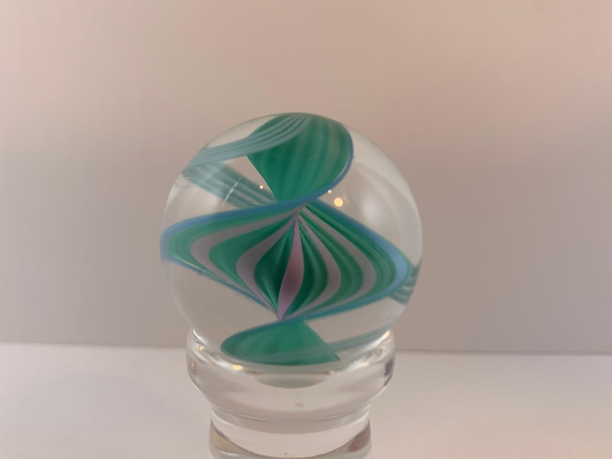 Beautiful large marble with blue/pink/green ribbon swirl in core with separate white lines, 1 3/8"