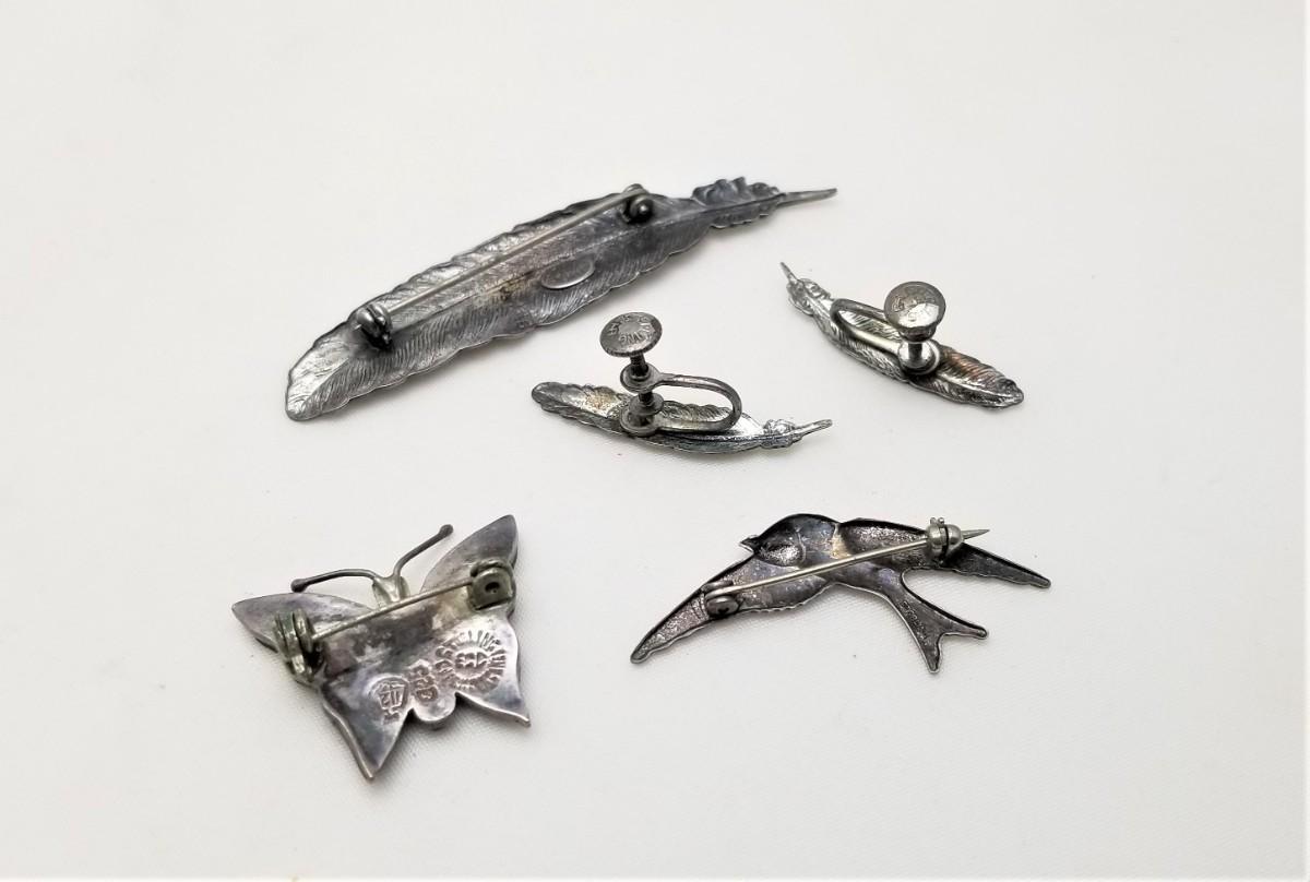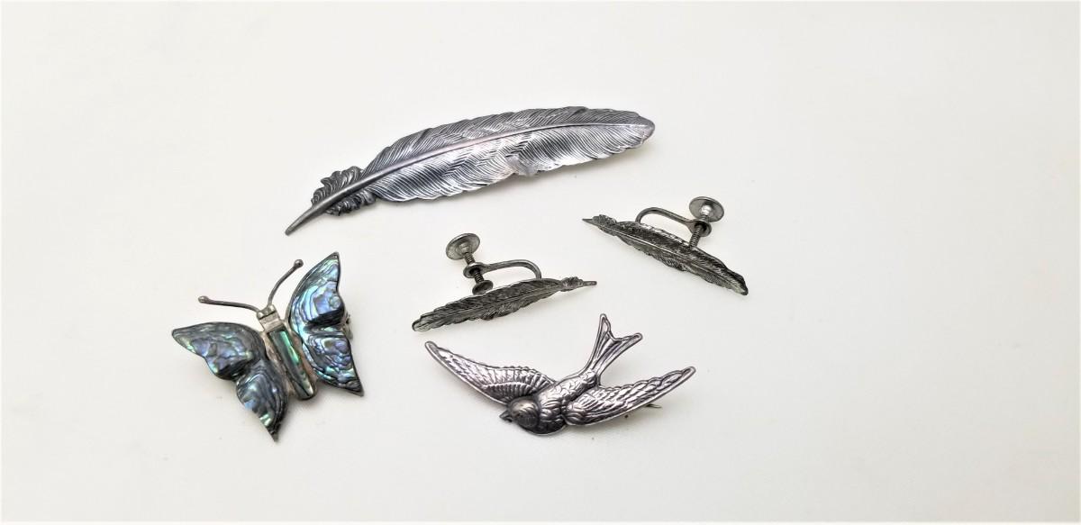 Nice vintage lot here - all marked Sterling. The Feather brooch and matching screw-back earrings are marked "Sterling by Jewelart". Brooch is 2.5" long. The butterfly brooch is Mexican sterling, set with abalone - measures 1" tall. The swallow brooch is very sweet and is marked "sterling". Swallows were considered lucky birds and a lot of Victorian pieces feature them. The brooch is 1.5" wide. All in good condition.
