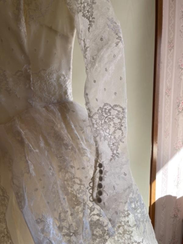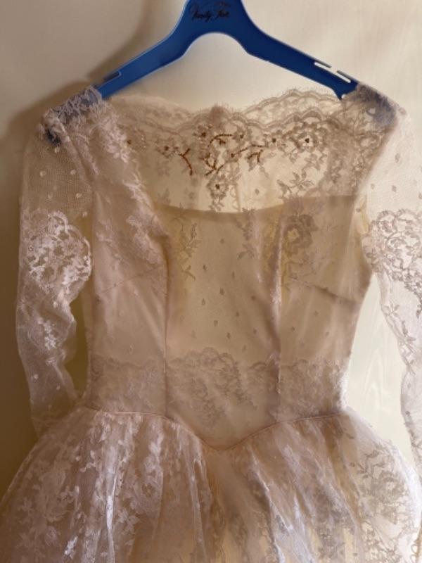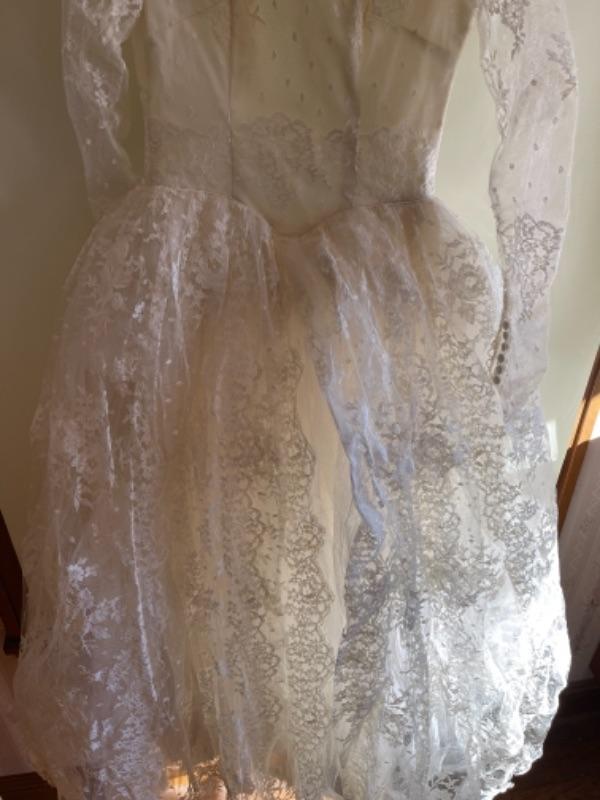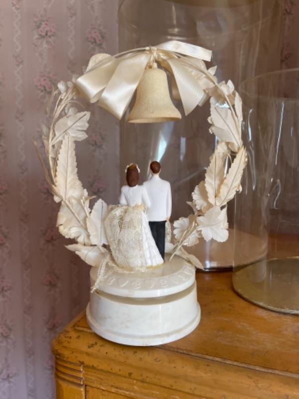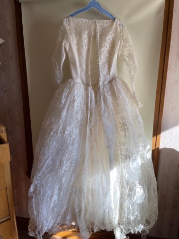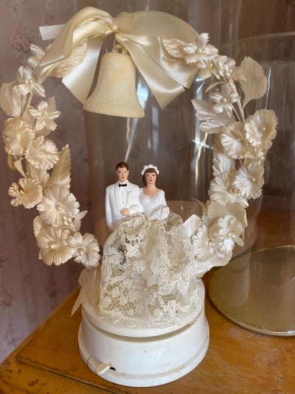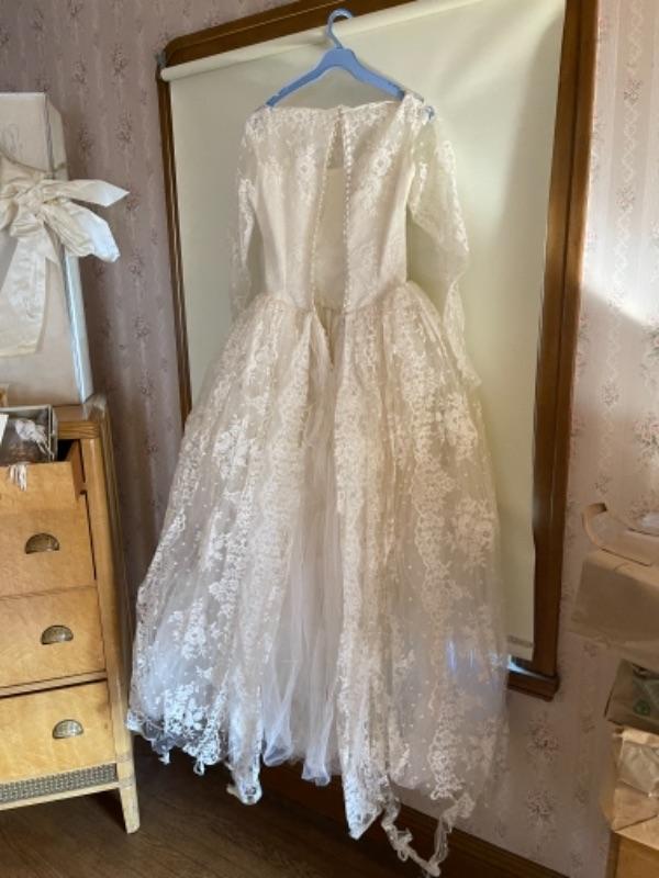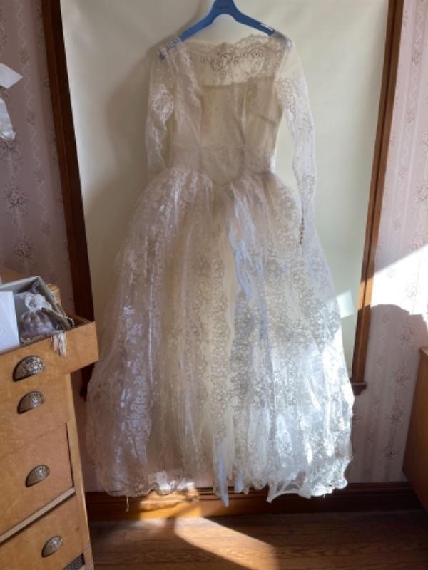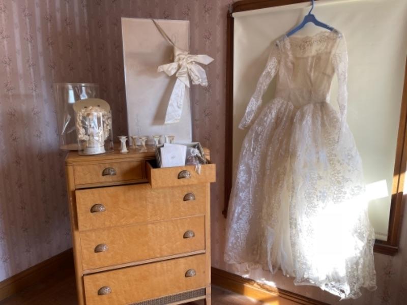 Lot 71. Vintage wedding dress, cake topper/stands, ephemera (invitations, program and favors--$125