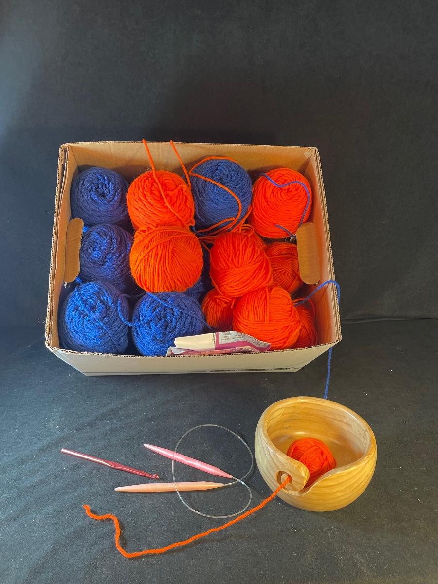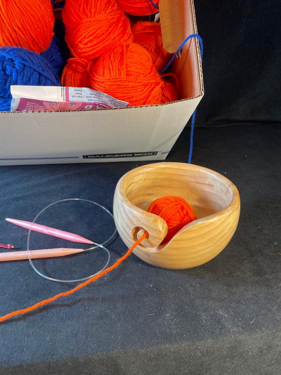 Box of acrylic yarn in University of Florida colors and a hand-carved yarn bowl