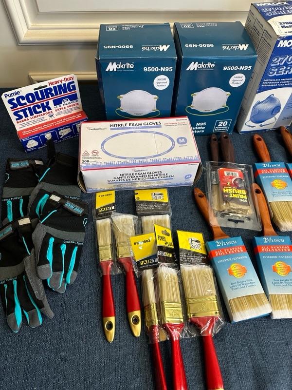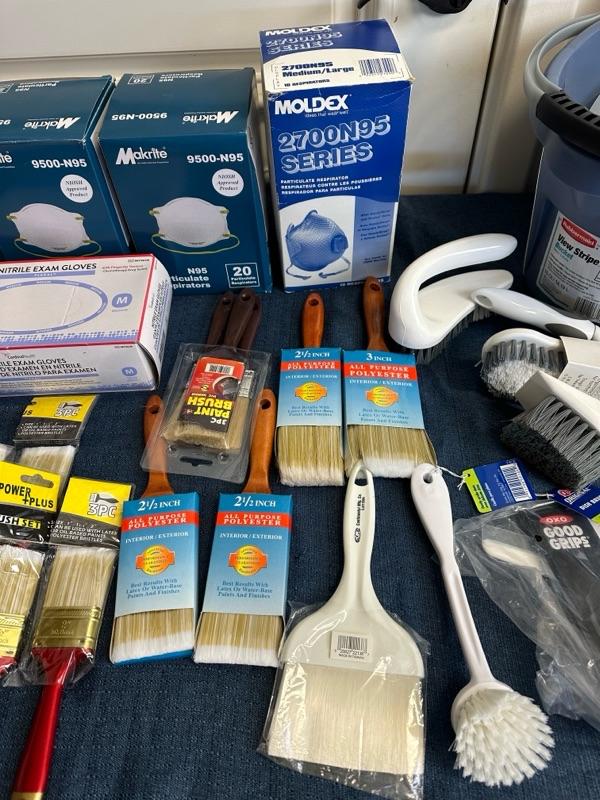 Lot 711 paint brushes, scrub brushes, 30 mask and bucket