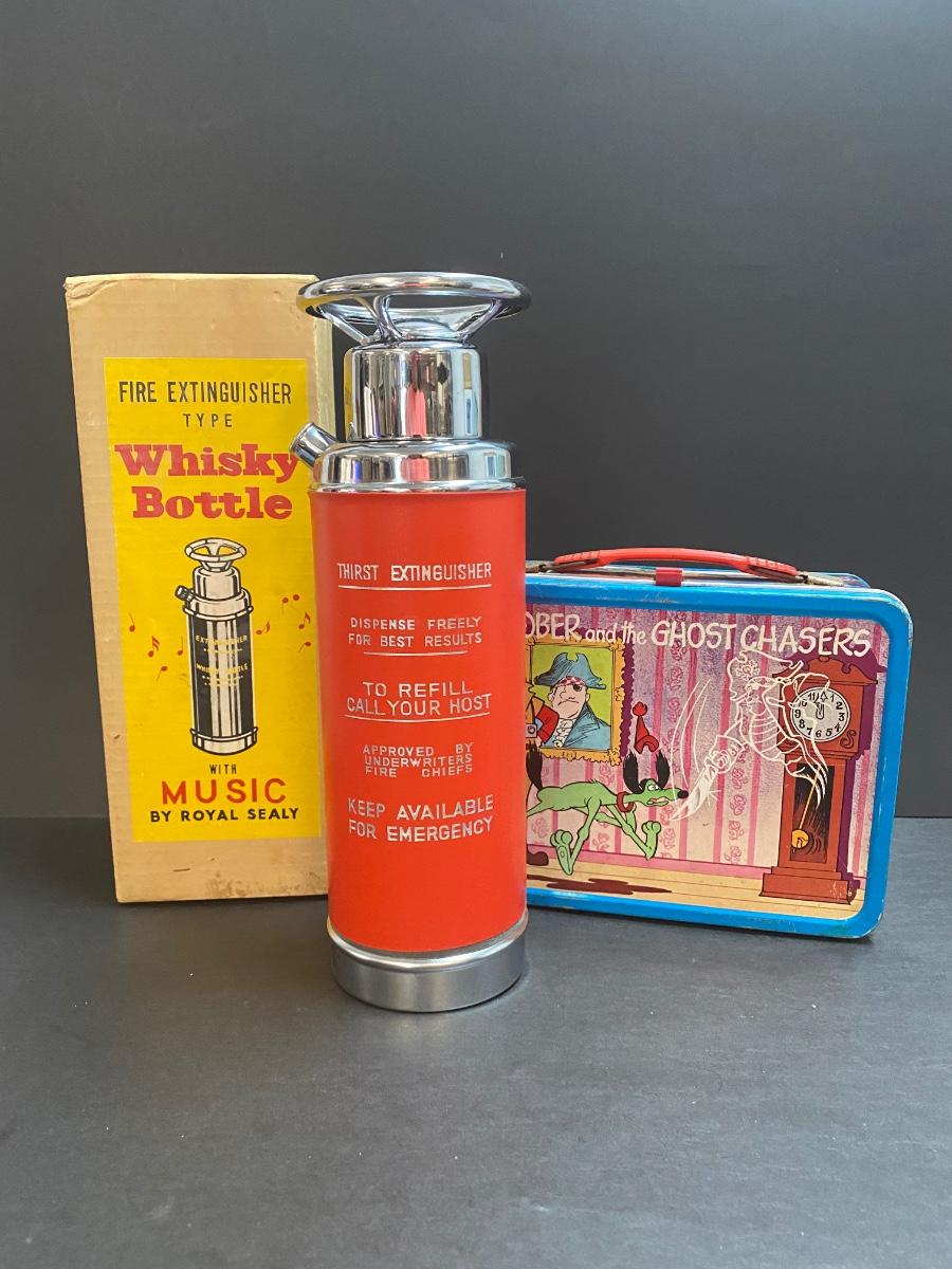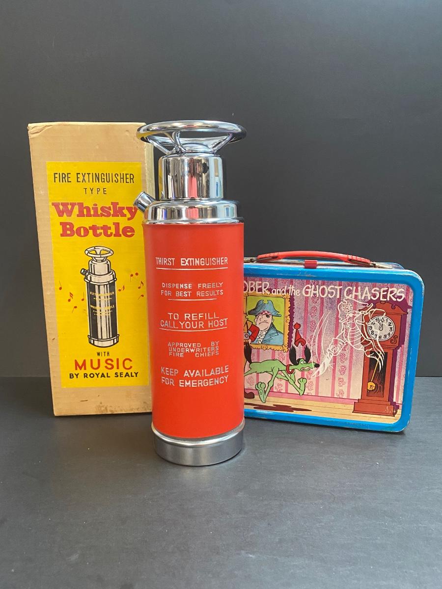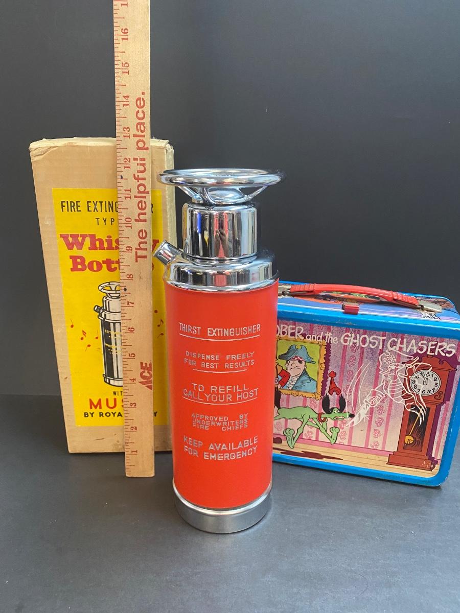 Vintage musical fire extinguisher whisky bottle. Vintage metal lunchbox. Please see all pictures as they are the best representation of the items. The pictures show condition, measurements if taken, and what is included in the lot. Due to the large amount that we photograph and the time frame, we are not always able to take measurements. All items unless noted, are pre-owned and have been used. If you purchased furniture, you must bring help. We do not allow one person to carry large furniture out on their own. Bring help, tools and a truck for the safety of our client’s homes, and your personal safety. Any damages that result to the property including walls, and floors due to moving of the furniture will be charged to the buyer. Company policy. Thank you.