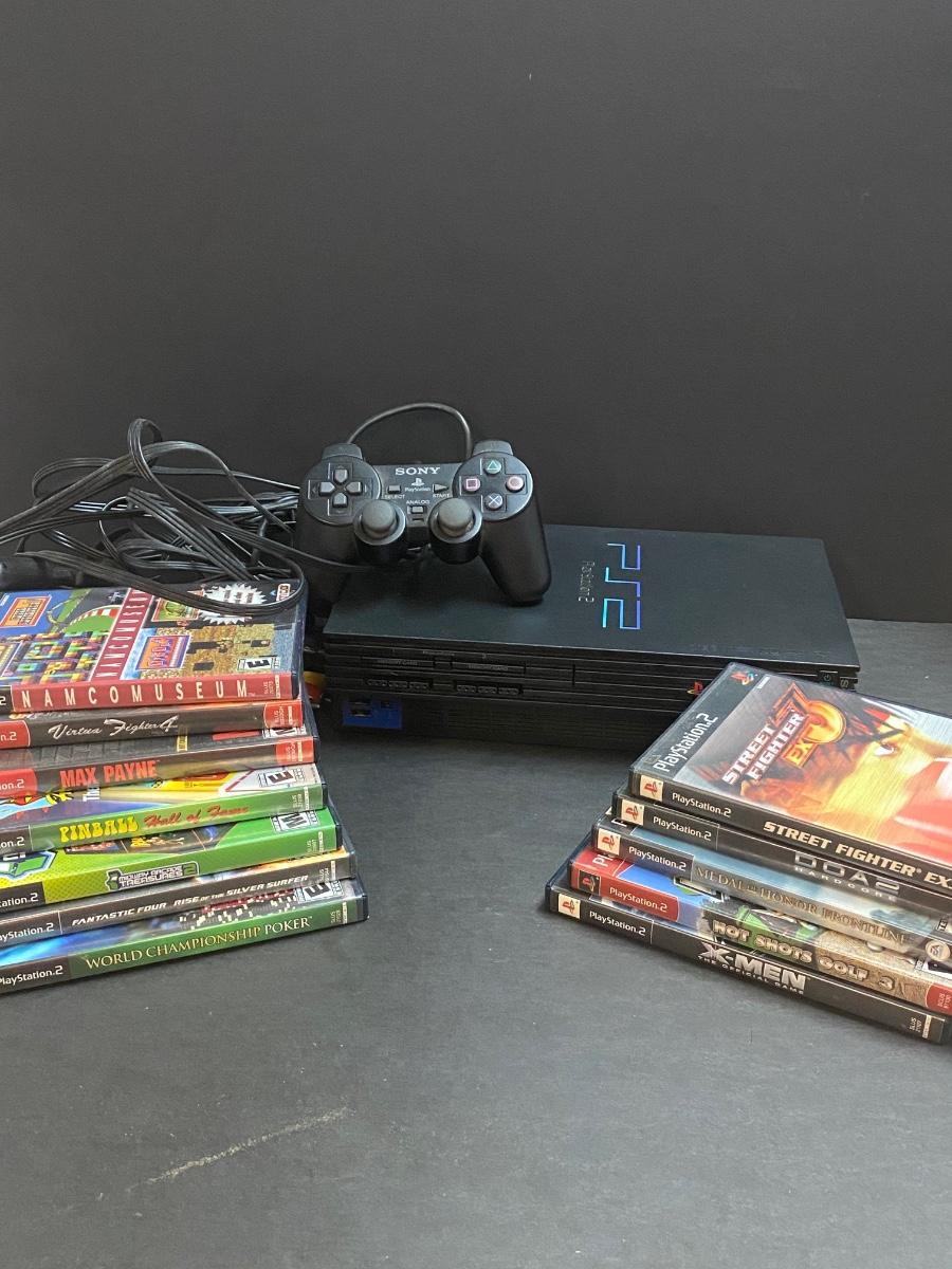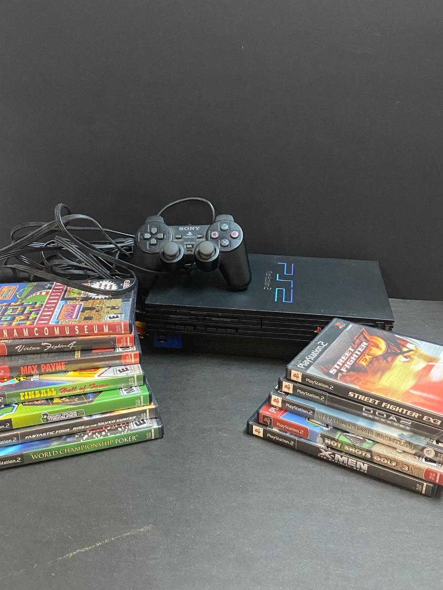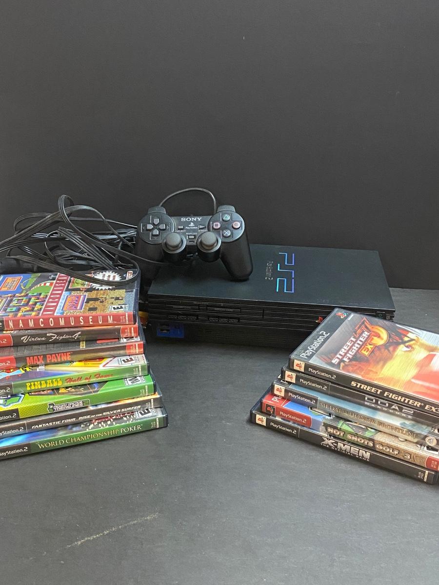 PlayStation 2 system comes with adapter and controller. Lot also includes large collection of games.