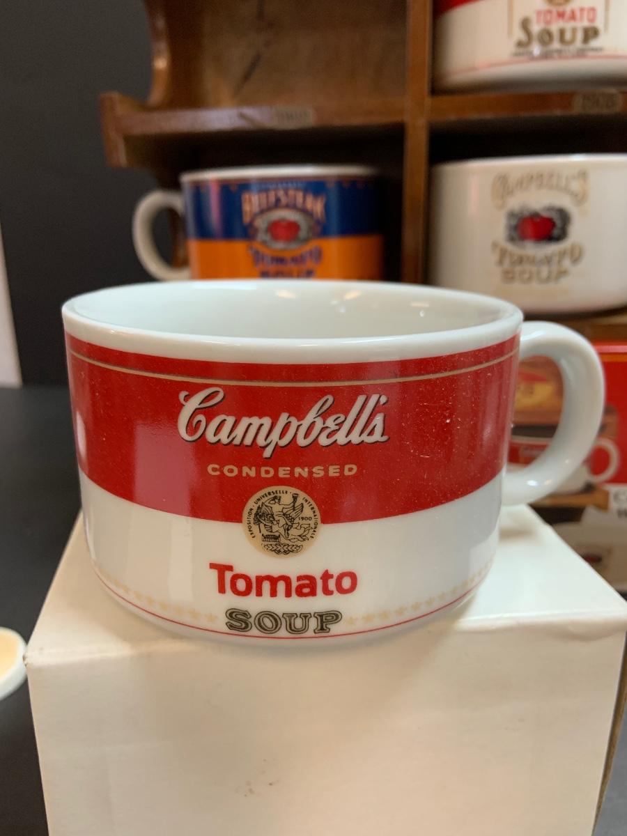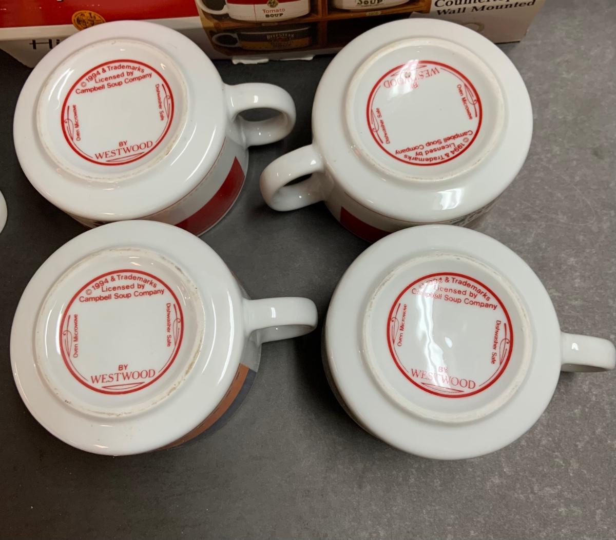 LOT:140: Lot of Campbell’s Soup 4 Mugs with shelf and figure.