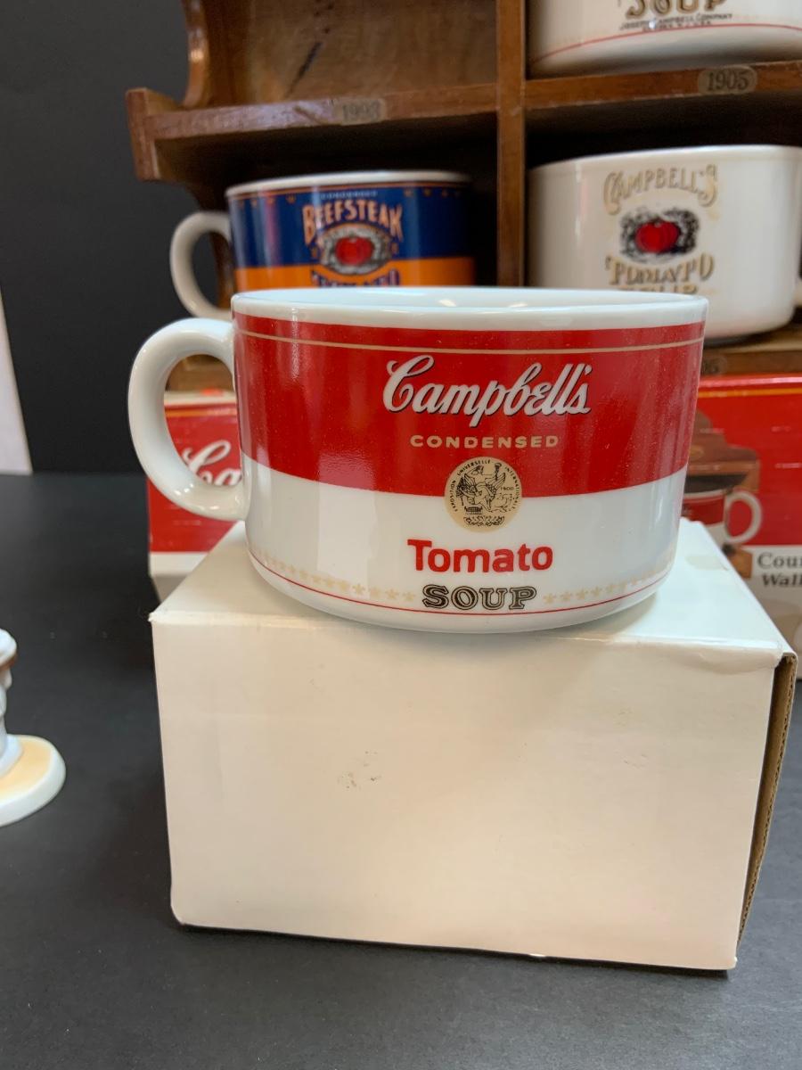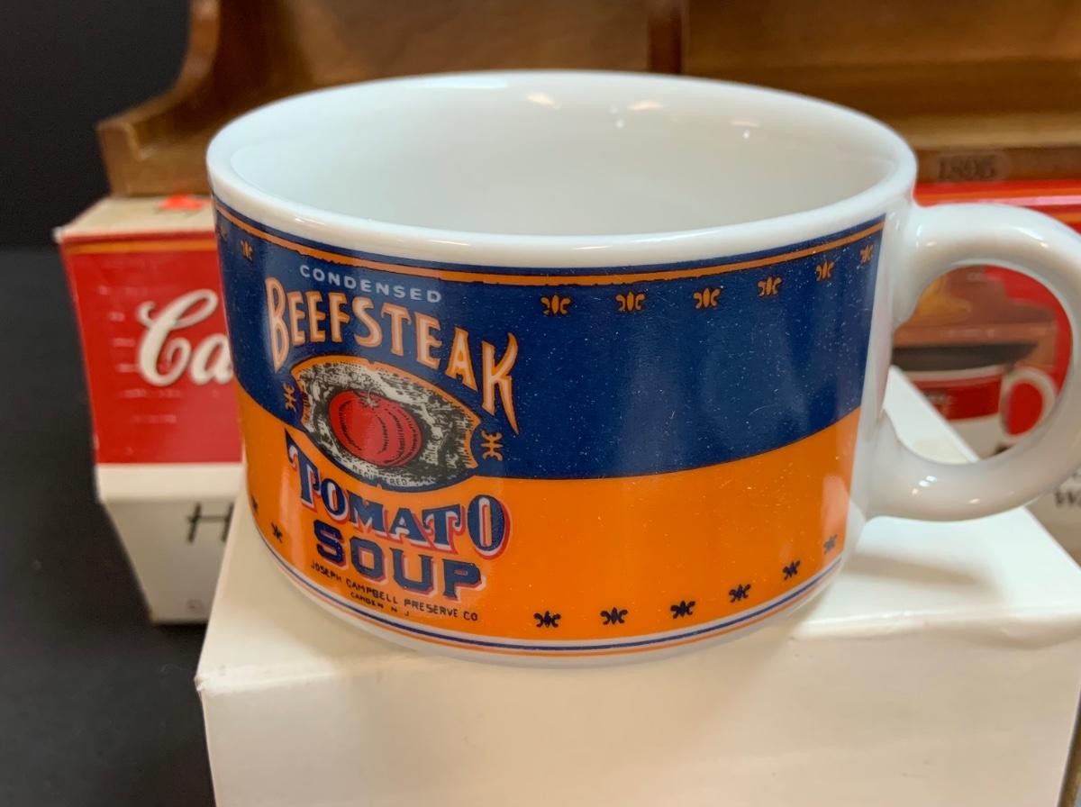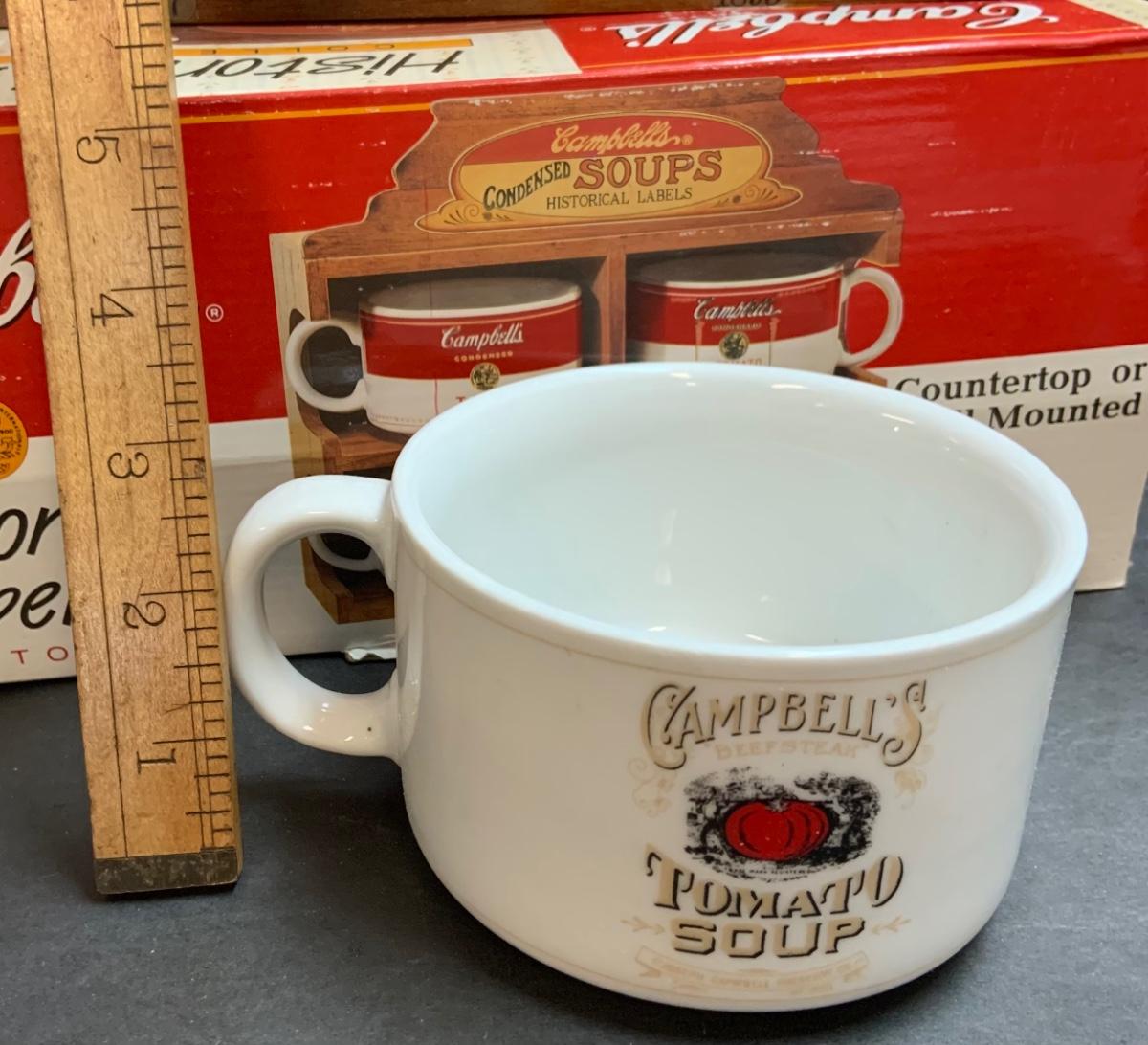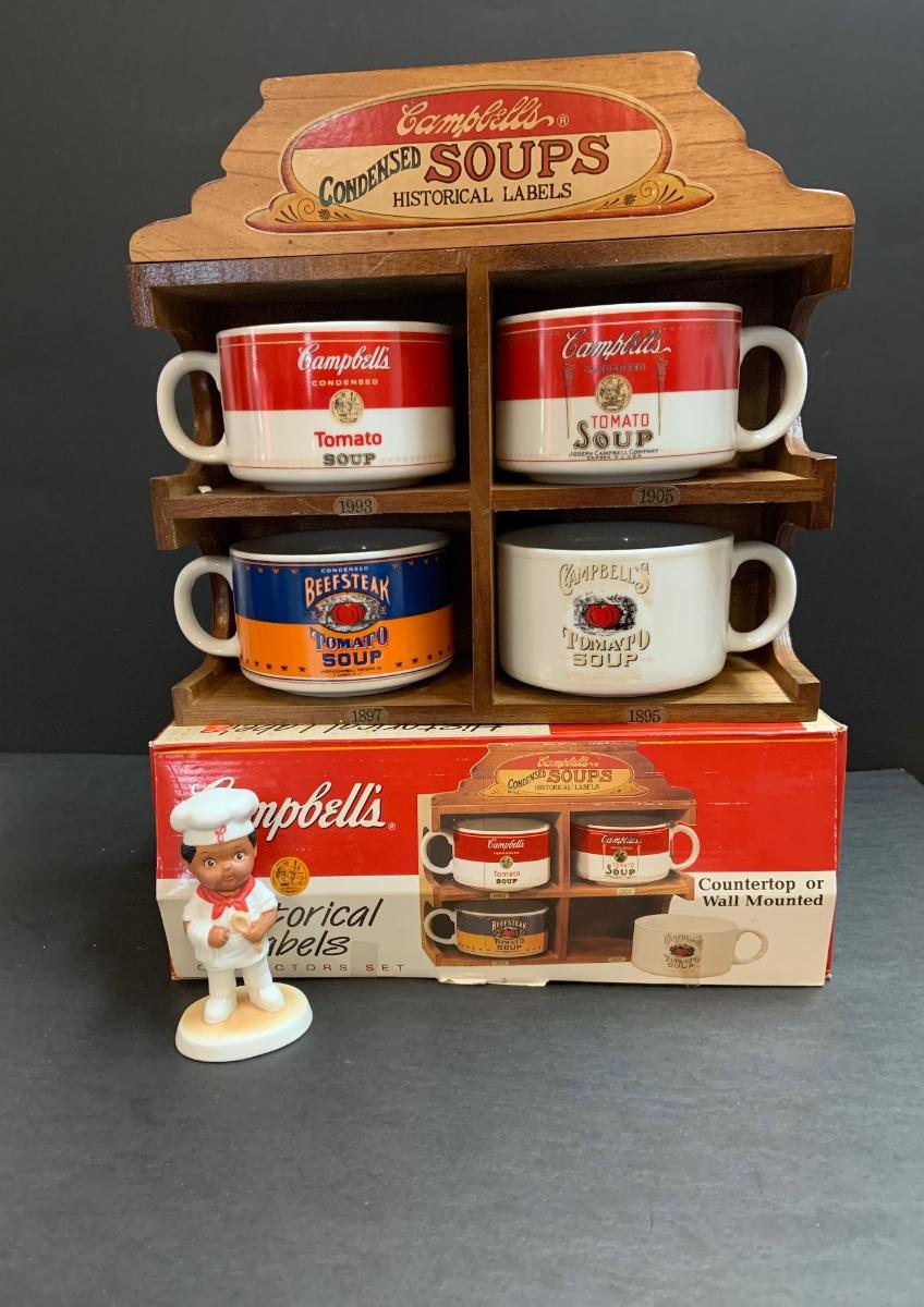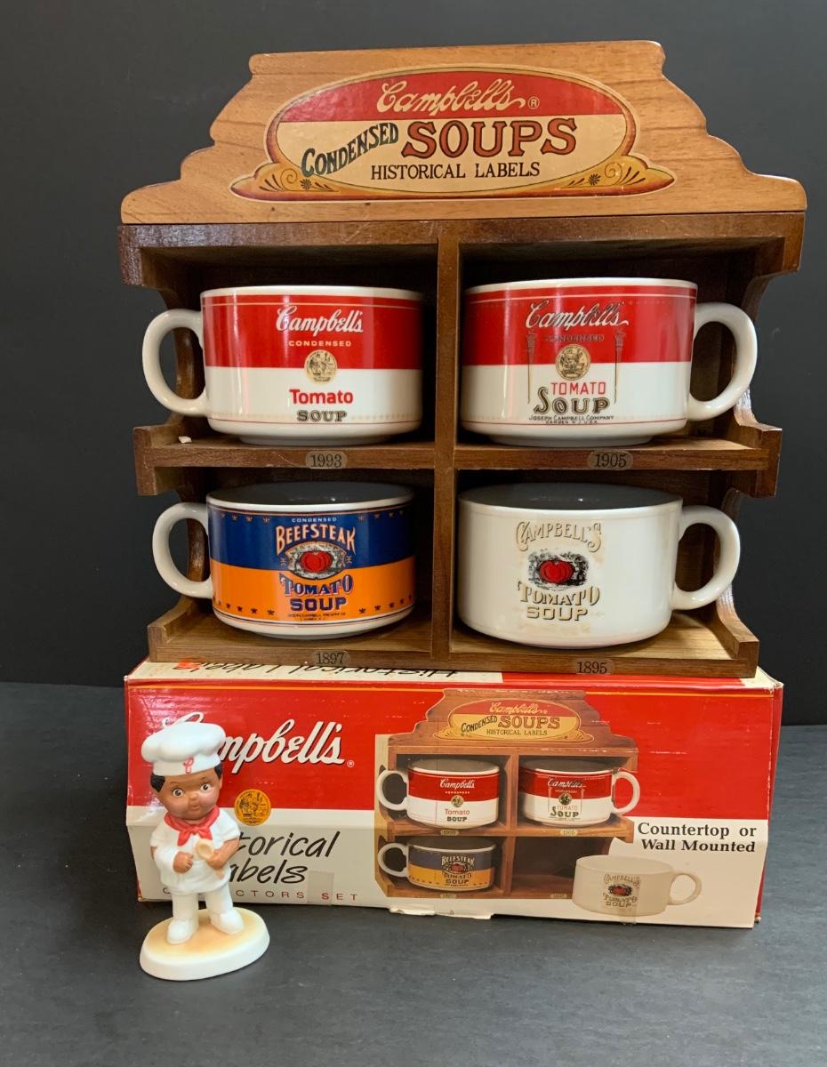 LOT:140: Lot of Campbell’s Soup 4 Mugs with shelf and figure. Campbell Historical Label Soup Mugs and Cambells Chef 1994