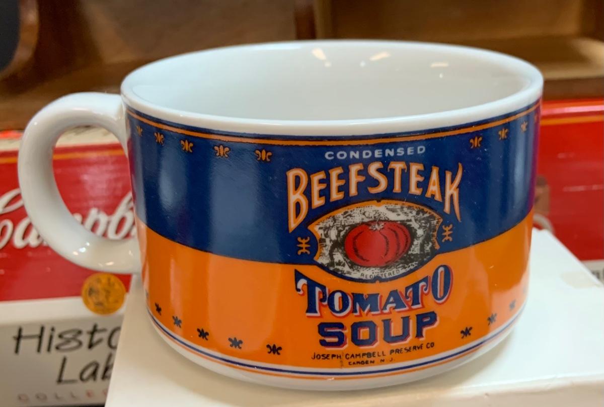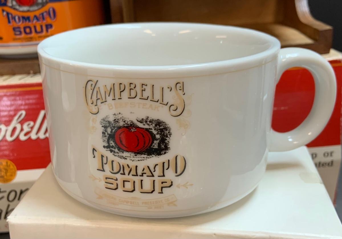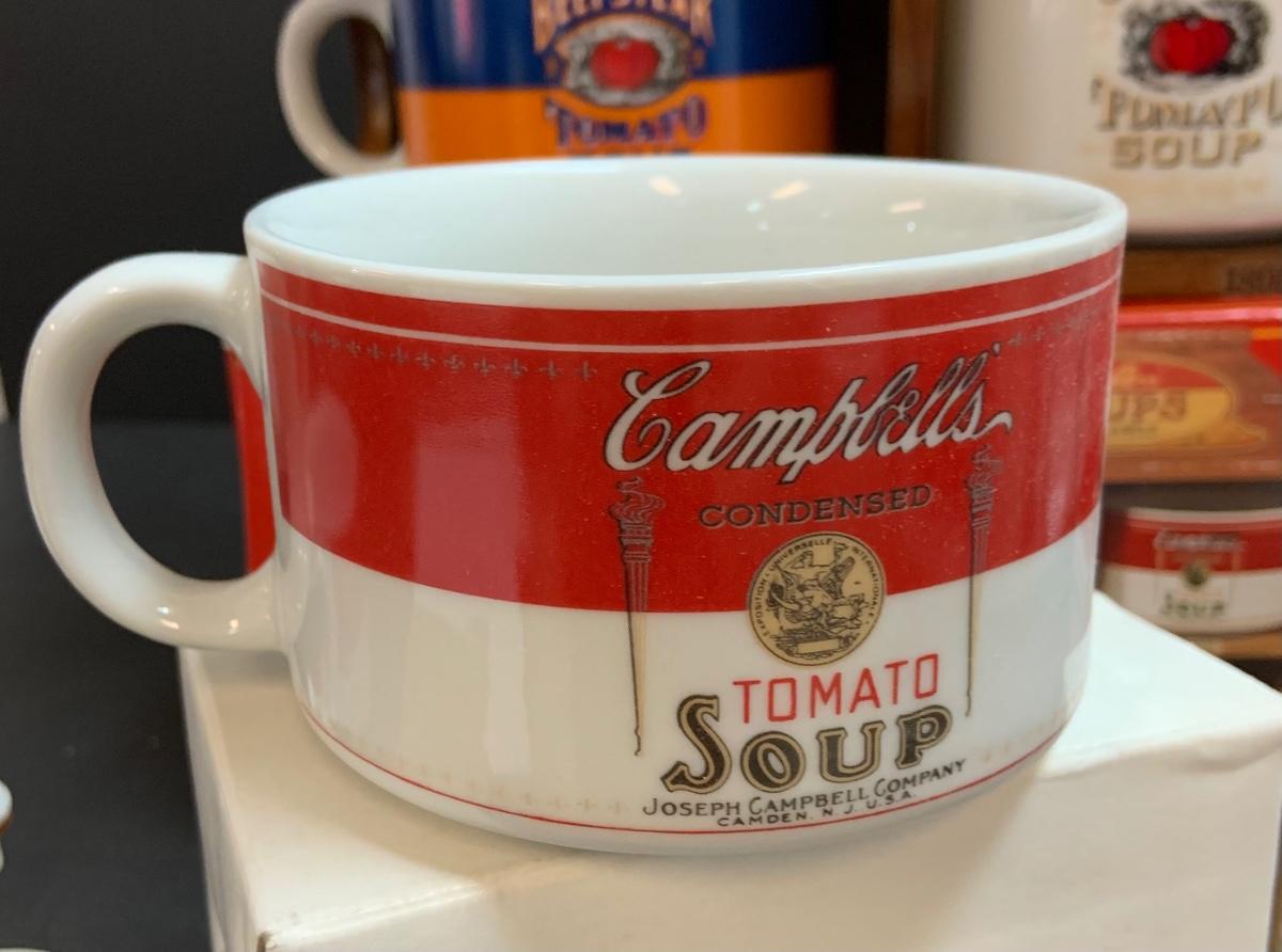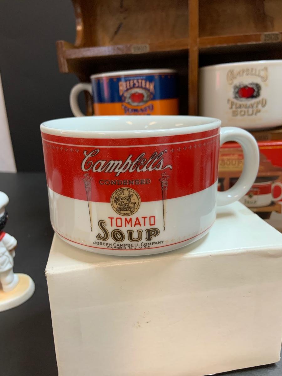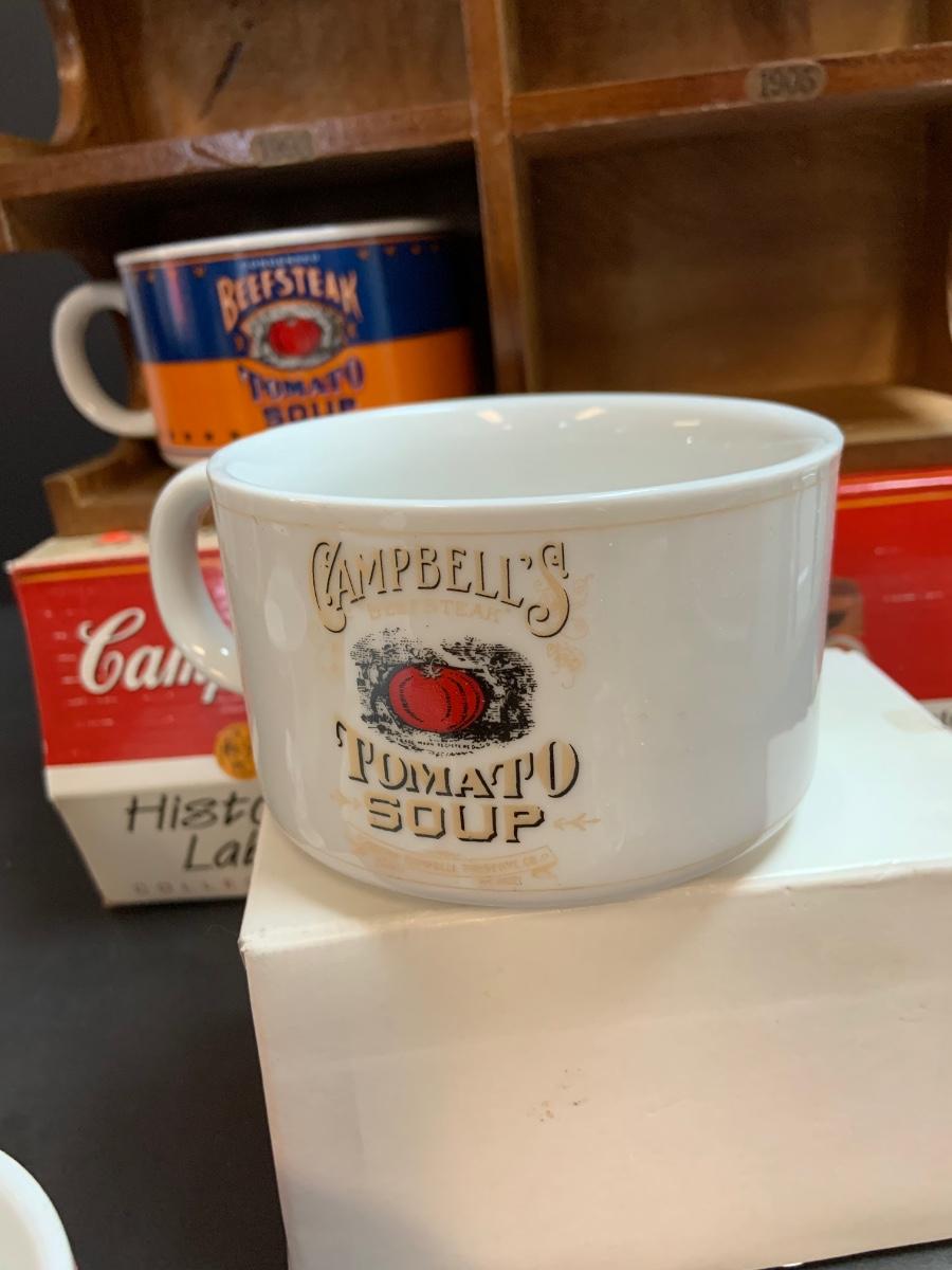 LOT:140: Lot of Campbell’s Soup 4 Mugs with shelf and figure. Campbell Historical Label Soup Mugs and Cambells Chef 1994