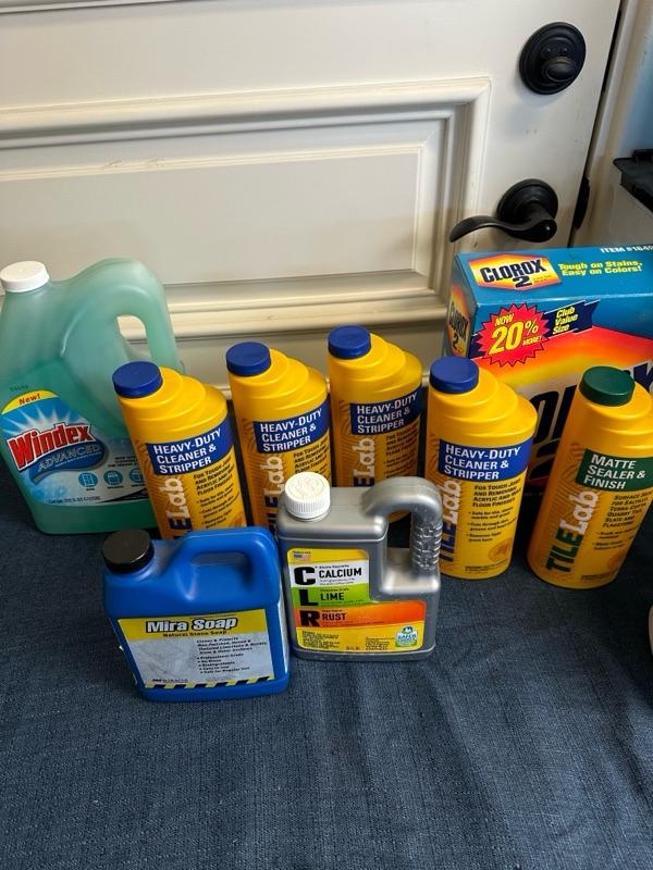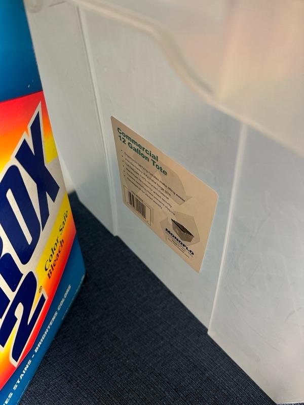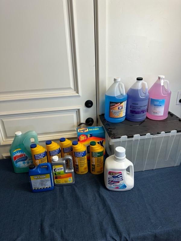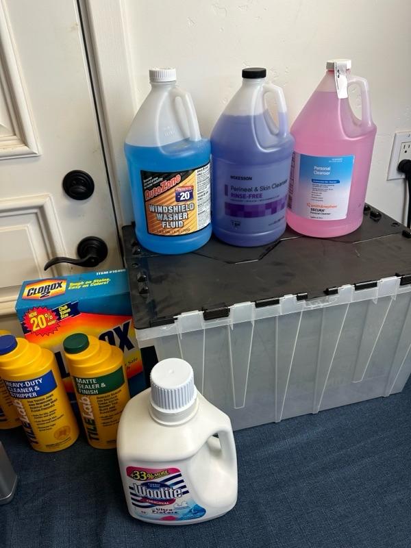 Lot 713 various cleaning supplies, and 12 gallon tote