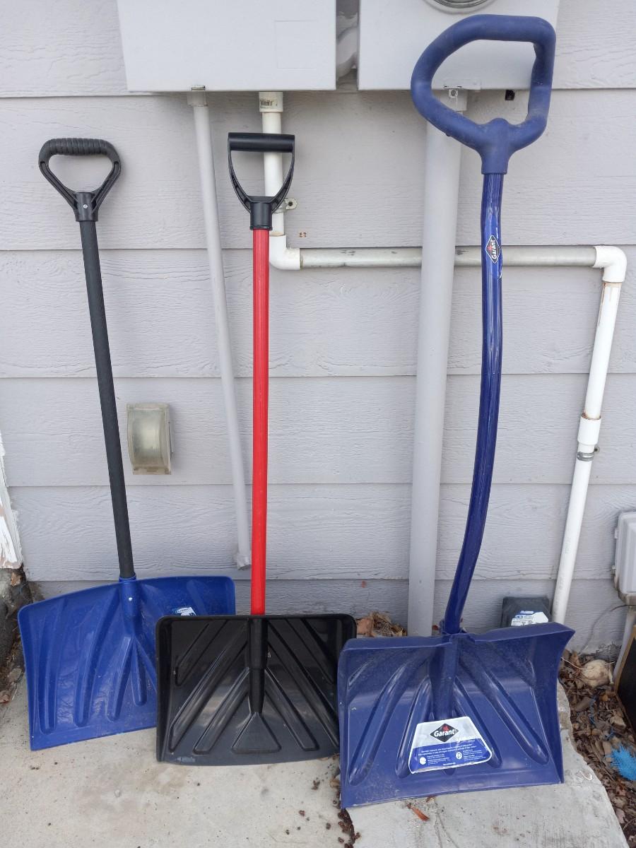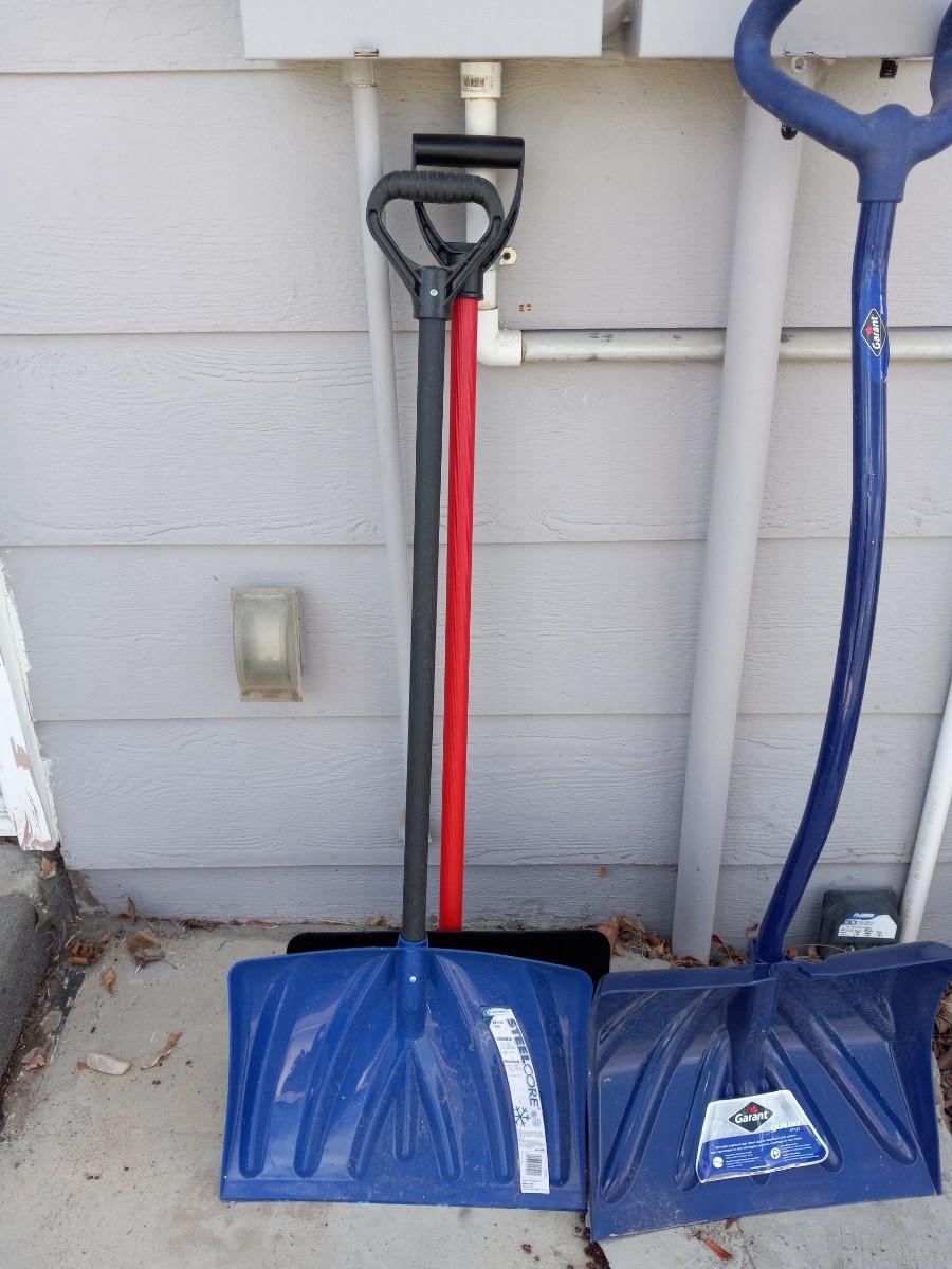3 SNOW SHOVELS AND A FROST GUARD WINDSHIELD COVER