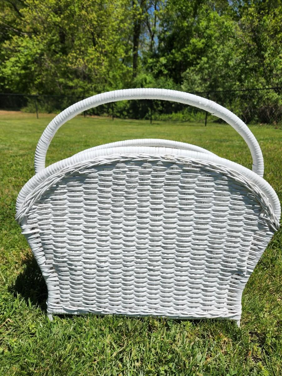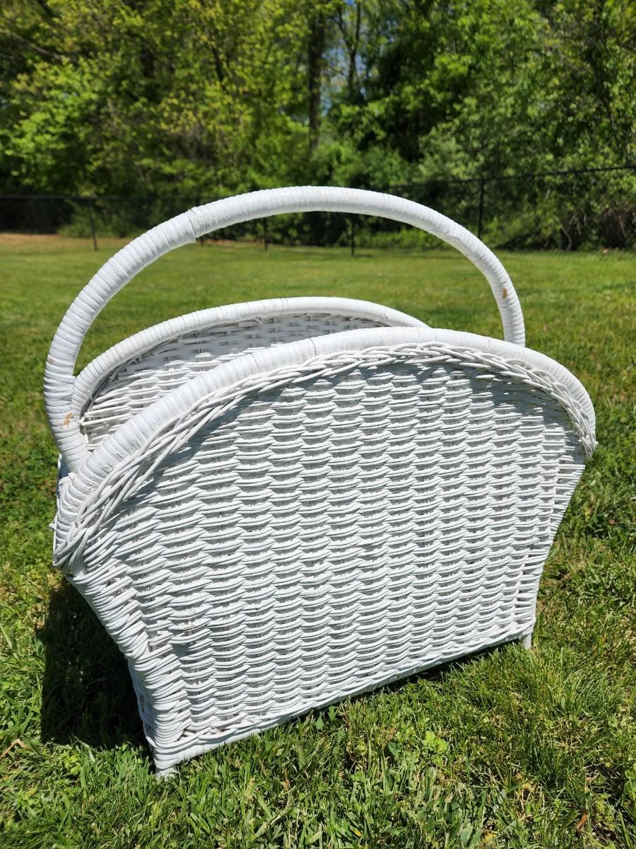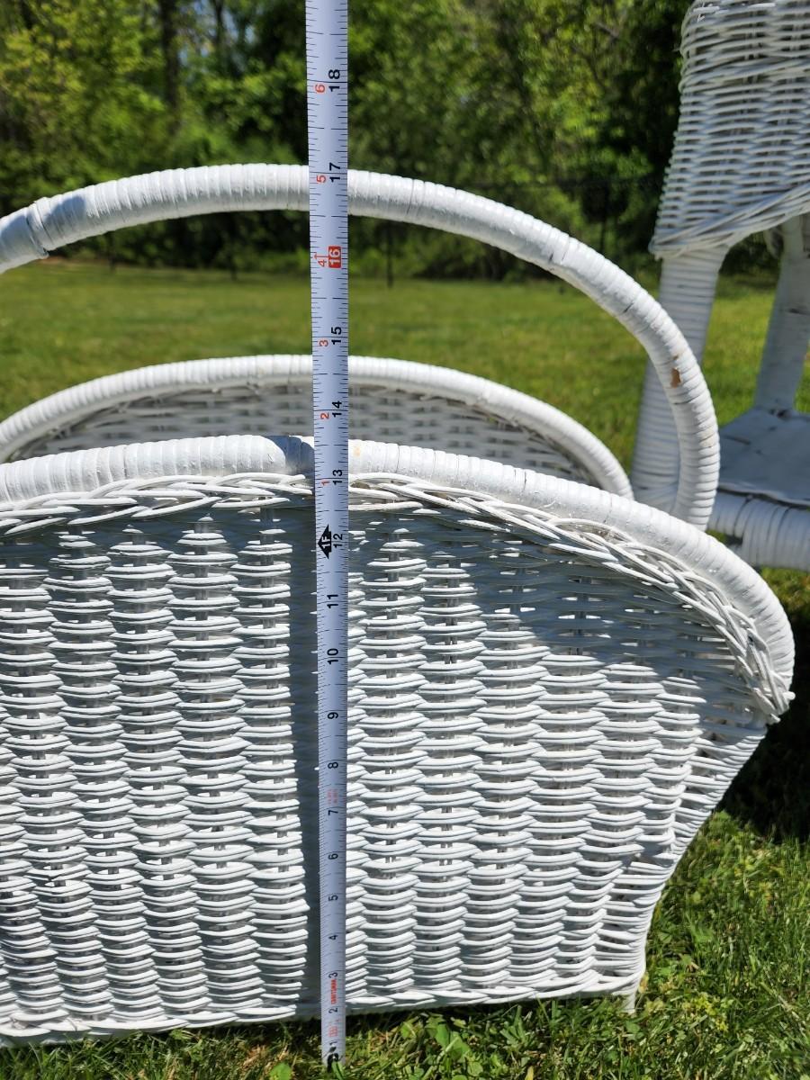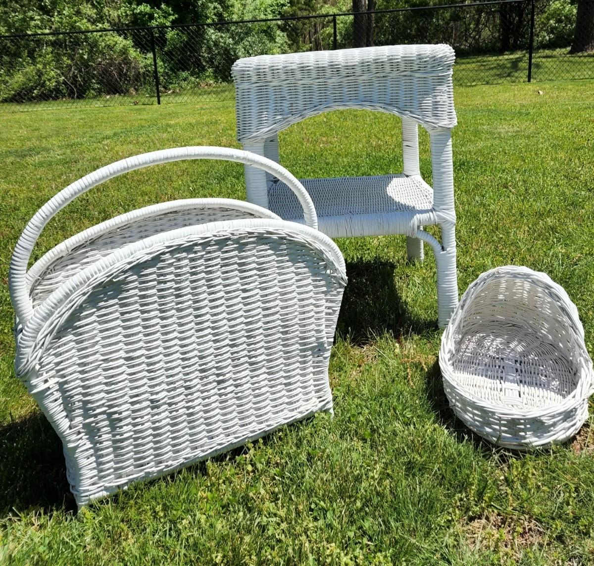 Three-piece white wicker set includes magazine rack/plant stand/bassinet. Please see all pictures as they are the best representation of the items. The pictures show condition, measurements if taken, and what is included in the lot. Due to the large amount that we photograph and the time frame, we are not always able to take measurements. All items unless noted, are pre-owned and have been used. If you purchased furniture, you must bring help. We do not allow one person to carry large furniture out on their own. Bring help, tools and a truck for the safety of our client’s homes, and your personal safety. Any damages that result to the property including walls, and floors due to moving of the furniture will be charged to the buyer. Company policy. Thank you.