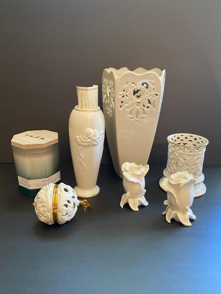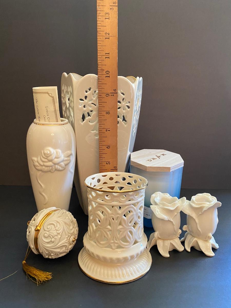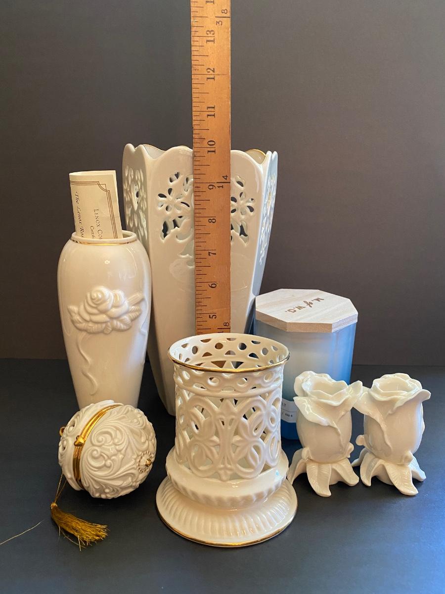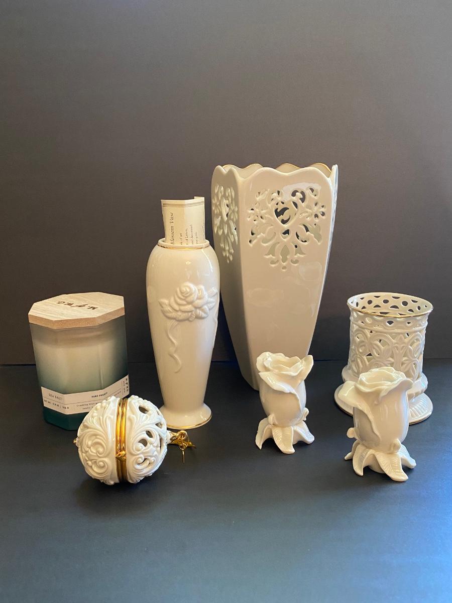 Beautiful lot includes rose bud candle stick holders, two vases in different sizes, tea light holder, ornament and candle. Please see all pictures as they are the best representation of the items. The pictures show condition, measurements if taken, and what is included in the lot. Due to the large amount that we photograph and the time frame, we are not always able to take measurements. All items unless noted, are pre-owned and have been used. If you purchased furniture, you must bring help. We do not allow one person to carry large furniture out on their own. Bring help, tools and a truck for the safety of our client’s homes, and your personal safety. Any damages that result to the property including walls, and floors due to moving of the furniture will be charged to the buyer. Company policy. Thank you.