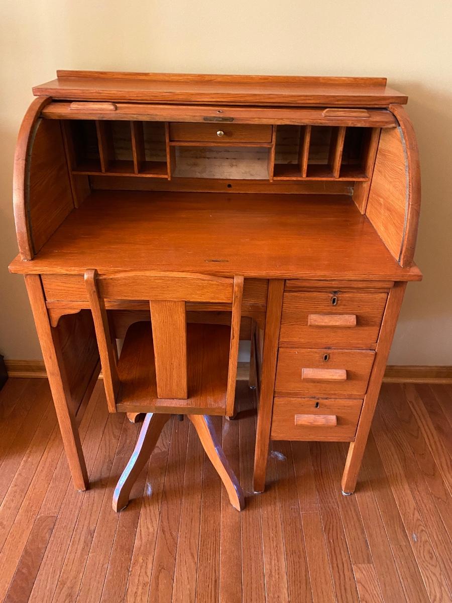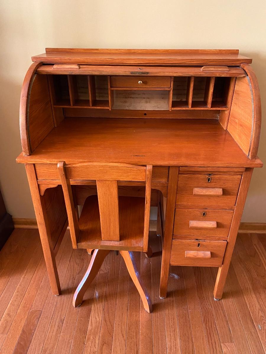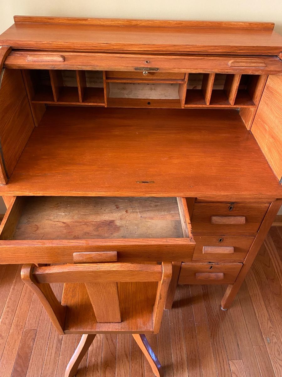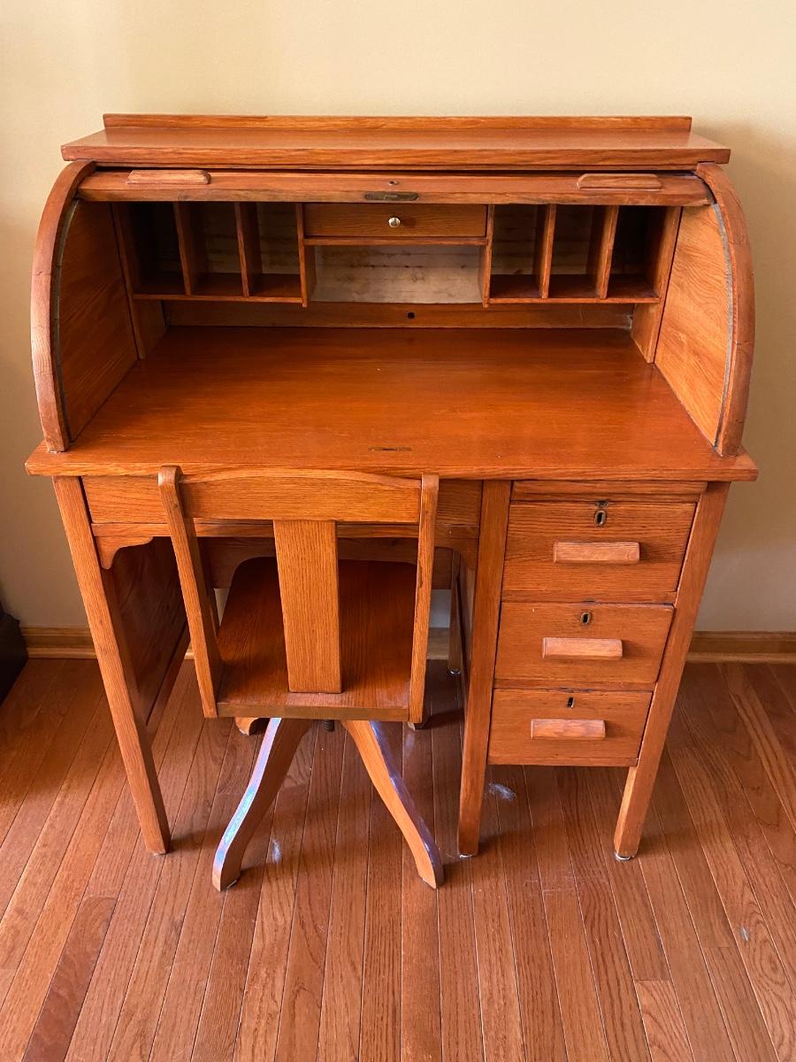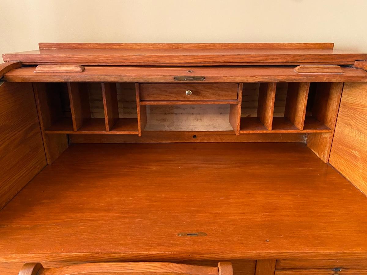 Roll top desk is 42”Hx 35”Lx 21”W. Please see all pictures as they are the best representation of the items. The pictures show condition, measurements if taken, and what is included in the lot. Due to the large amount that we photograph and the time frame, we are not always able to take measurements. All items unless noted, are pre-owned and have been used. If you purchased furniture, you must bring help. We do not allow one person to carry large furniture out on their own. Bring help, tools and a truck for the safety of our client’s homes, and your personal safety. Any damages that result to the property including walls, and floors due to moving of the furniture will be charged to the buyer. Company policy. Thank you.