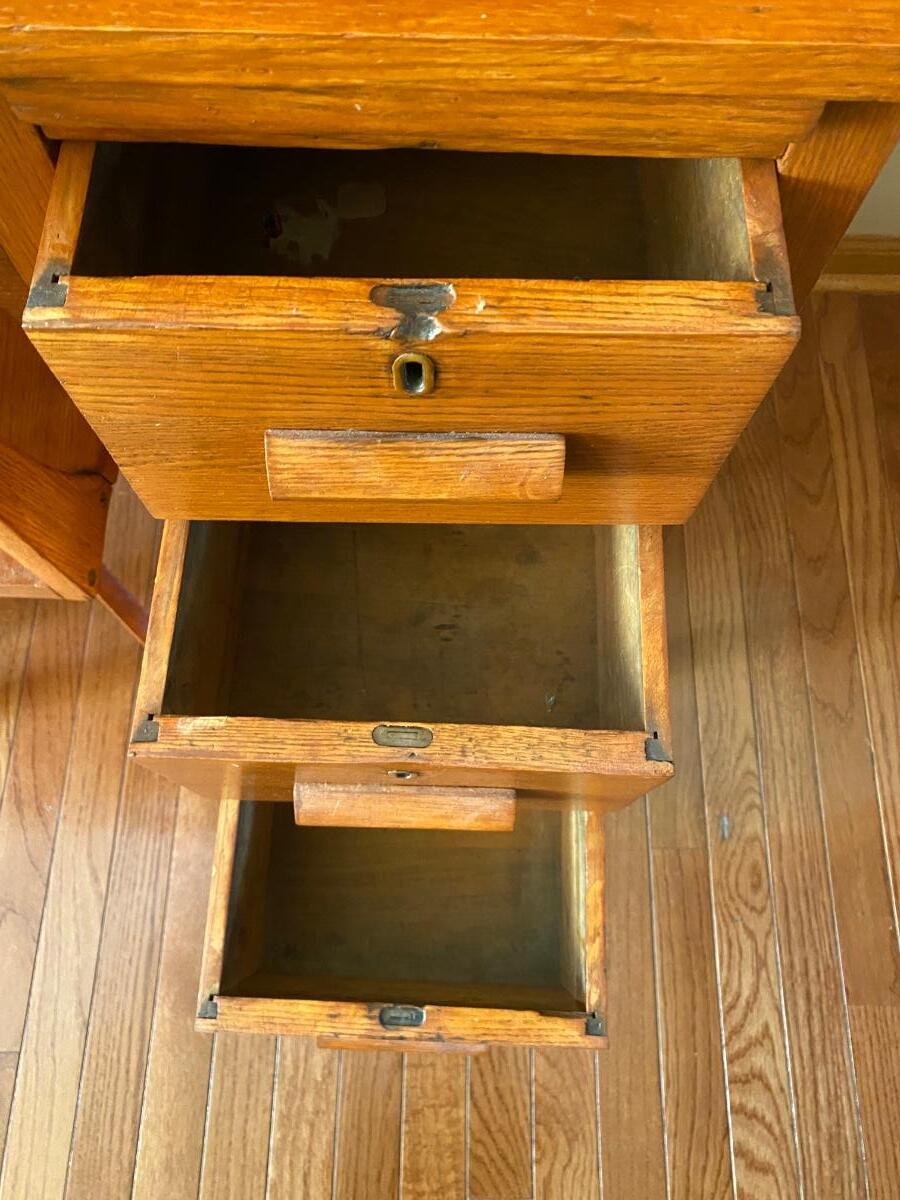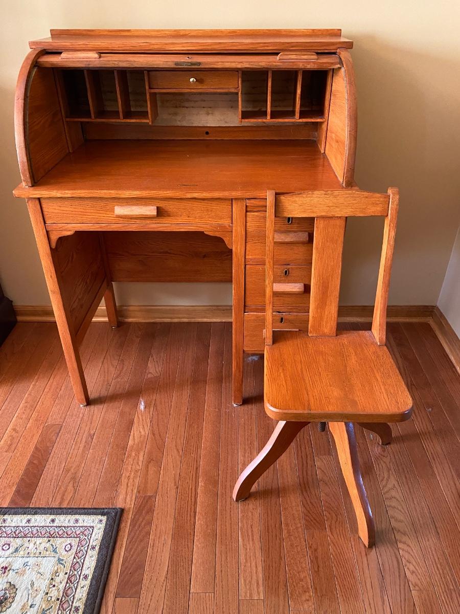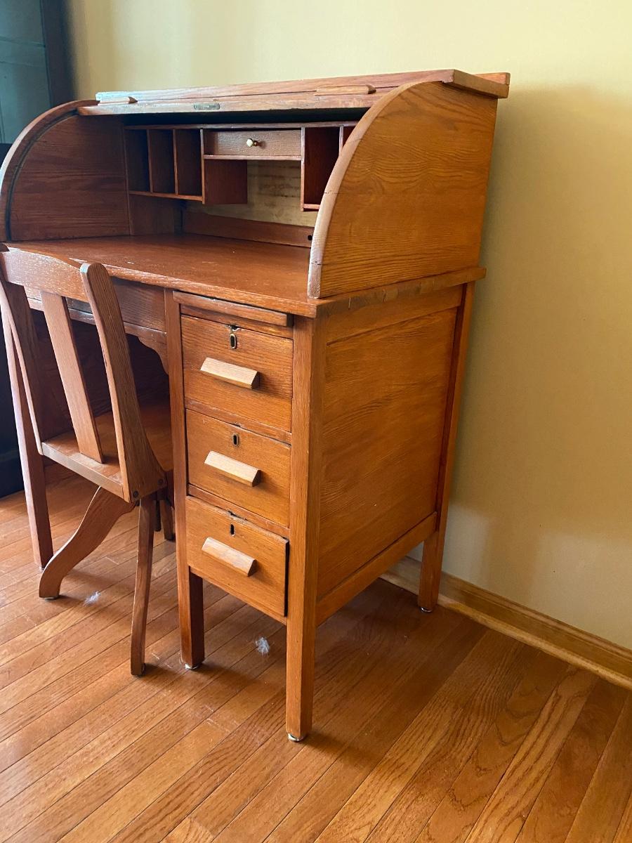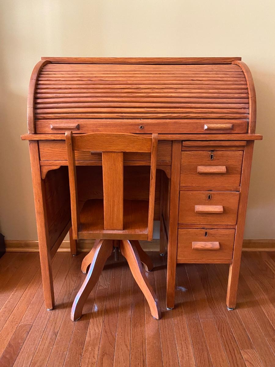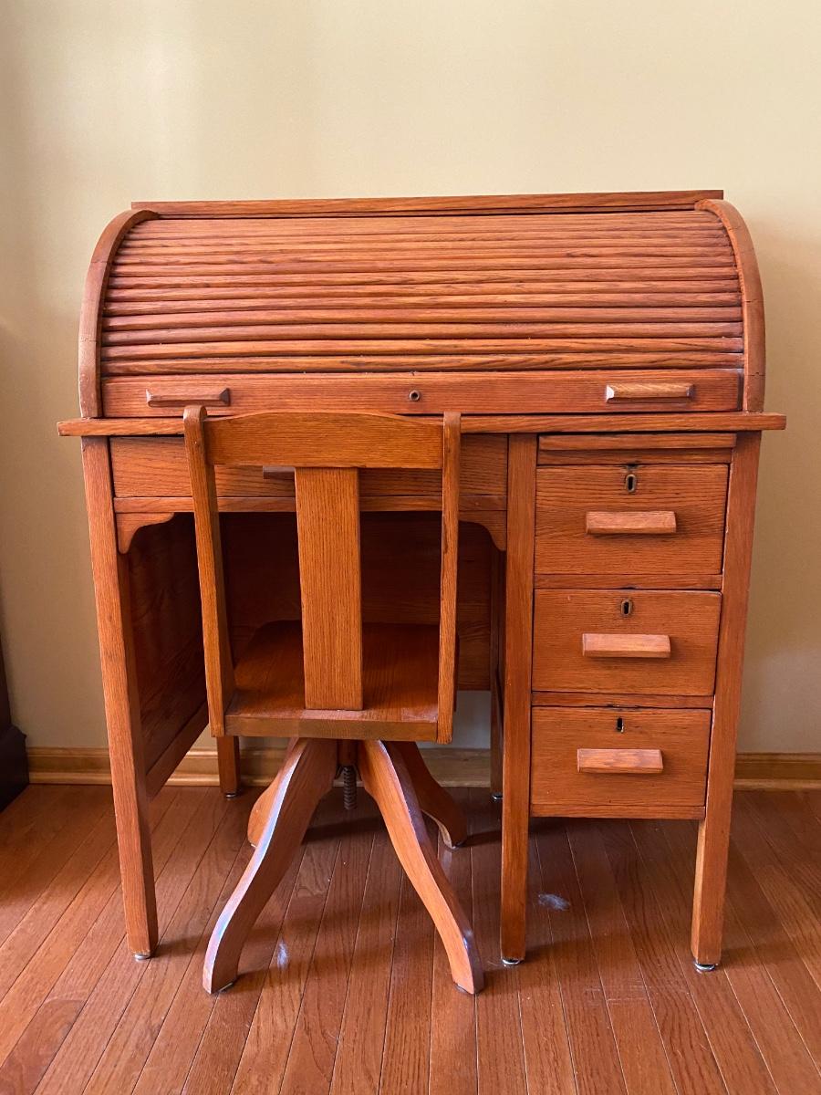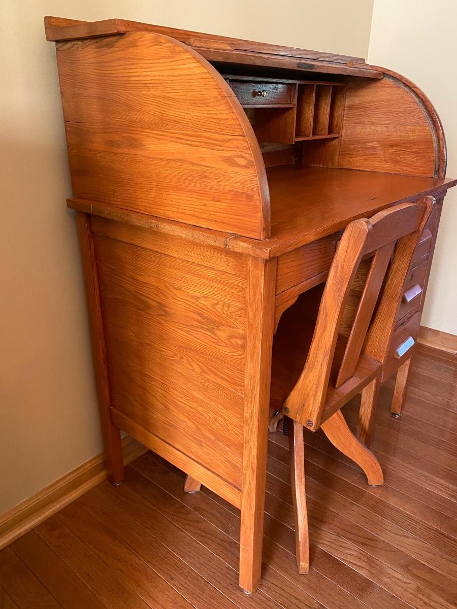 Roll top desk is 42”Hx 35”Lx 21”W. Please see all pictures as they are the best representation of the items. The pictures show condition, measurements if taken, and what is included in the lot. Due to the large amount that we photograph and the time frame, we are not always able to take measurements. All items unless noted, are pre-owned and have been used. If you purchased furniture, you must bring help. We do not allow one person to carry large furniture out on their own. Bring help, tools and a truck for the safety of our client’s homes, and your personal safety. Any damages that result to the property including walls, and floors due to moving of the furniture will be charged to the buyer. Company policy. Thank you.