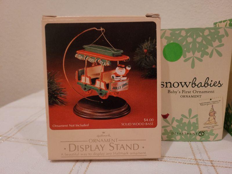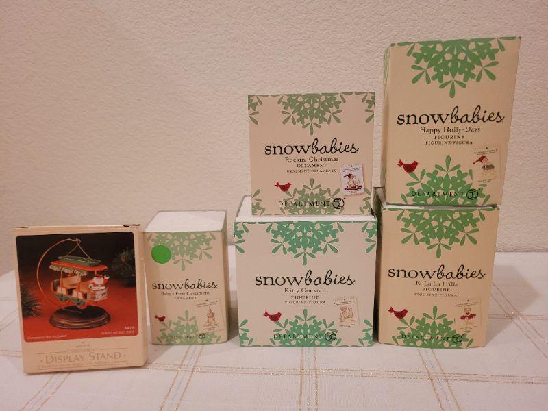 Lot 717: Assorted Dept 56 Snowbabies Christmas Figures + Ornament Stand