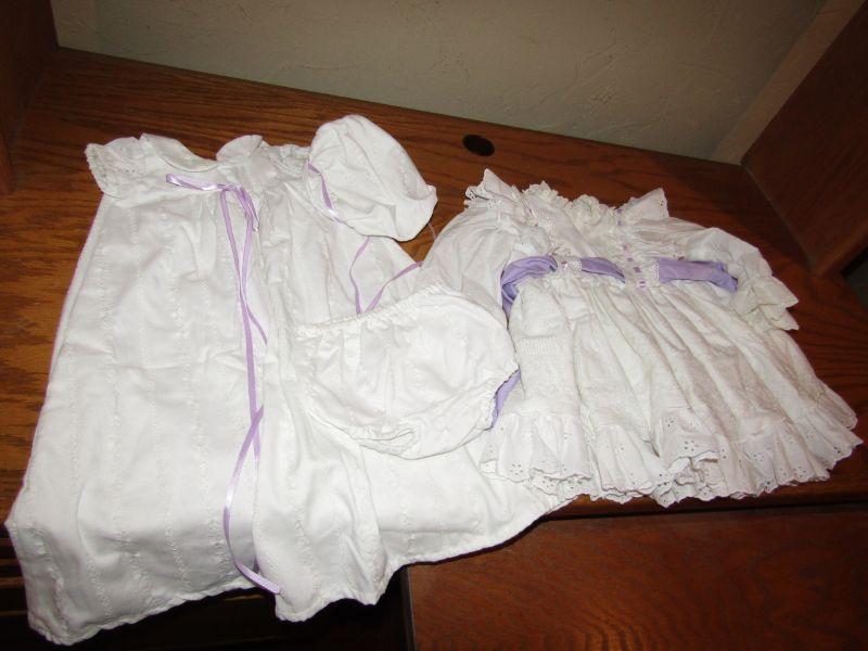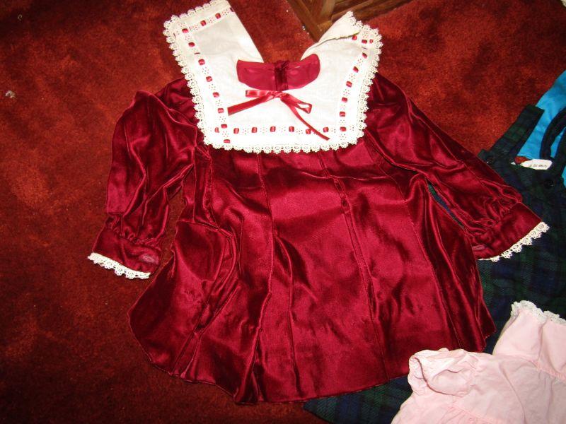ALL EXCEPT 1 OUTFIT APPEAR TO BE MADE BY HAND AND MADE VERY WELL. THE LARGEST IS A SIZE 5 THE OTHERS DO NOT HAVE TAGS SINCE HANDMADE BUT ARE SMALLER THAN THE SIZE 5