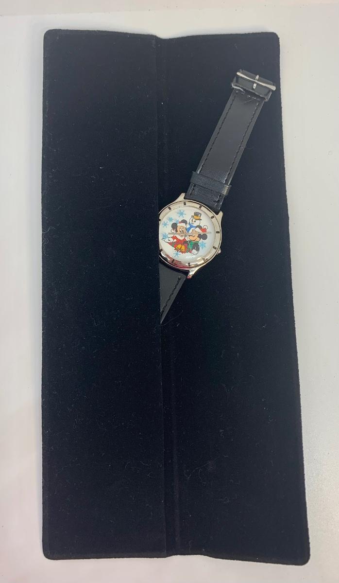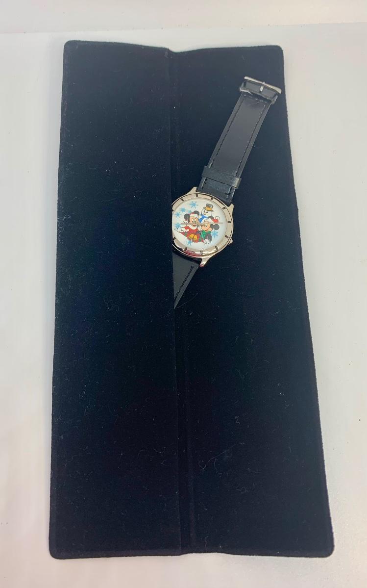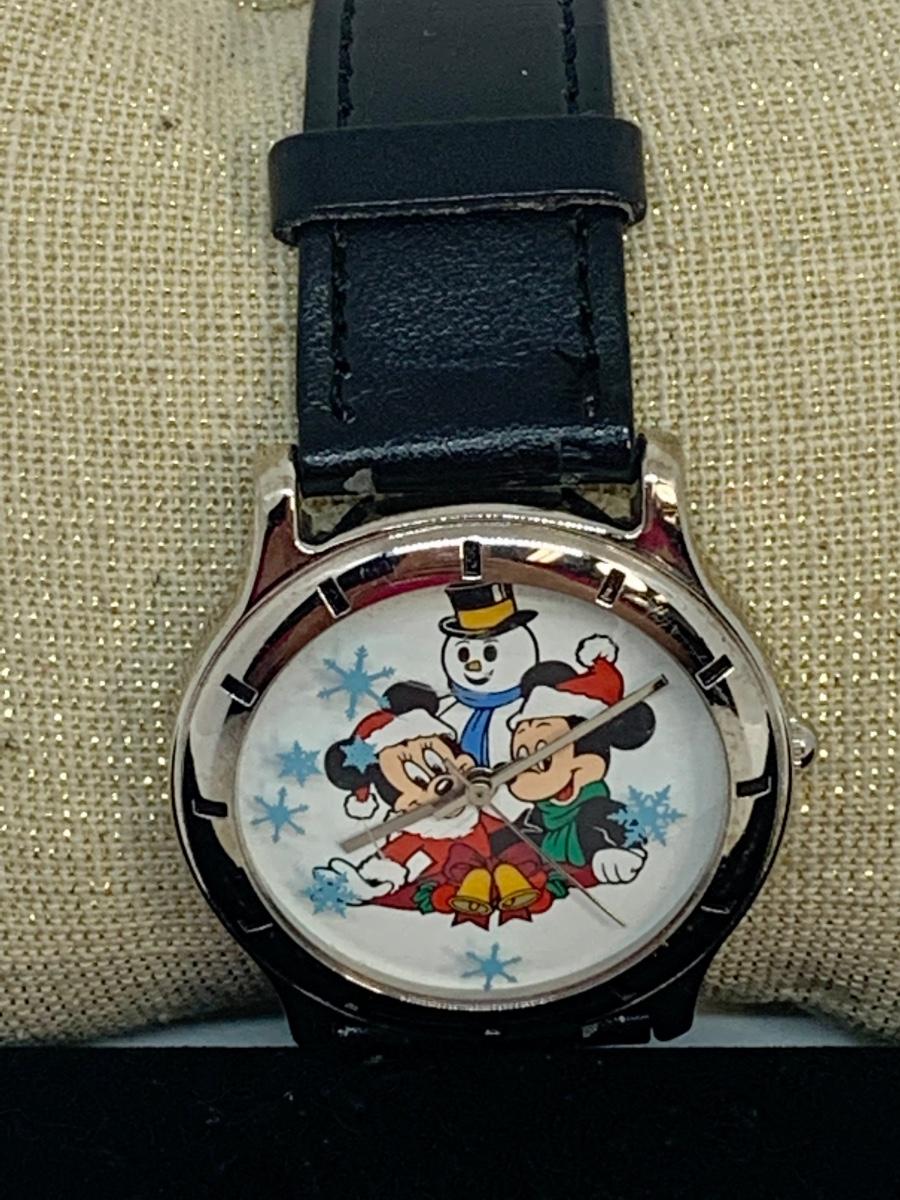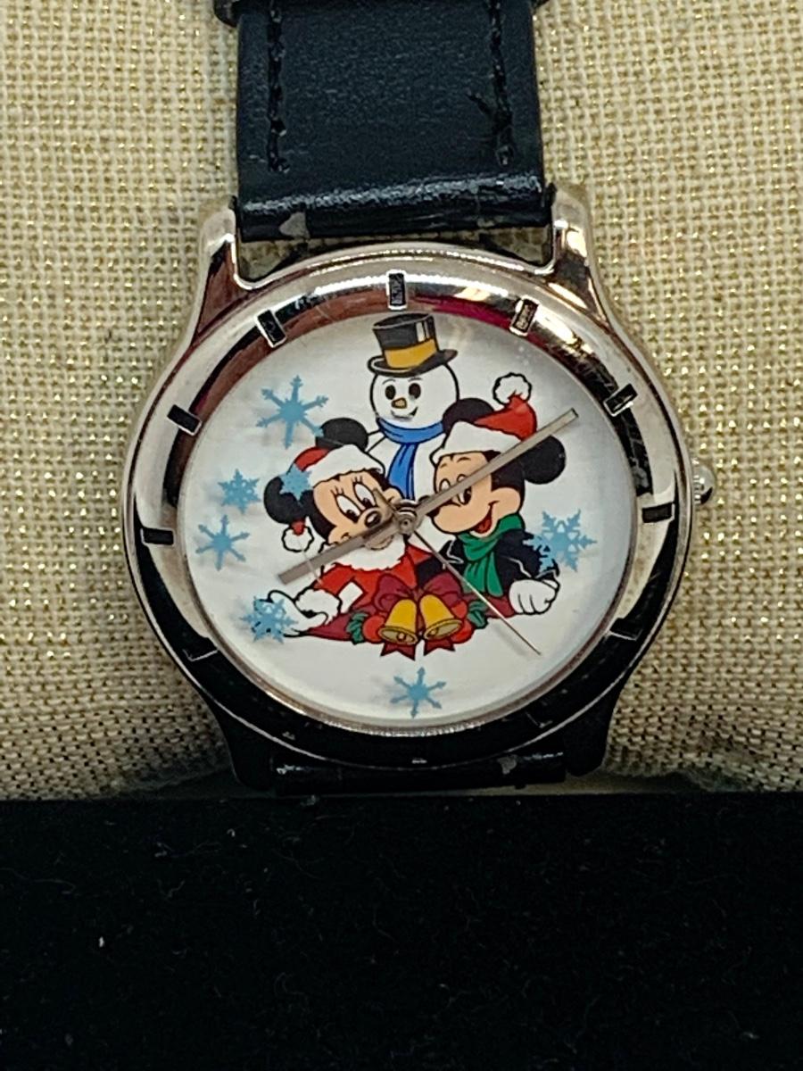 Cast Holiday Celebration watch featuring Minnie & Mickey Mouse along with Frosty with a black leather band. Untested