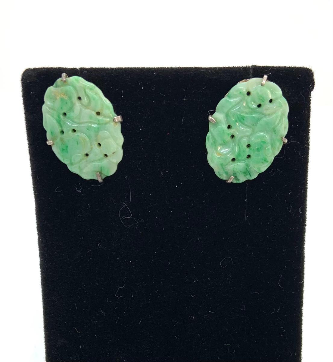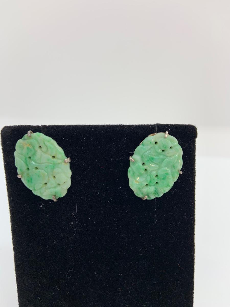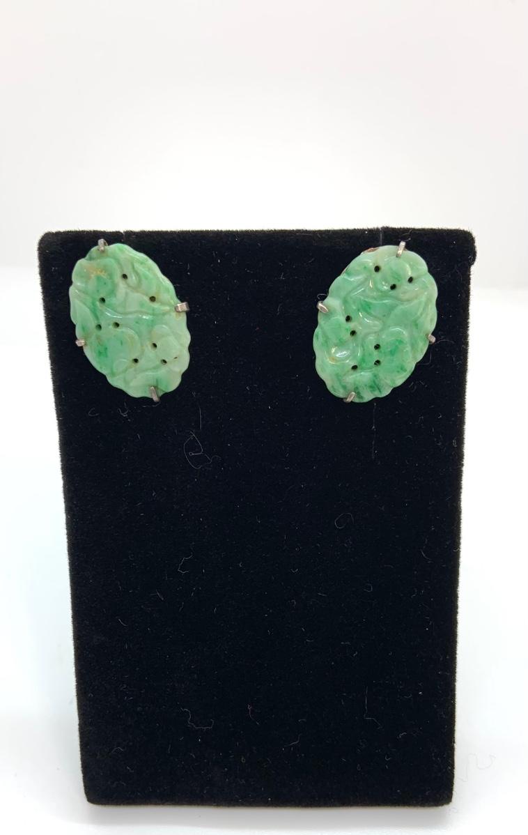 LOT:10: Carved Oval Green Jade Pierced Vintage Earrings stamped sterling