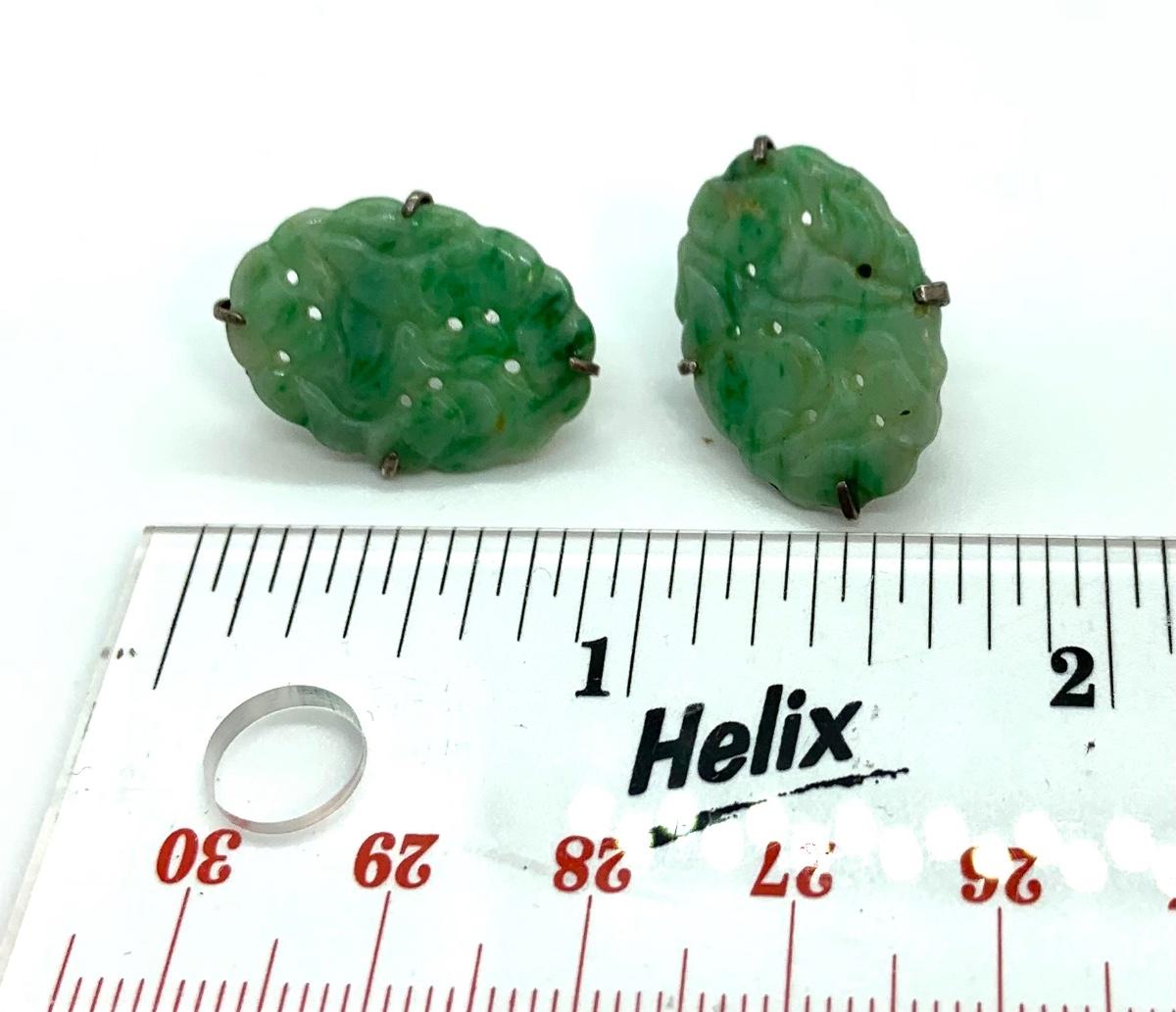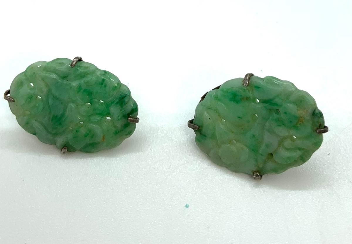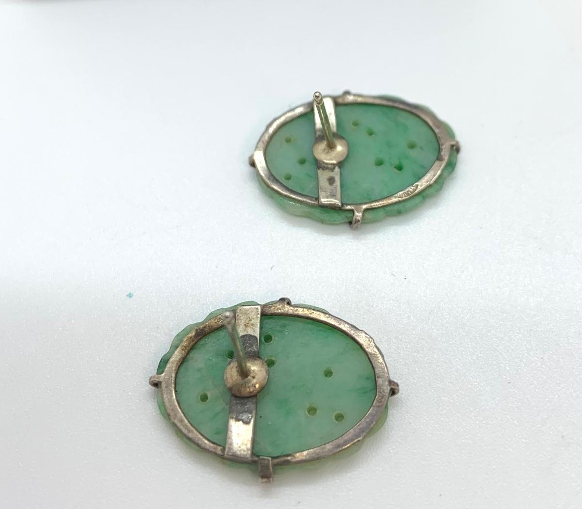 LOT:10: Carved Oval Green Jade Pierced Vintage Earrings stamped sterling