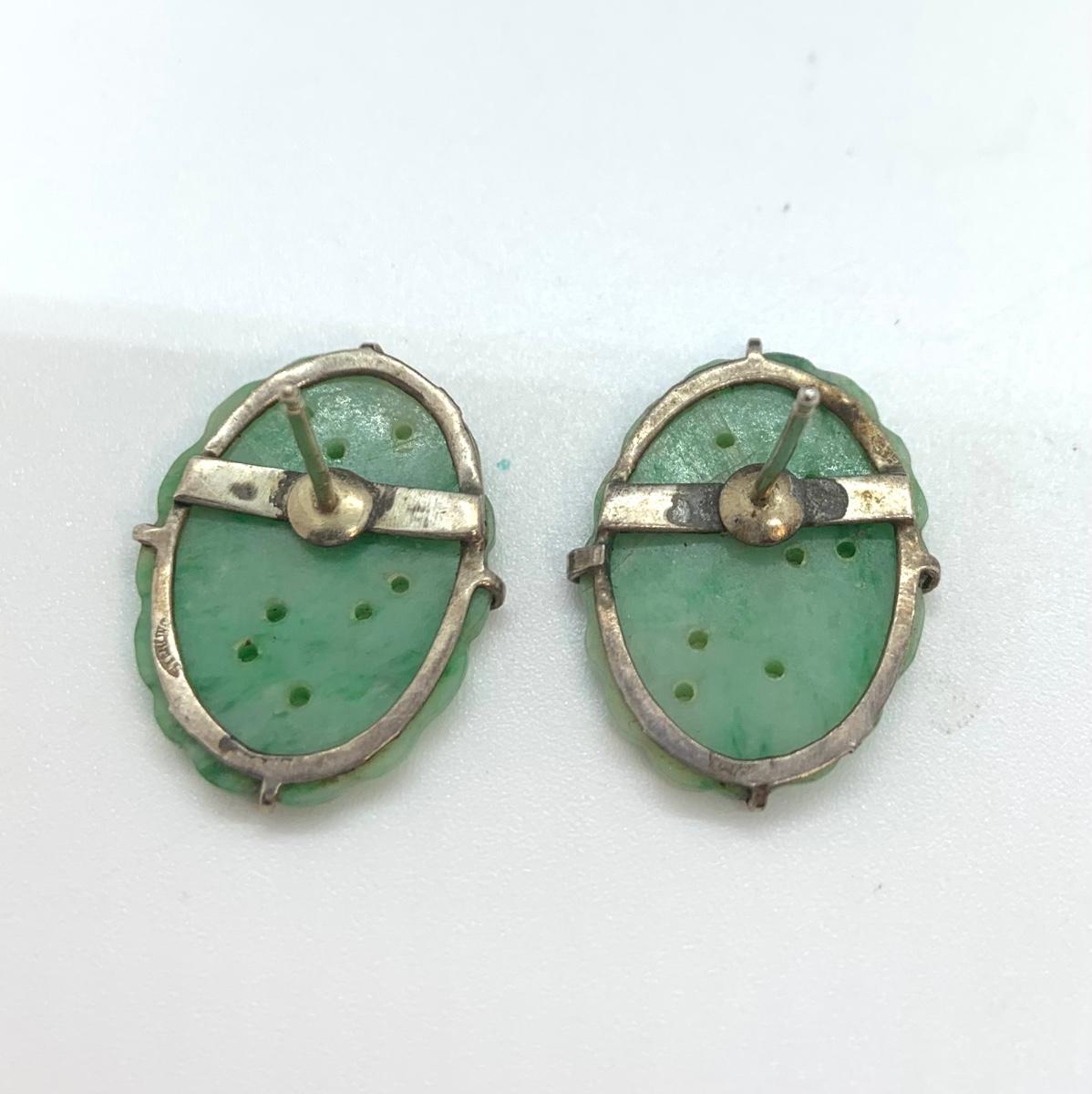 LOT:10: Vintage Carved Oval Green Jade Pierced Earrings stamped sterling