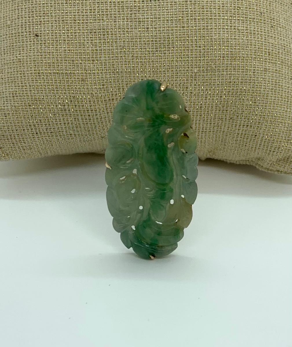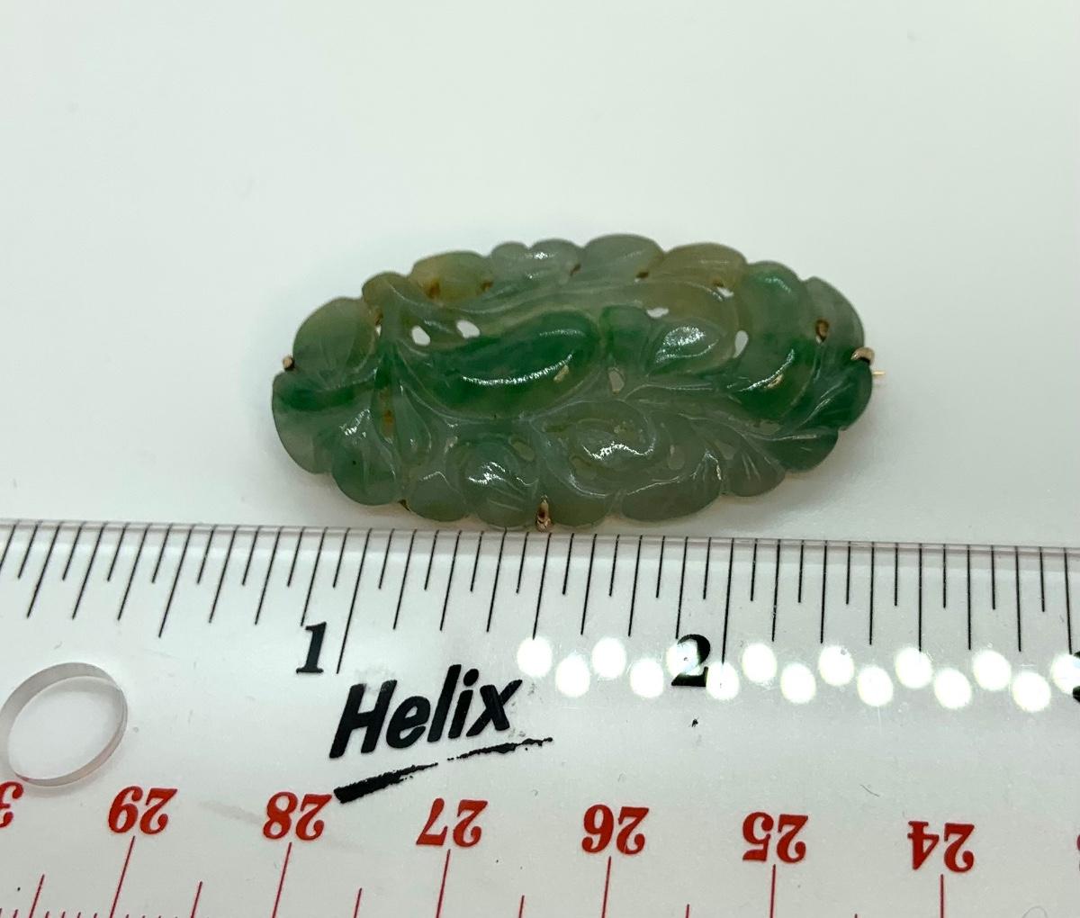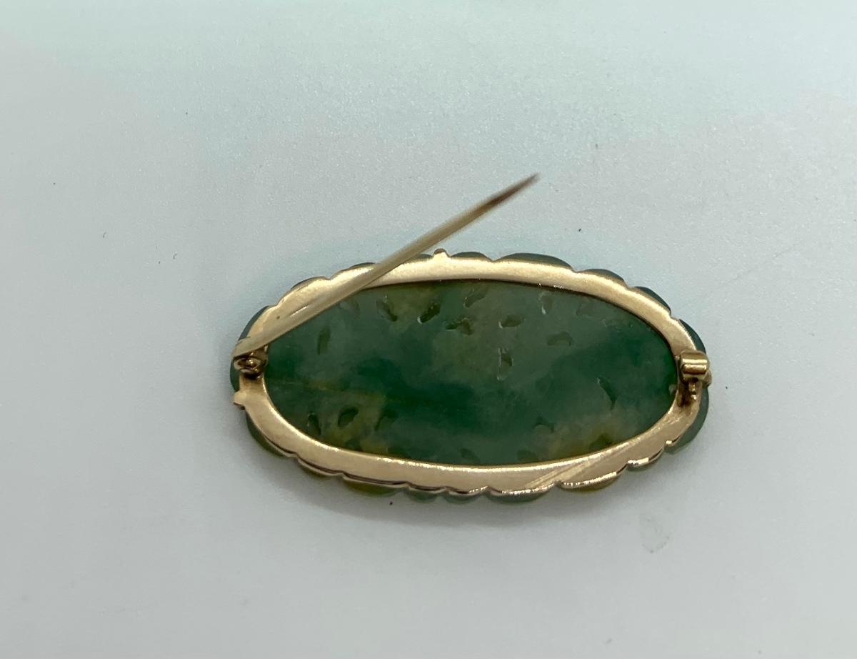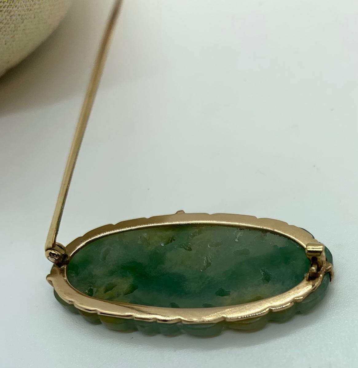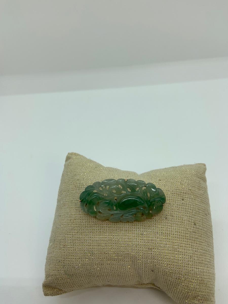 LOT:11: Vtg. 14k acid tested Green Jade Brooch/Pin Please see all pictures as they are the best representation of the items. The pictures show condition, measurements if taken, and what is included in the lot. Due to the large amount that we photograph and the time frame, we are not always able to take measurements. All items unless noted, are pre-owned and have been used. If you purchased furniture, you must bring help. We do not allow one person to carry large furniture out on their own. Bring help, tools and a truck for the safety of our client’s homes, and your personal safety. Any damages that result to the property including walls, and floors due to moving of the furniture will be charged to the buyer. Company policy. Thank you.