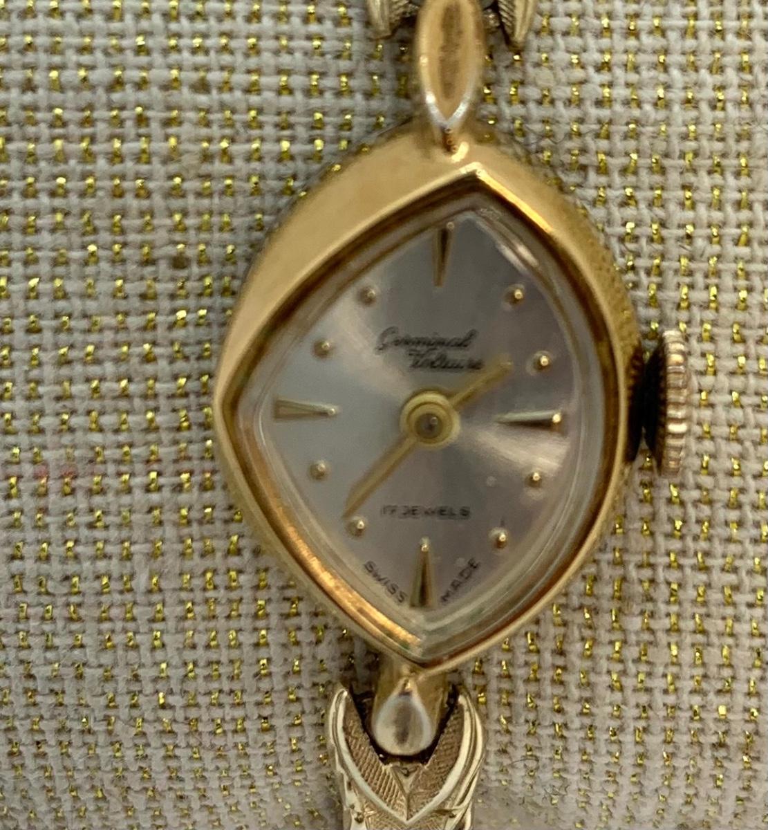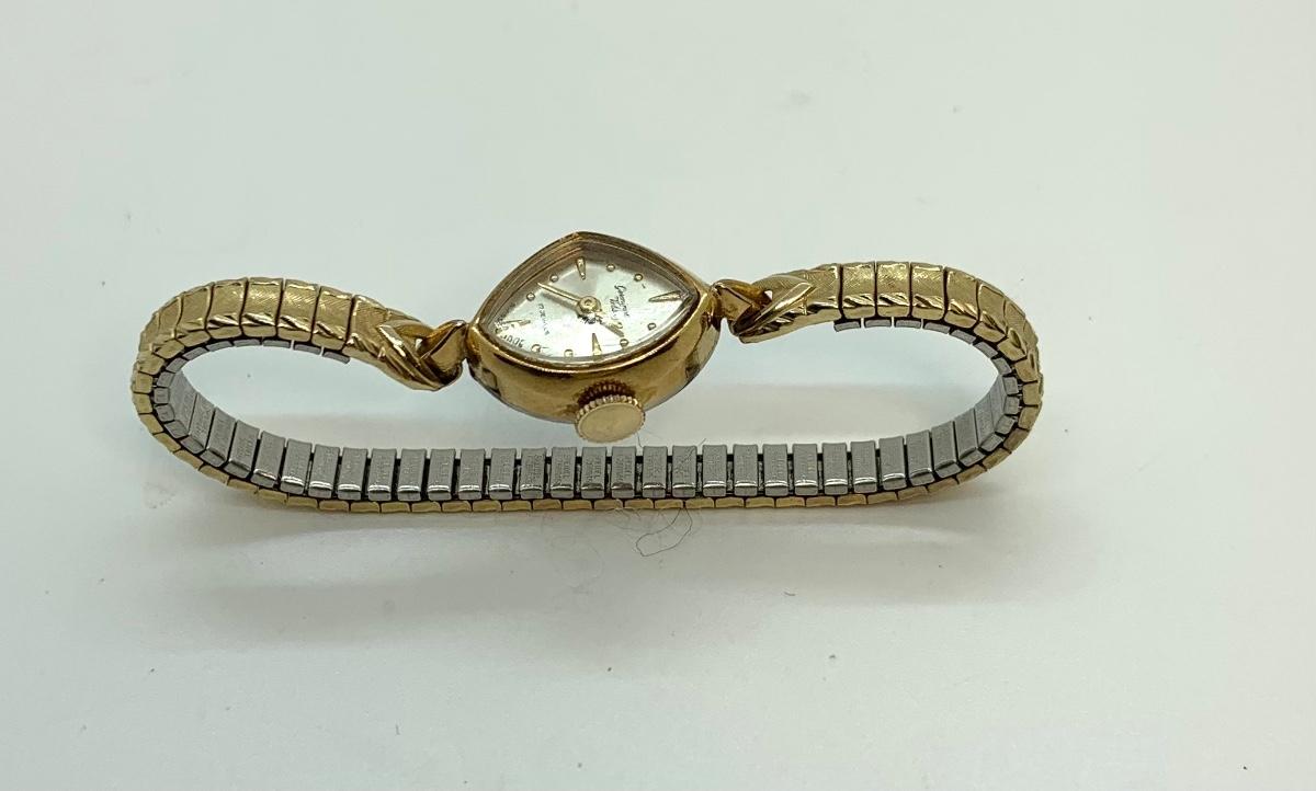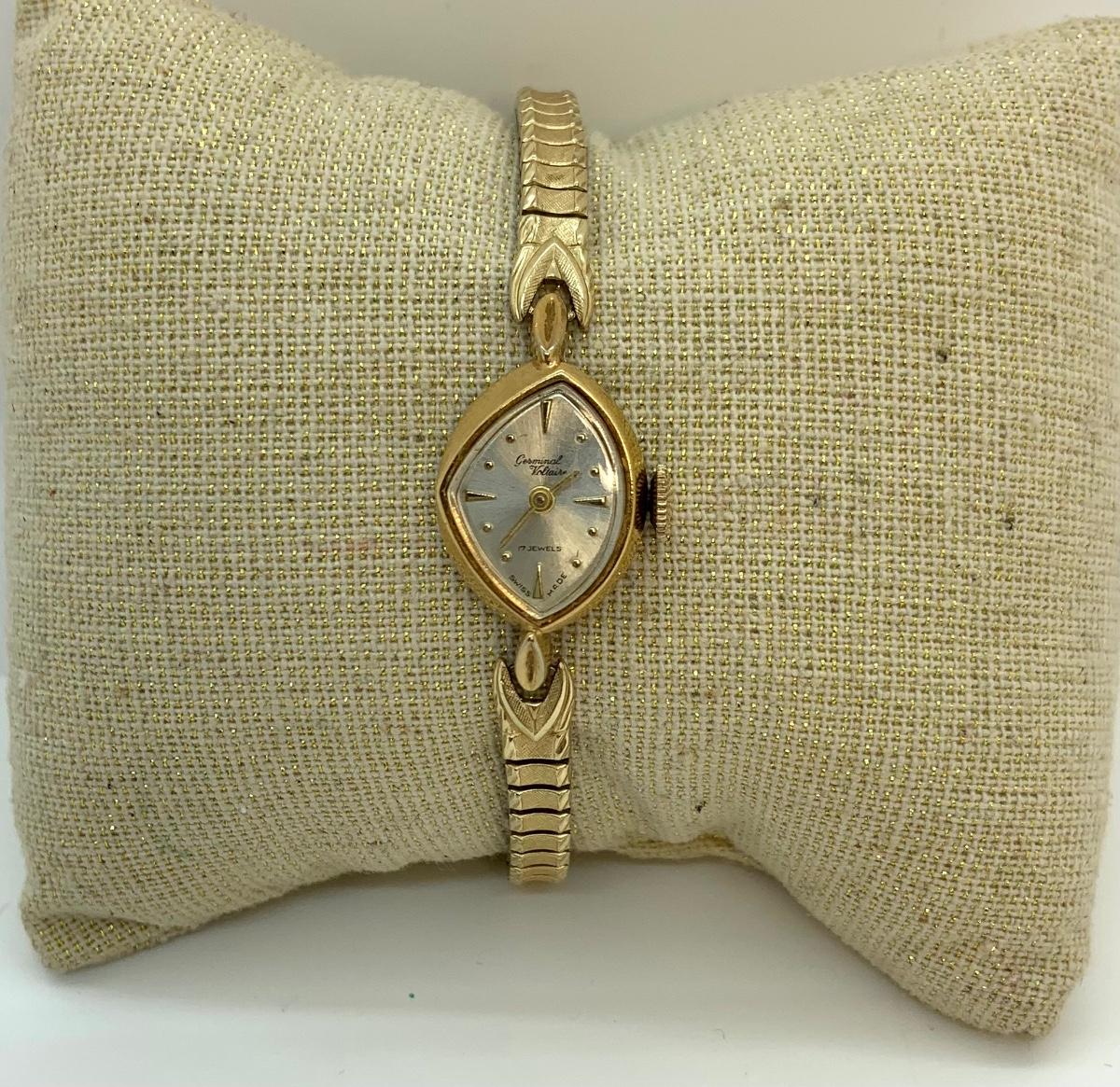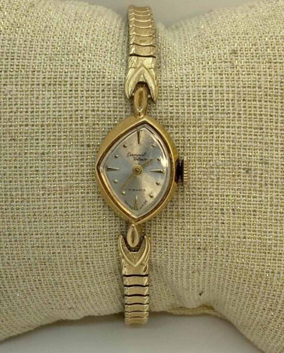 LOT:13: Antique Germinal Voltaire 17 Jewel Lady’S Gold-tone stretch band Wristwatch