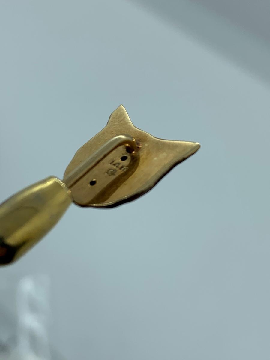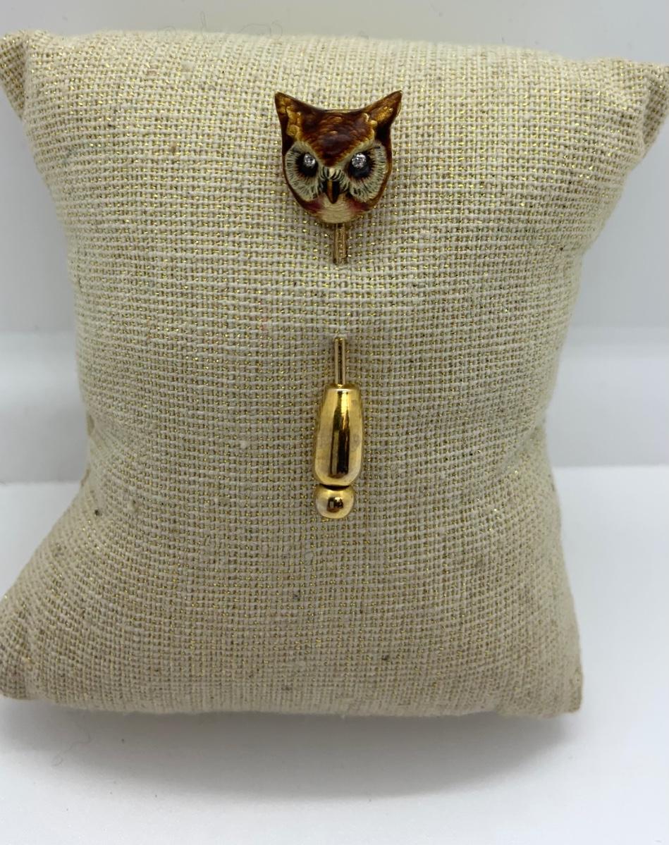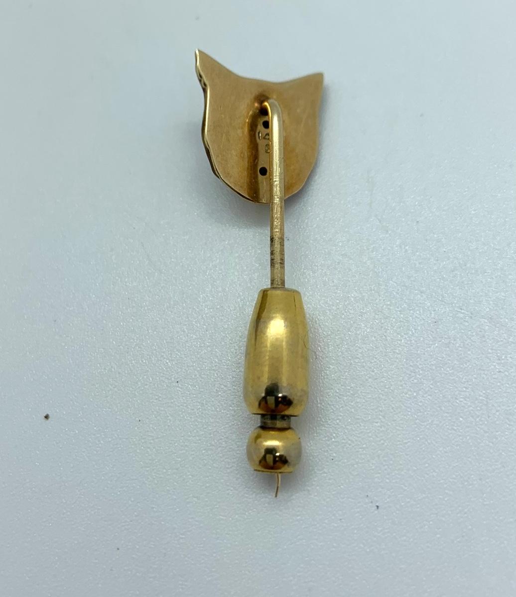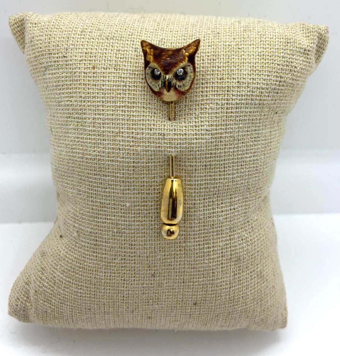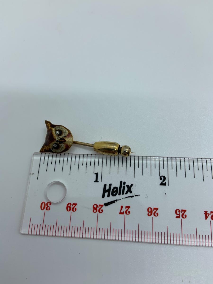 LOT:15: 14k Gold Brown Enamel  Owl Face Stick Pin with Diamond Chip eyes