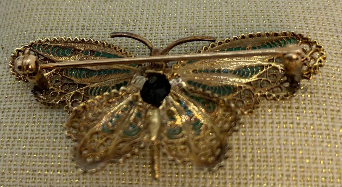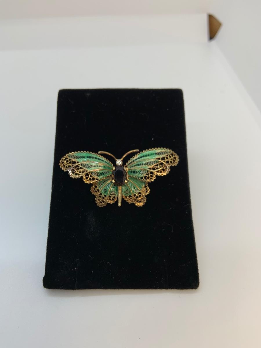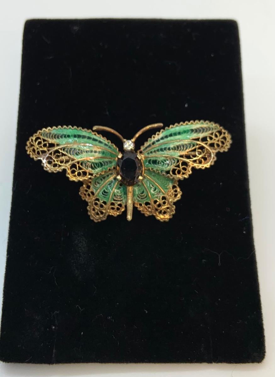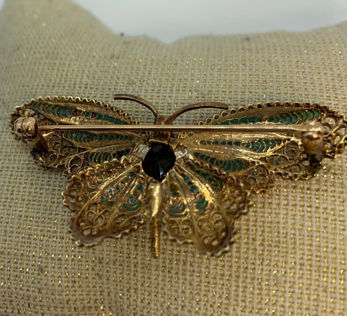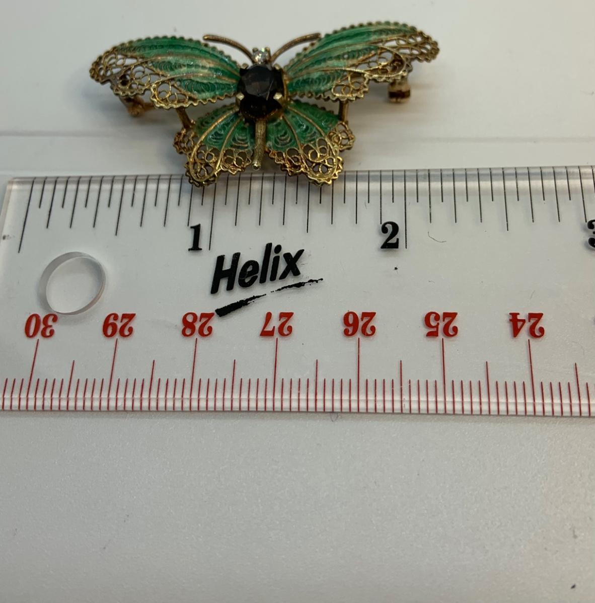 LOT:26: Vintage 14k Gold Green Enamel Butterfly with Smokey Topaz & Real Diamond chips