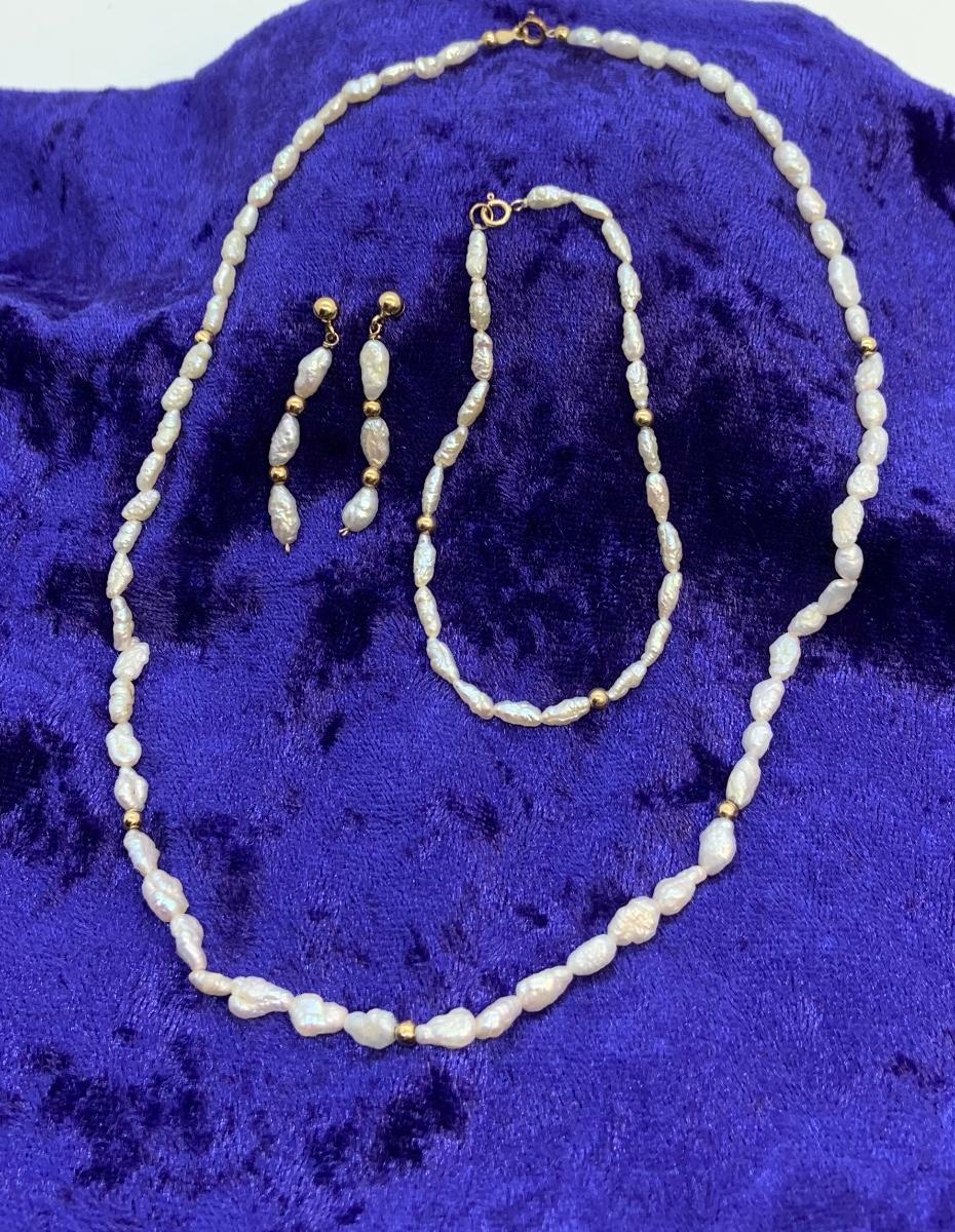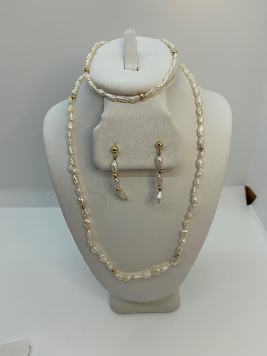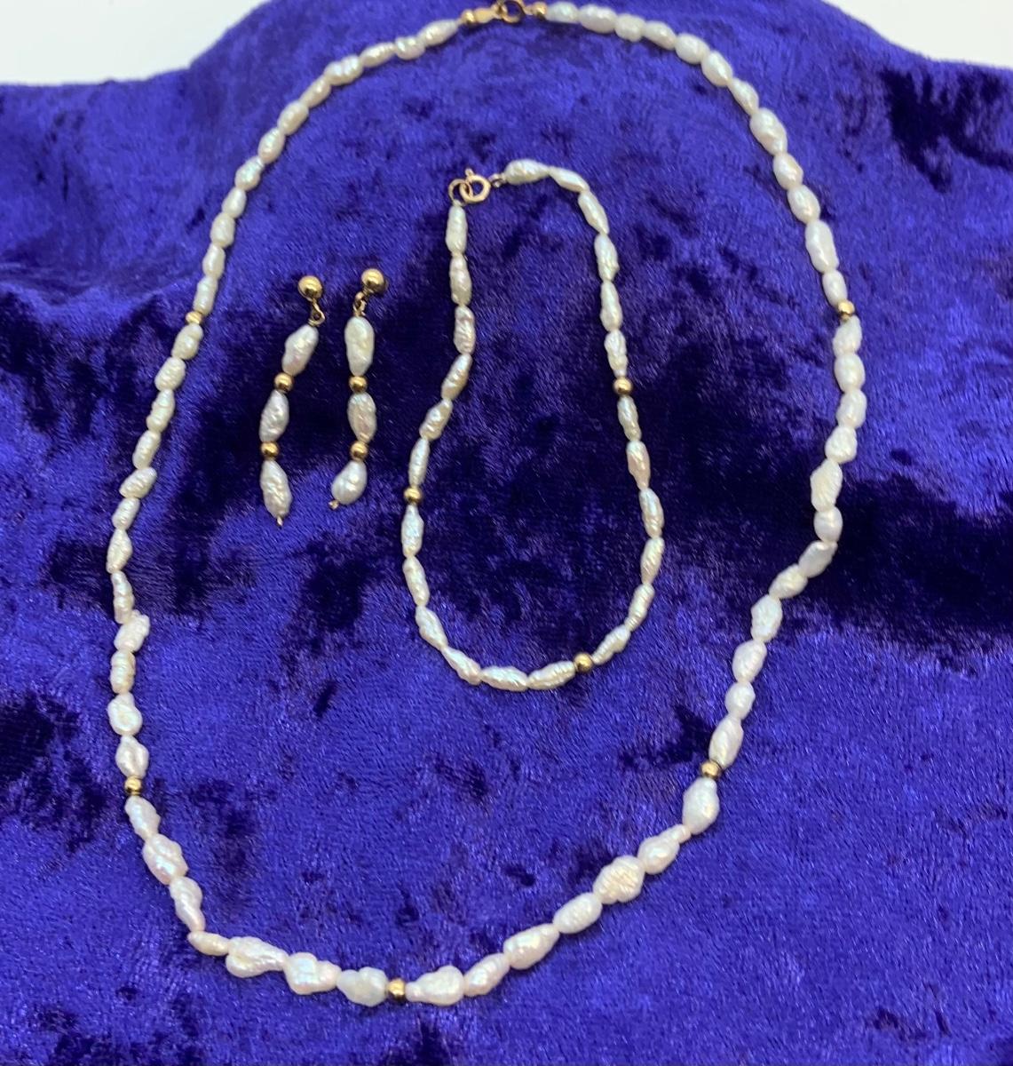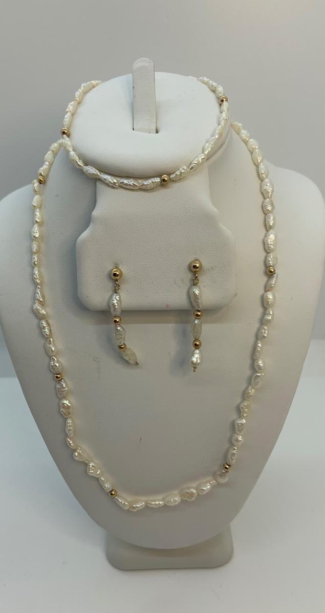 LOT:35: 14k Freshwater Pearl Necklace, Bracelet and pierced earring set