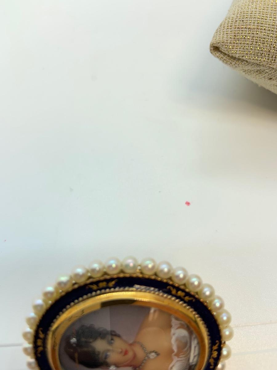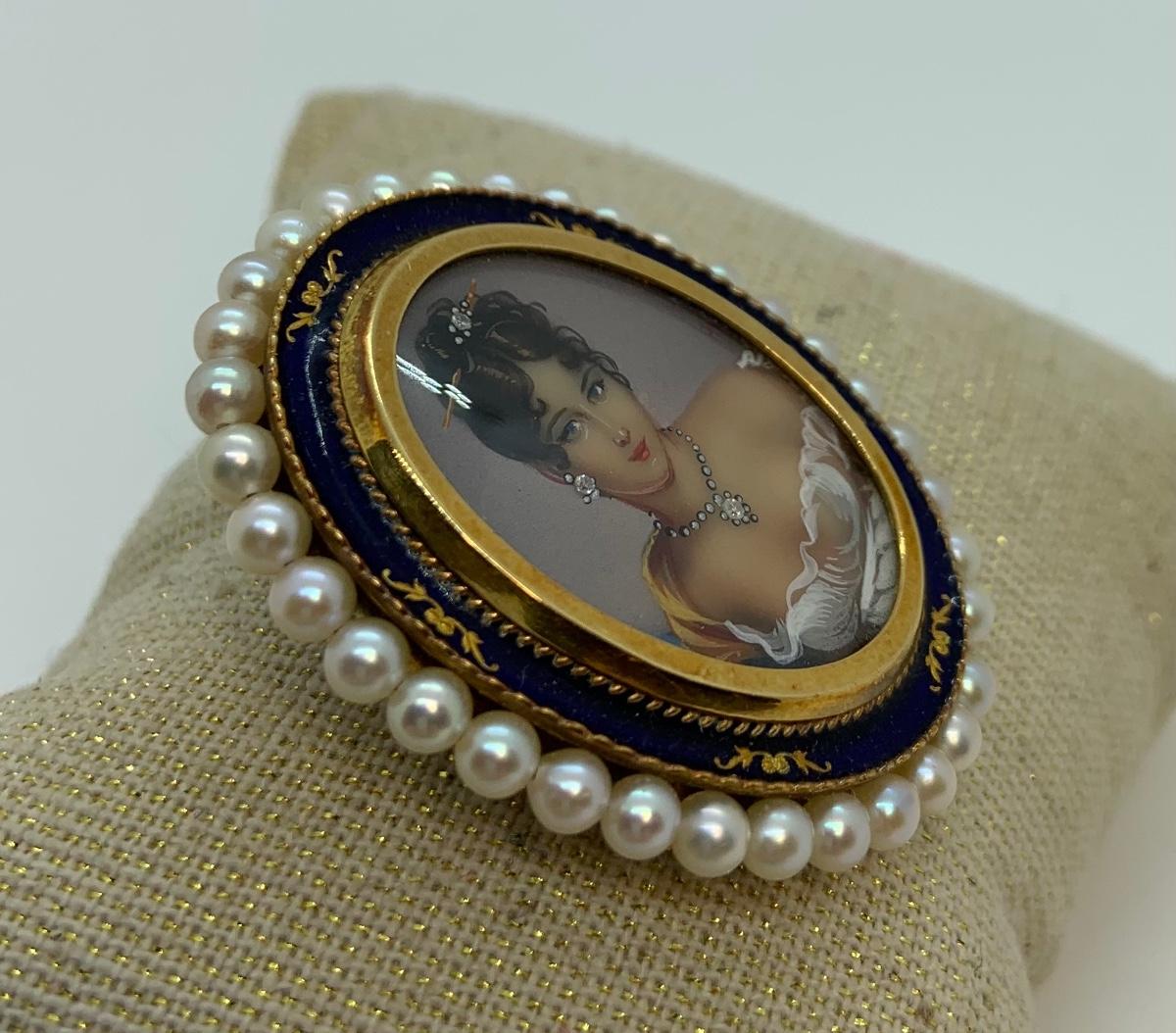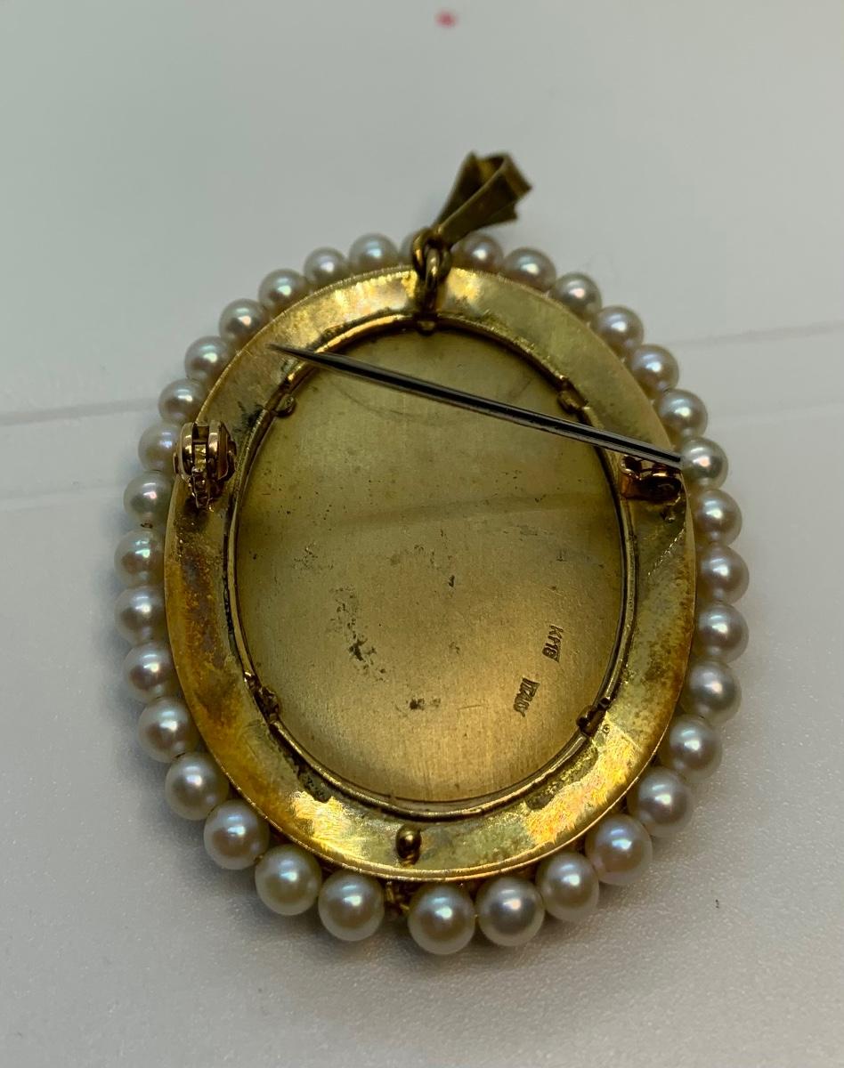 LOT:43: Vintage 18k Italy Pearl and Enamel Cameo Brooch with Diamond Chips