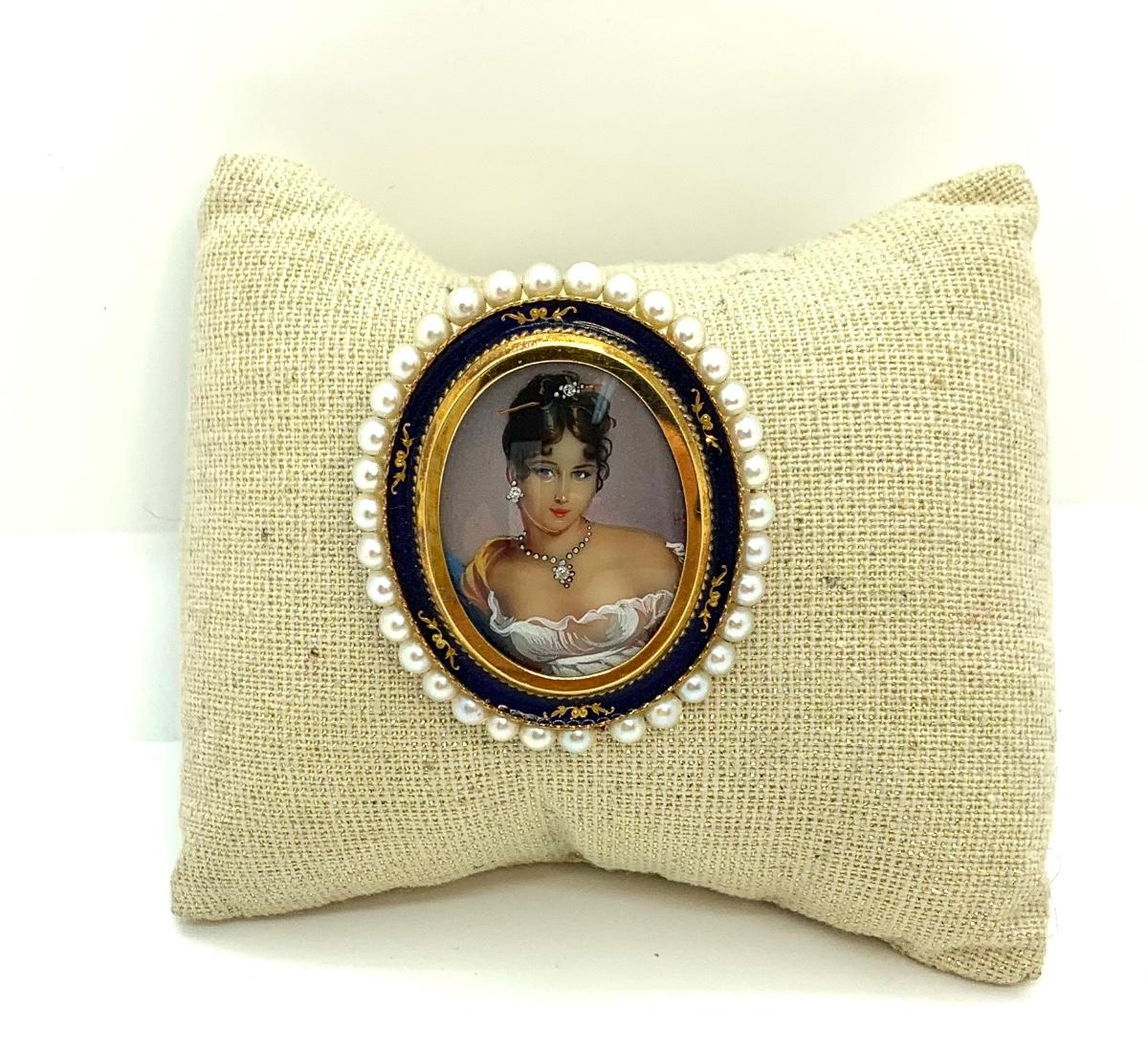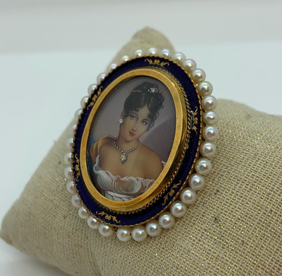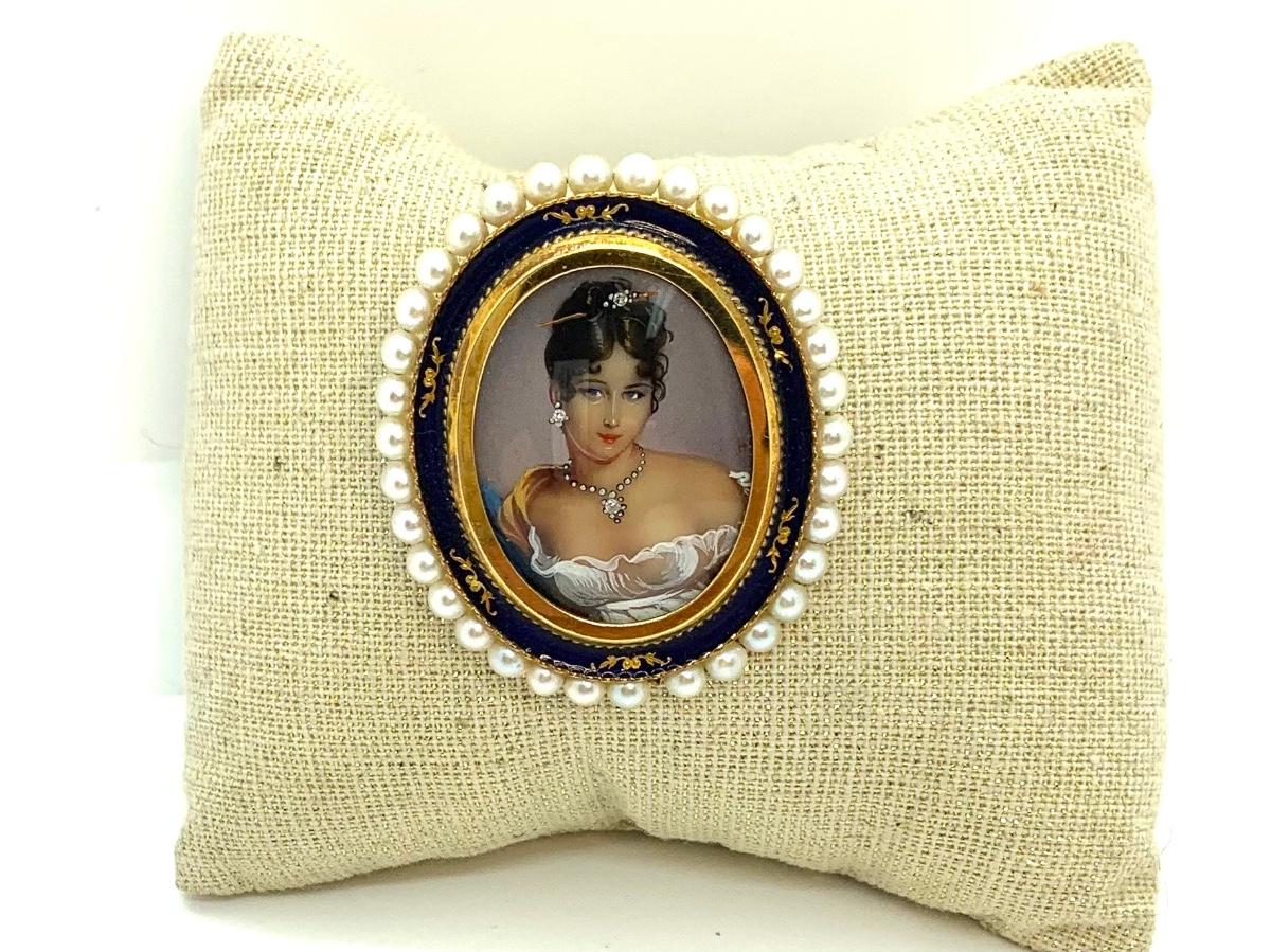 LOT:43: Vintage 18k Italy Pearl and Enamel Cameo Brooch with Diamond Chips