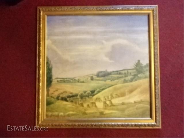 LOT 71A: LARGE WATERCOLOR PAINTING, PASTORAL LANDSCAPE, SIGNED LOWER RIGHT (ILLEGIBLE), GOOD CONDITION WITH SOME AGING DISCOLORATION, FRAMED SIZE 33.5" X 33.5", SKU265.04