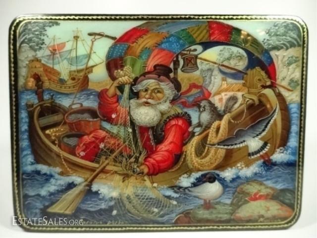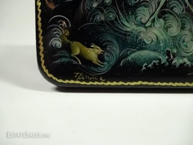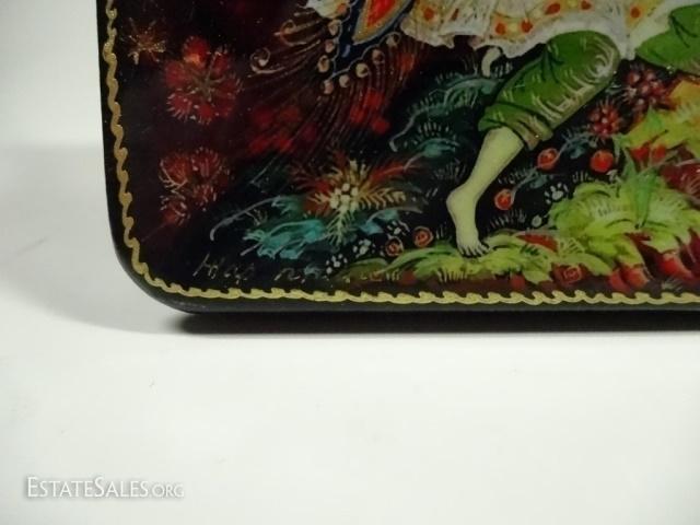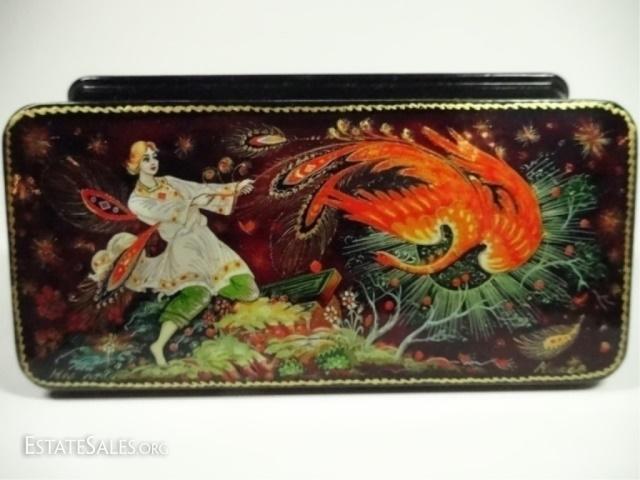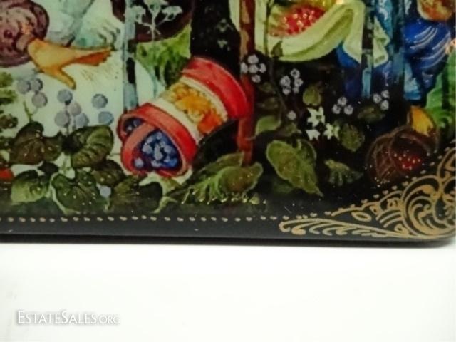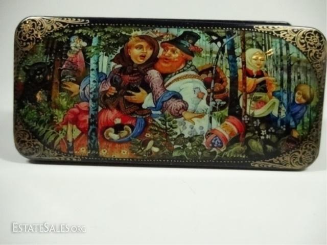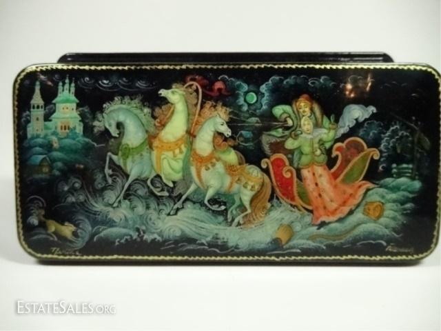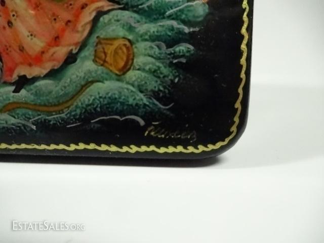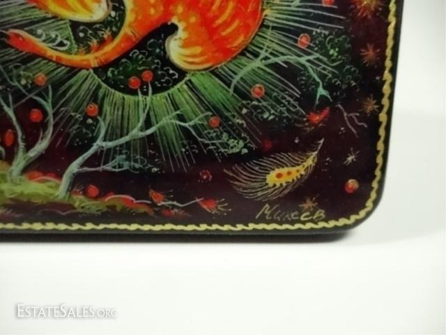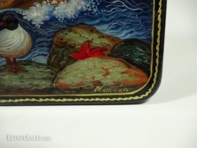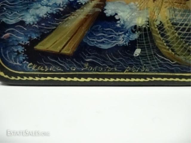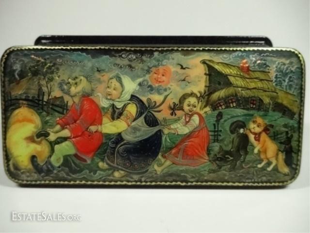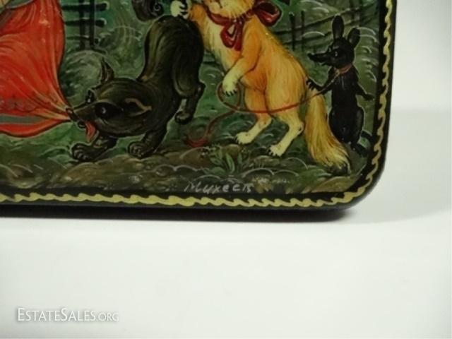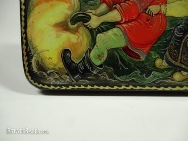 LOT 71C: 5 PC RUSSIAN HAND PAINTED LACQUERED BOXES, ARTIST SIGNED, EXCELLENT CONDITION, APPROX 4 3/8' X 6" X 1 3/8" & 5 1/2" X 2 1/2" X 1 3/8", SKU203.05 H150